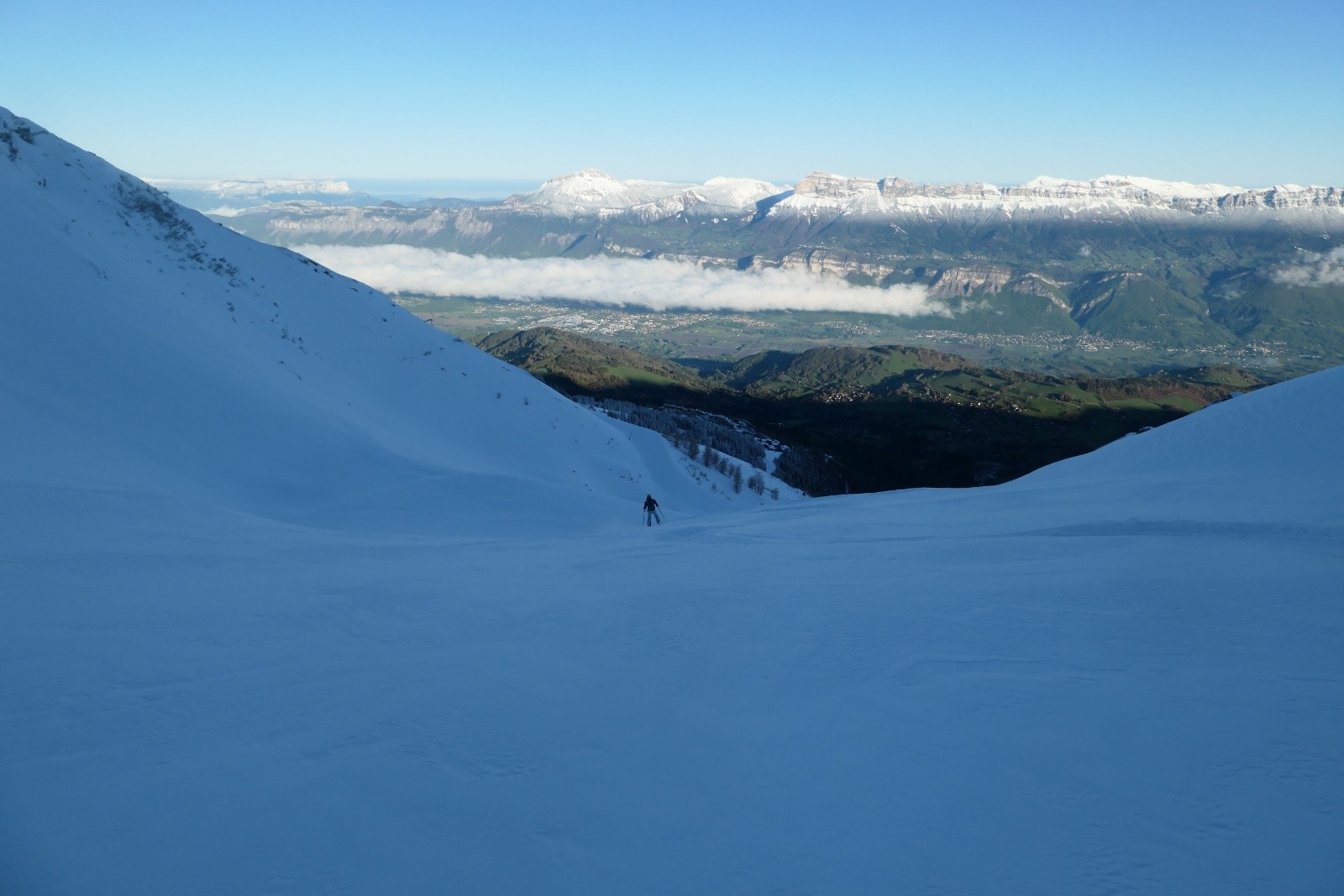- De 2100 à 1800m : 10cm de neige très légère sur un fond crouté/humide. Avec les skis larges, nous ne sommes pas passés à travers et le ski était très bon - Peut-être pas la même avec des allumettes. Ski 4*
