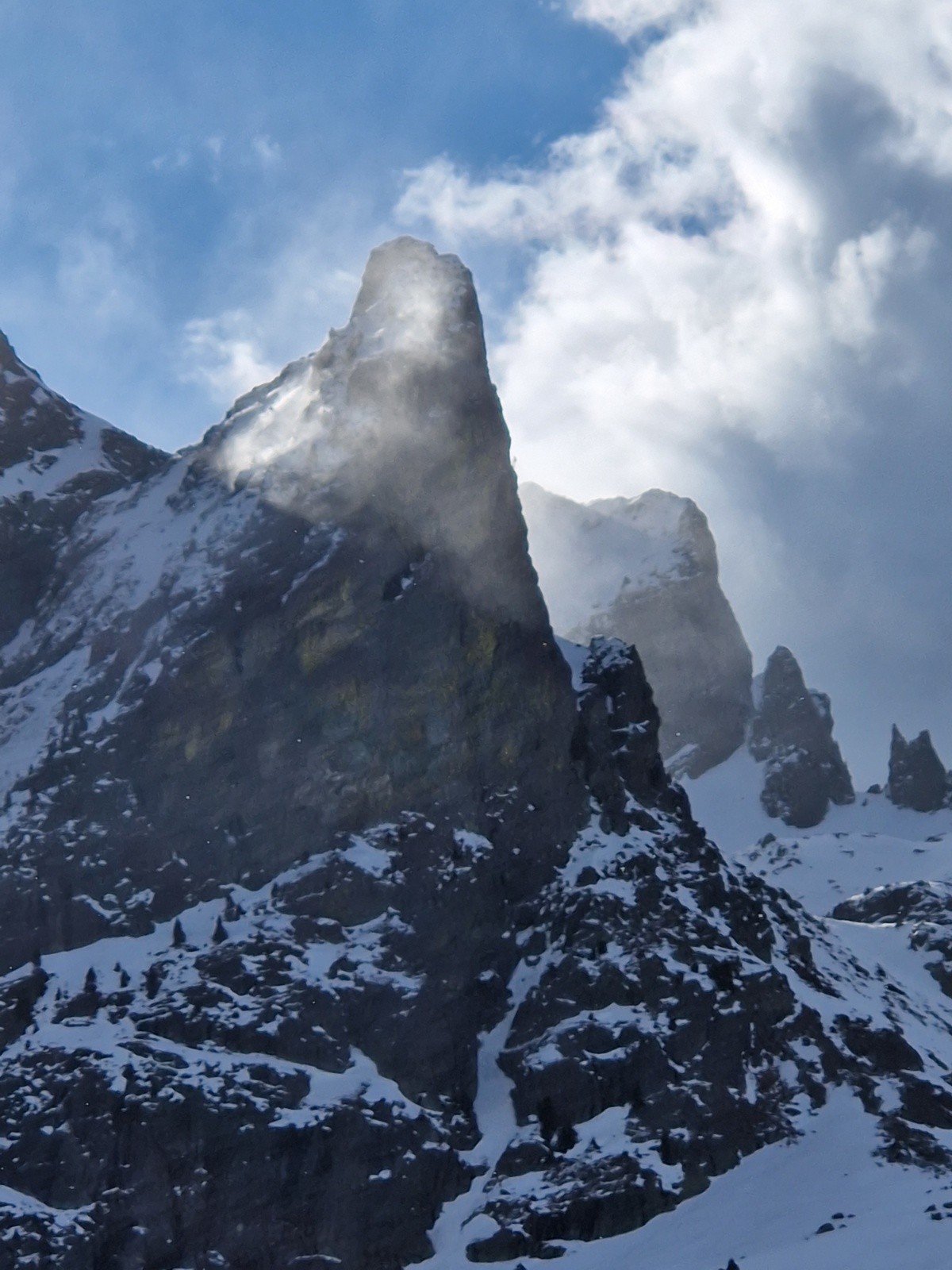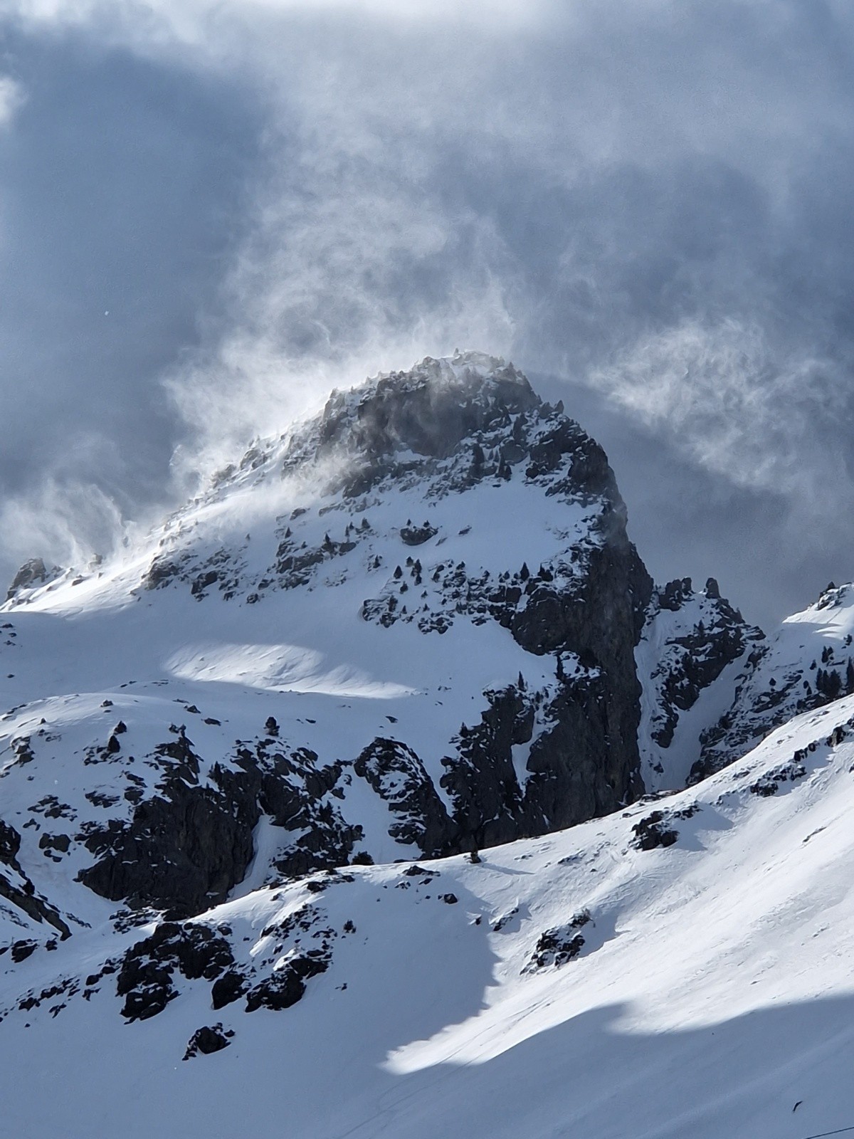 Venu pour prendre l'air car impératif horaire, et bien j'ai pris l'air, ventillo là haut avec de très fortes rafales de sud. Je me doutais que la neige serait médiocre, avec cette neige récente mais n'ayant pas encore assez de tassement...