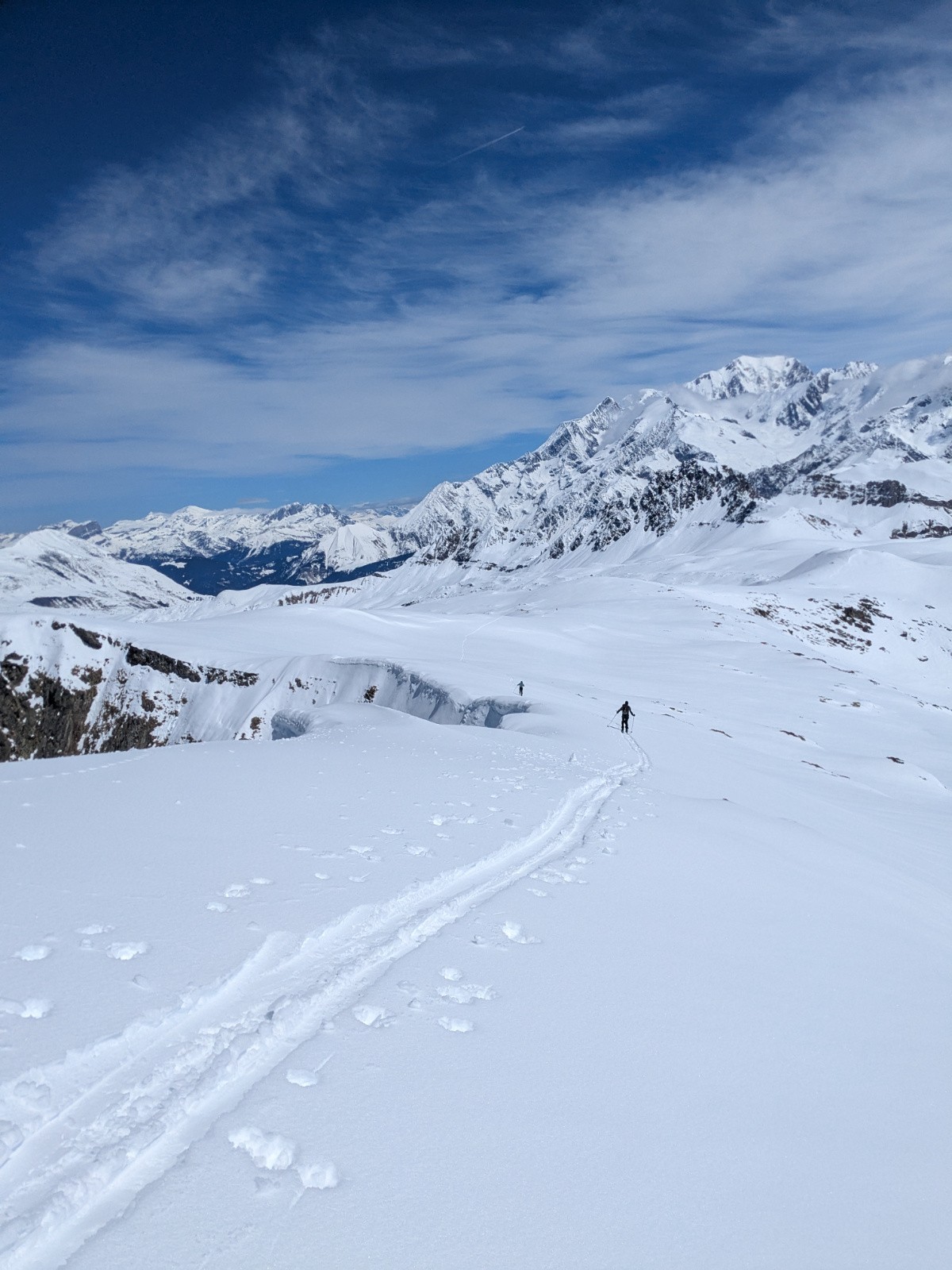 Altitude de chaussage/déchaussage : 150m de portage à la montée, puis on a pu chausser. Par contre ça avait déjà bien fondu quand on est redescendus vers 15h, donc à mon avis il y en a pas mal plus aujourd'hui. Je pense que ce dimanche c'est le dernier jour pour le faire, après plus assez de neige et surtout plus de bonne neige à skier.