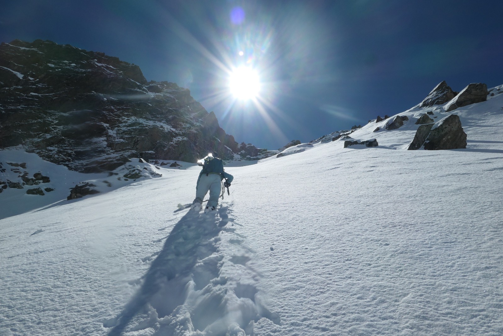 Descente du couloir en chouette poudre! Le bas est moins raide, finalement la partie en neige dure avec peu de neige fraîche a un peu ramolli au soleil donc ça passe pas mal. La suite est plus physique à skier et devient rapidement lourde sous 2200m. Emeric me dit "c'est pas si mauvais"... Voilà comment faire la différence entre un skieur avec des cuisses de cyclistes et 95 au patin et sa compagne avec ses cuisses de moineaux et 85 aux pieds.