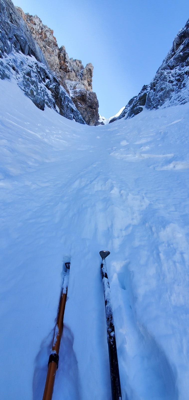 Arrive en bas, je croise les premières personnes venues grimper ce couloir. Que faire, j'en redemande encore ! 2 traces sortent du couloir du Gigolo, c'est parti pour aller voir. Plus technique et la sortie bien raide avec une petite corniche. Je descalade 5m pour chausser et la descente se déroule très bien !