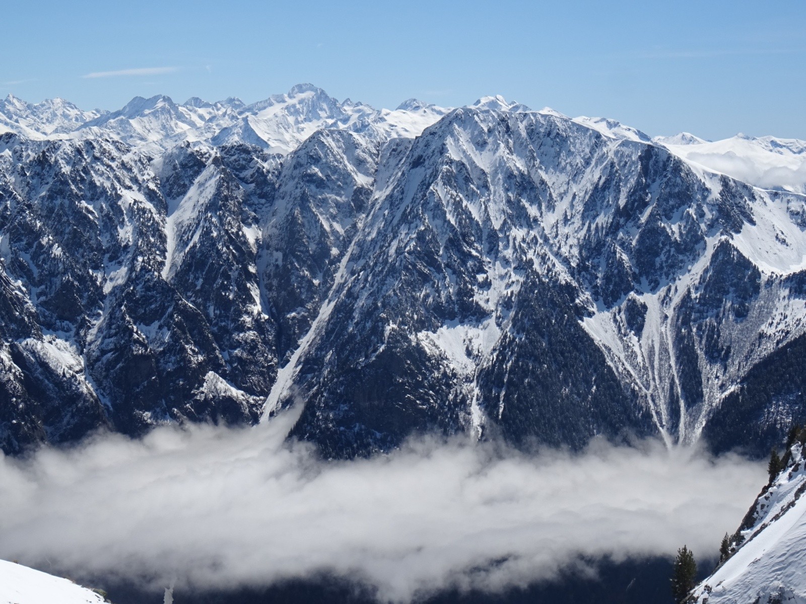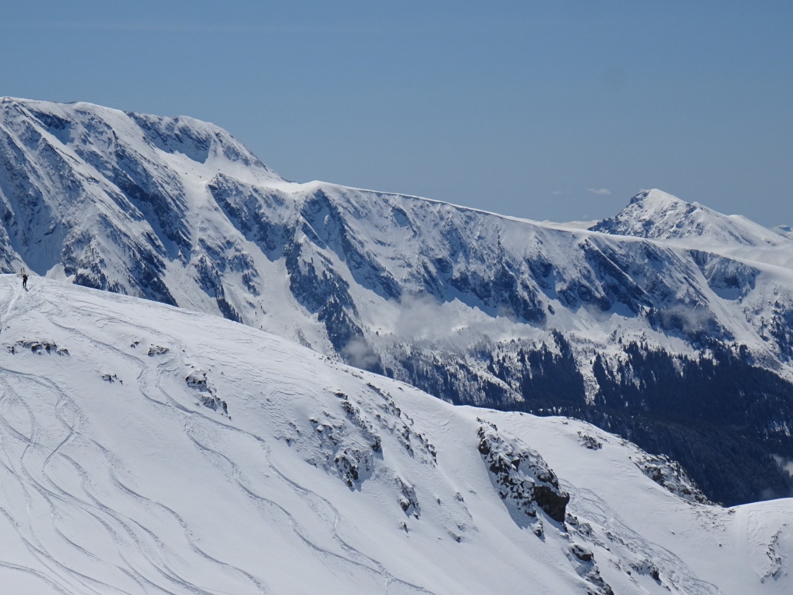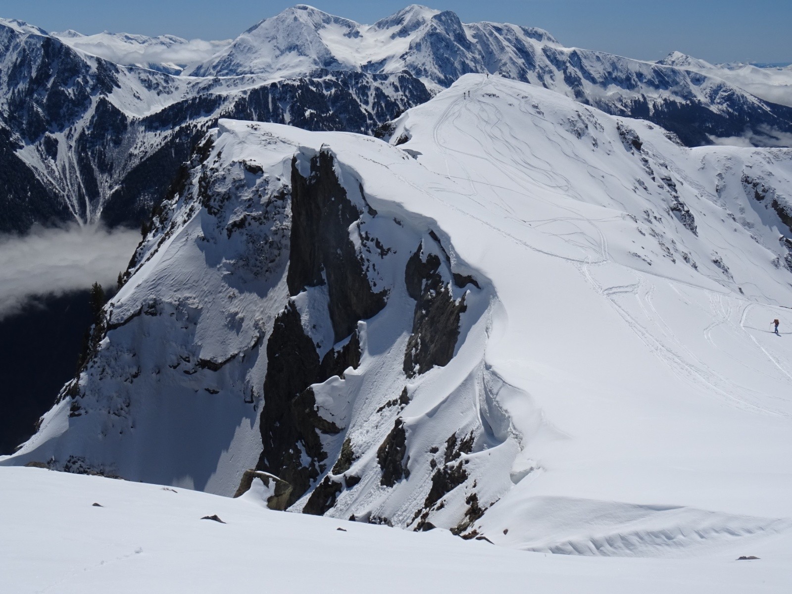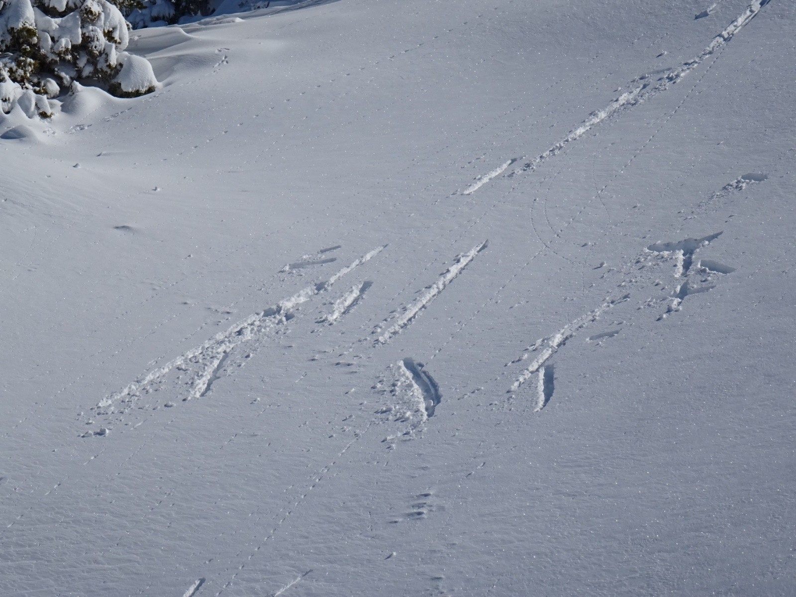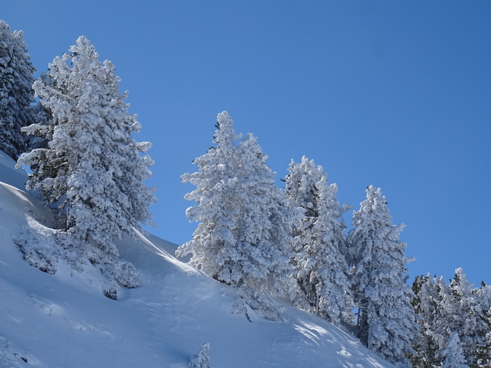 Conditions pour le ski : neige moyenne/correcte, globalement en poudre (+/- fortement) alourdie, avec des passages bien agréables (sous le Petit Van en cherchant sa ligne, couloir Vans/Sorbier en poudreuse très correcte avec juste 2-3 traces), et des zones bien physiques (notamment sur les pistes - sauf quand c'était damé-plaisant).