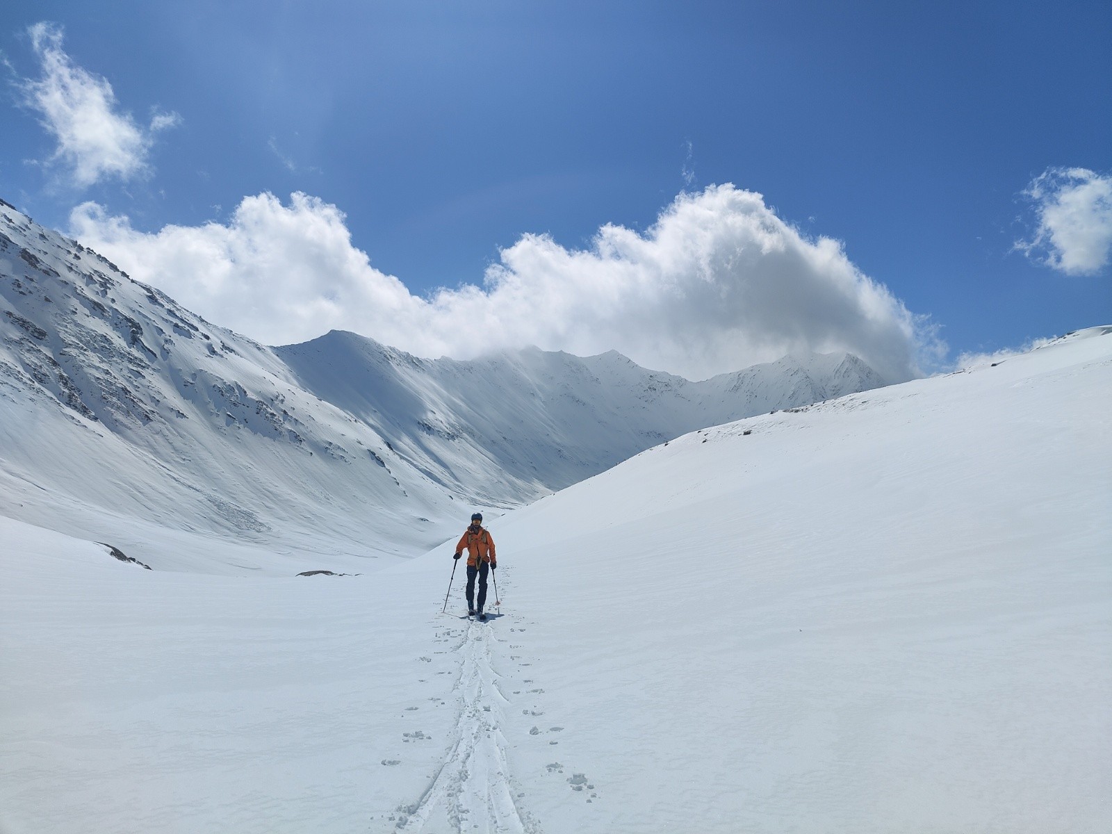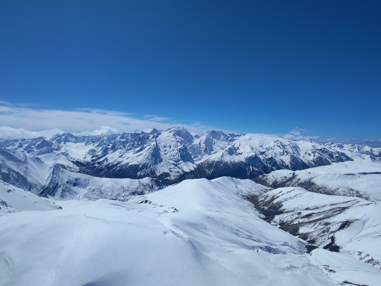 Belle bandée que cette sortie : environ 25km ! avec un début skis sur le dos pour 300m de dénivelé, mais 1h pour les parcourir vu la distance, et dans le brouillard sous la pluie jusqu'a 2000m... au dessus, il neige. Maxi 5cm de fraiche sur fond dur mais ca varie suivant les pentes au vent ou pas. Le brouillard se lève vers 10h30 et laisse la place a un super panorama, tout platré !au dessus du lac, on sent que le soleil a déja fait son oeuvre les jours précédents : le fond est bien dur (par moments pas complètement regelé et on s'enfonce de 15cm). La petite couche de fraiche aide a atténuer tout ca. Mais ca chauffe bien en Sud et tout ca sera moquette a la descente. Vers 2900m, on tourne vers le sommet et on rentre dans sa face nord. Le tracage devient vraiment physique. On s'enfonce parfois jusqu'au genou. Autour de 40cm de fraiche au dessus de 3000m. Certains endroits ont vu le vent d'Est et sont un peu cartonnés. En visant un peu, on les évite. On s'arrête a 3350m pour manger vers 12h30. Super vue sur la Meije, la barre des Ecrins, et les aiguilles d'Arve ! Première partie de descente fantastique ! On est content d'avoir choisi ce coin. La suite, avec le soleil, c'est de la moquette assez molle sur un fond dur en grande partie. On s'enfonce quand meme bien sur certains appuis. Vers 2600m, on remonte vers le Cruq de l'aiguille pour éviter la pente sous le refuge. Avec le brouillard on avait pas vu qu'il y avait peu de neige dans ce coin... on fini skis sur le dos vres 2100m après quelques touchettes. On aurait peut etre mieux fait de redescendre par la où on est monté.