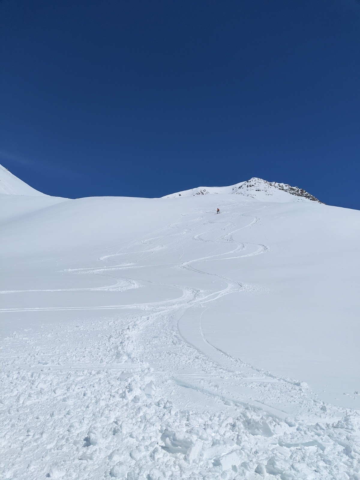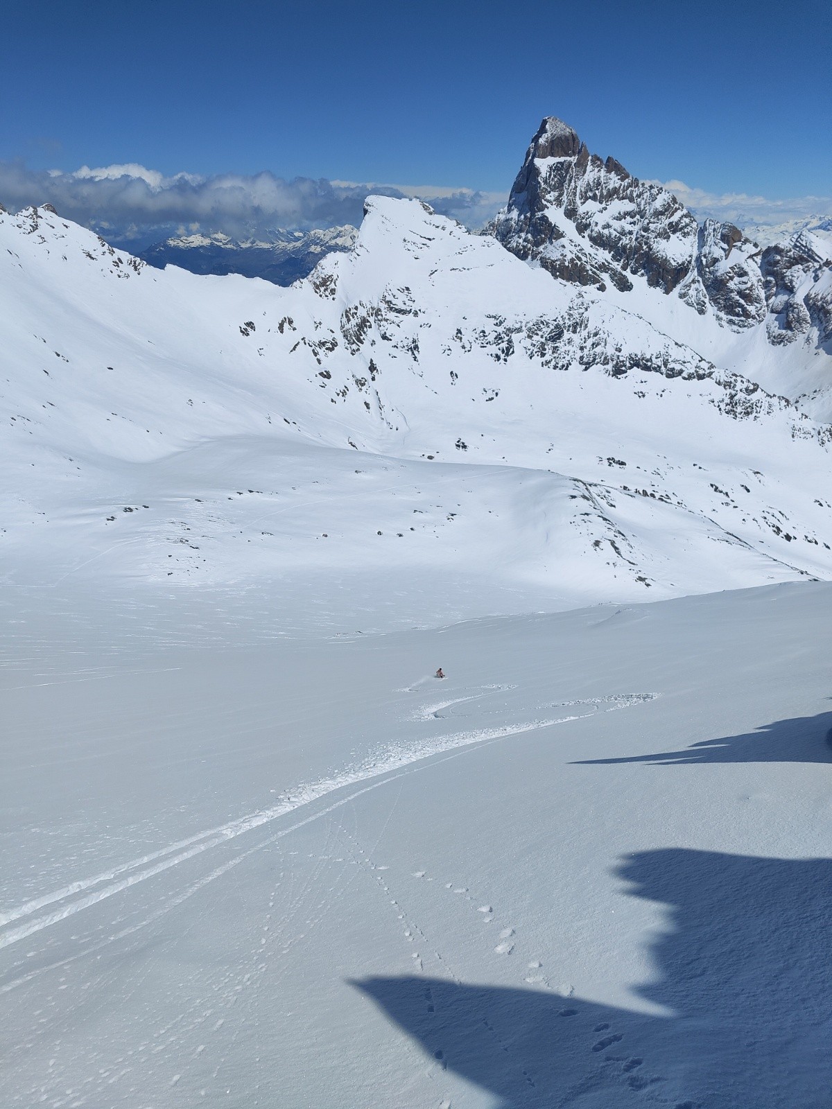 Conditions pour le ski : de 3350m a 3000m, 40cm de super poudre légère en Nord (rien que pour ca, j'aurais bien mis "bonnes conditions" pour le ski). Puis jusqu'a 2600m, en Sud, les 5cm de ce matin étaient revenus au soleil, sur fond dur (a part quelques surprises molles). Sous 2600m, bien mou. Sous 2100m, rien
