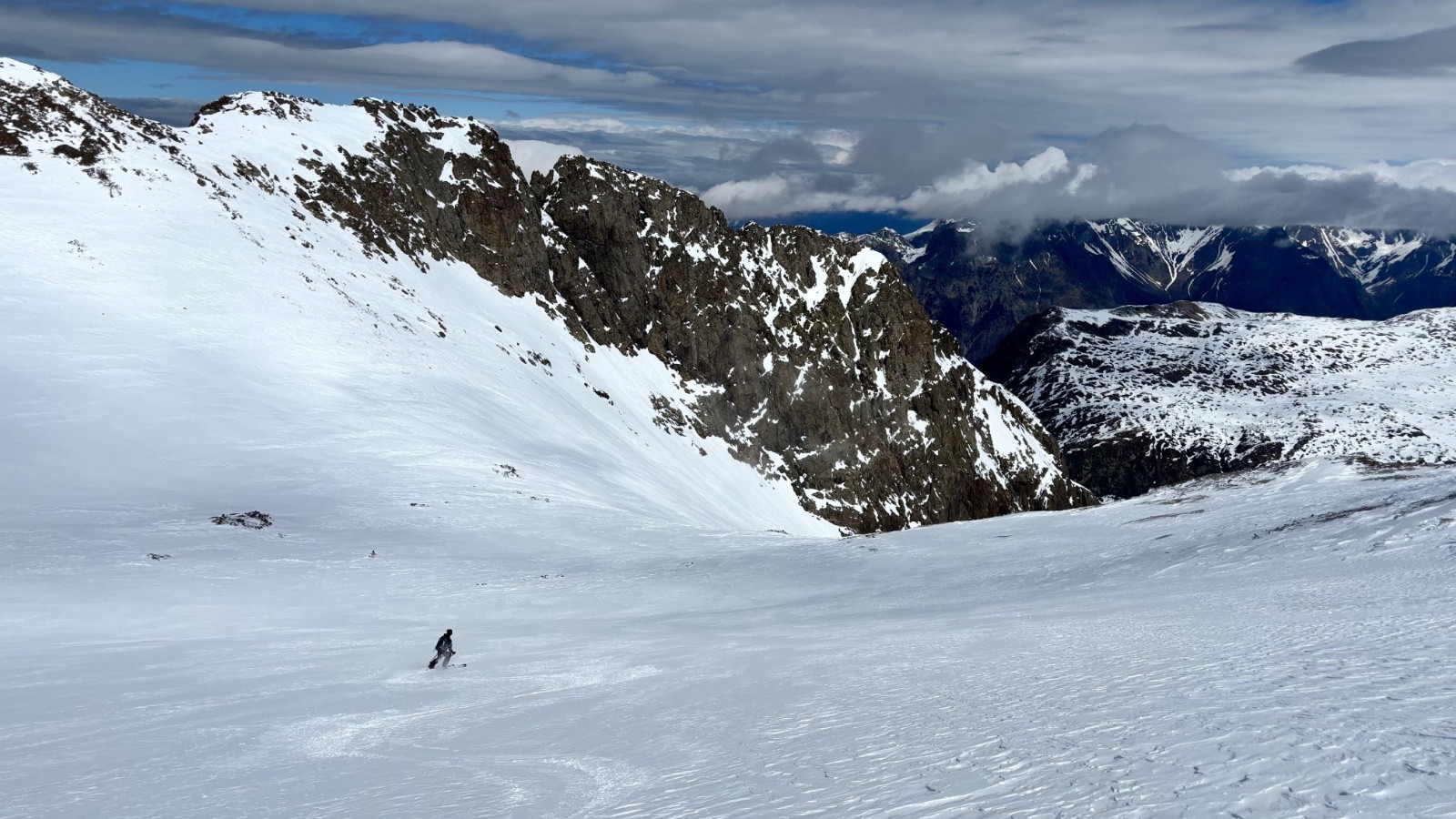Conditions pour le ski : bonne. Pas de croûte, un peu de carton formé par le vent, croute portante en-dessous, moquette puis soupe sous 2300m.