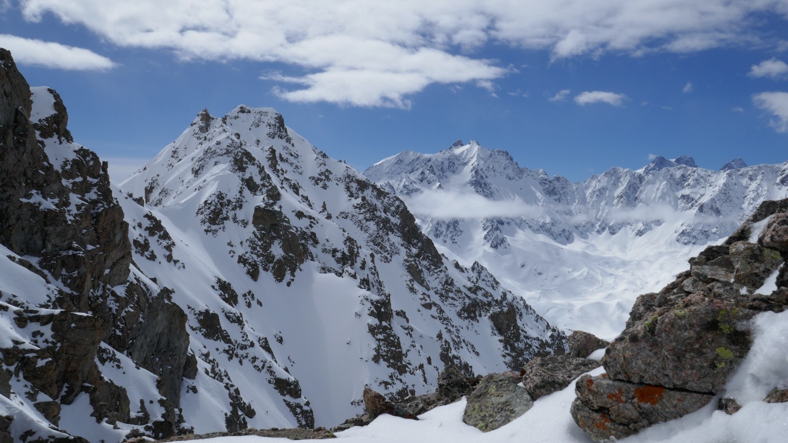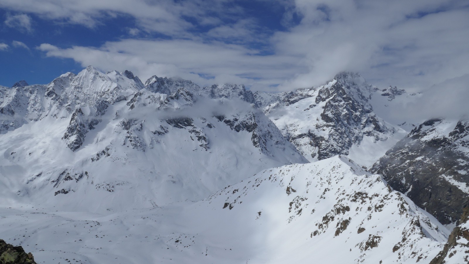 Un groupe de trois (2 skieurs, 1 surfeur) devant nous ira au Pic du lac de combeynot par le couloir nord. Pour les avoir vu monter et descendre, on confirme que la neige était excellente. On a hésité à les suivre mais la peur de m'enfoncer jusqu'au menton et un brassage infernal m'a fait douter. Un peu plus haut, on bifurque pour aller voir la tête du vallon, autre objectif possible de la journée mais moins bien orienté. Et en effet, c'est trop tard et ça coule. On rejoint l'itinéraire des jumelles pour faire le traditionnel col. Au moins la vue est toujours aussi belle. Pique nique, on prend notre temps.