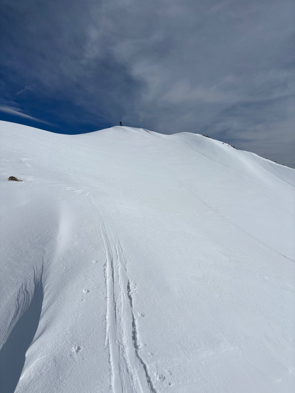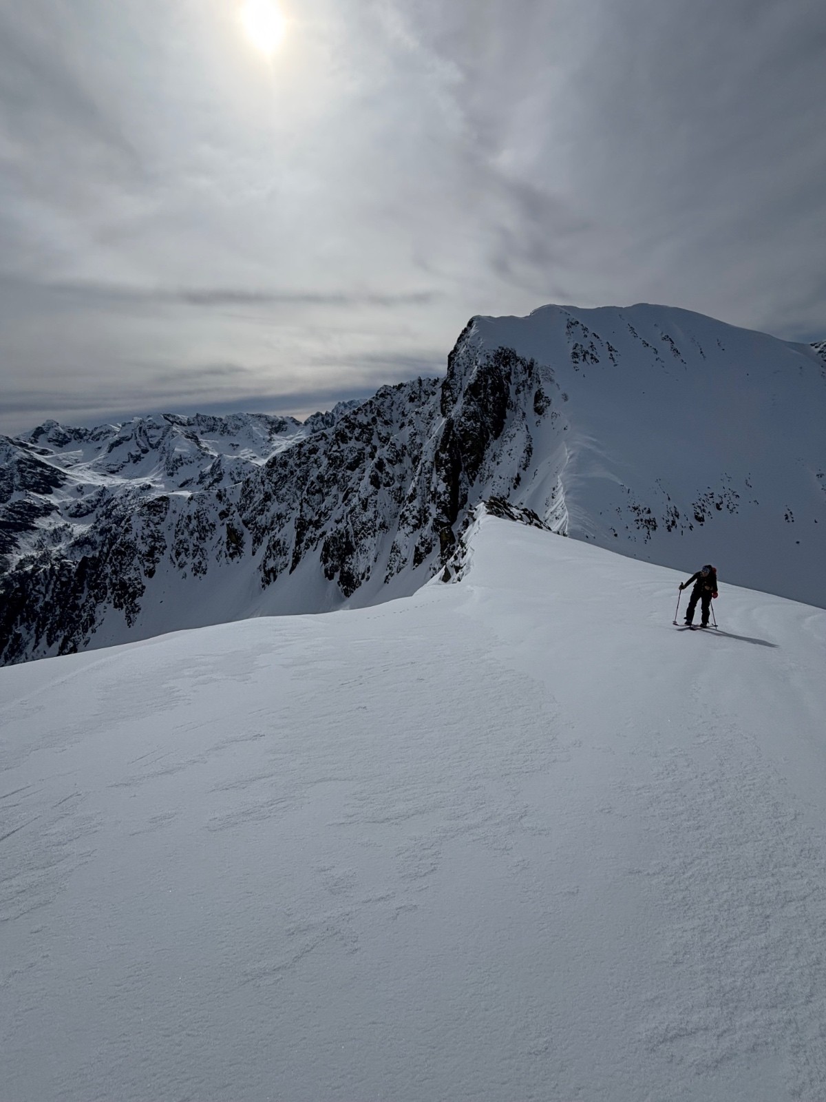 Itinéraire suivi : col de la lombarde via piste de ski fermée, Colle dei morti, montée jusqu’au sommet ski au pied et couteaux sous l’arrête SE du mont Aver.