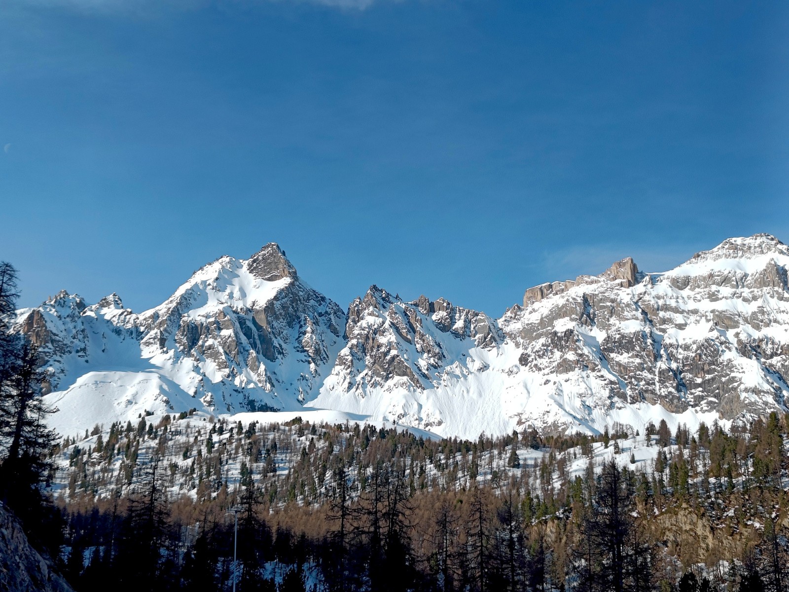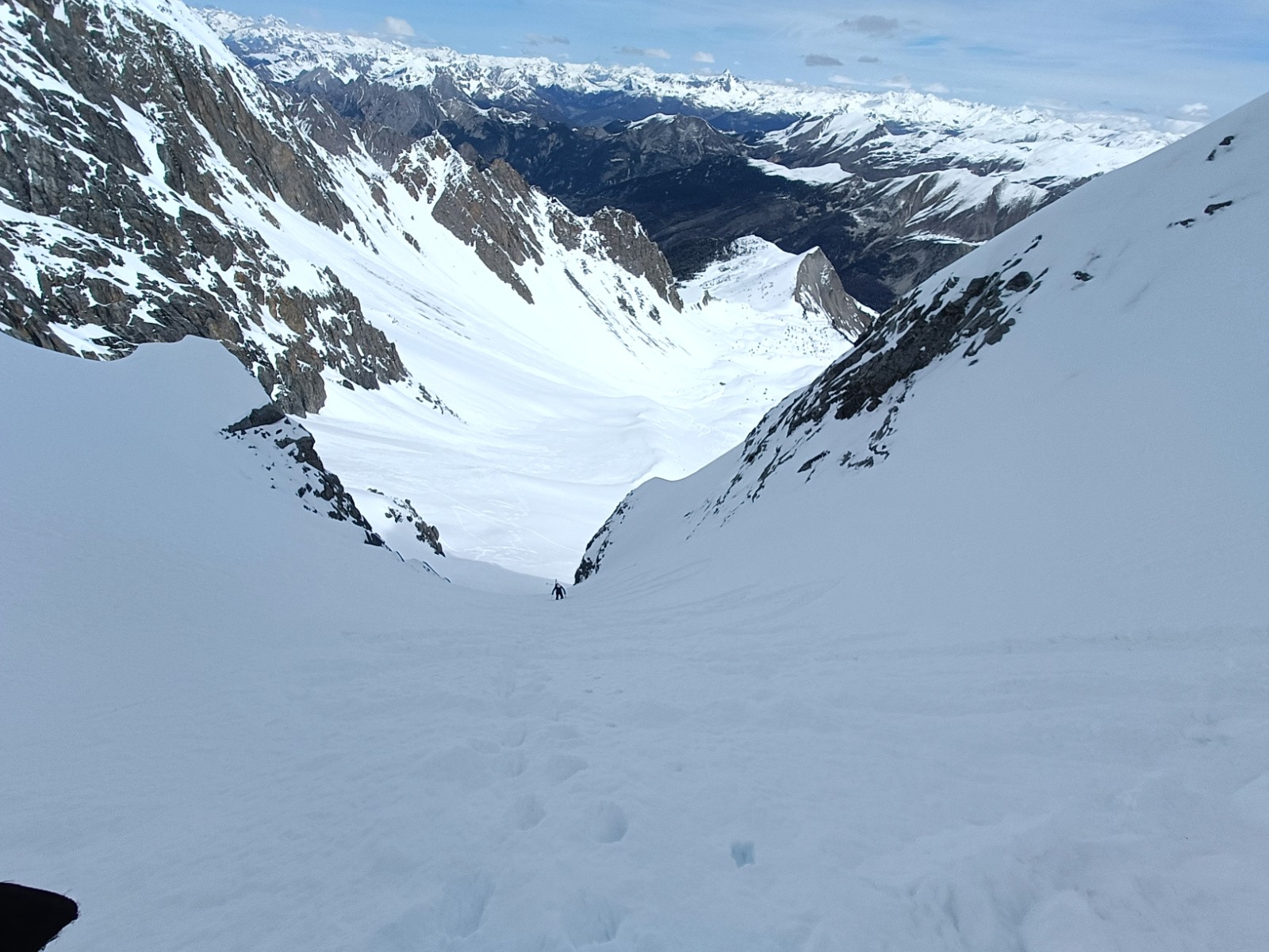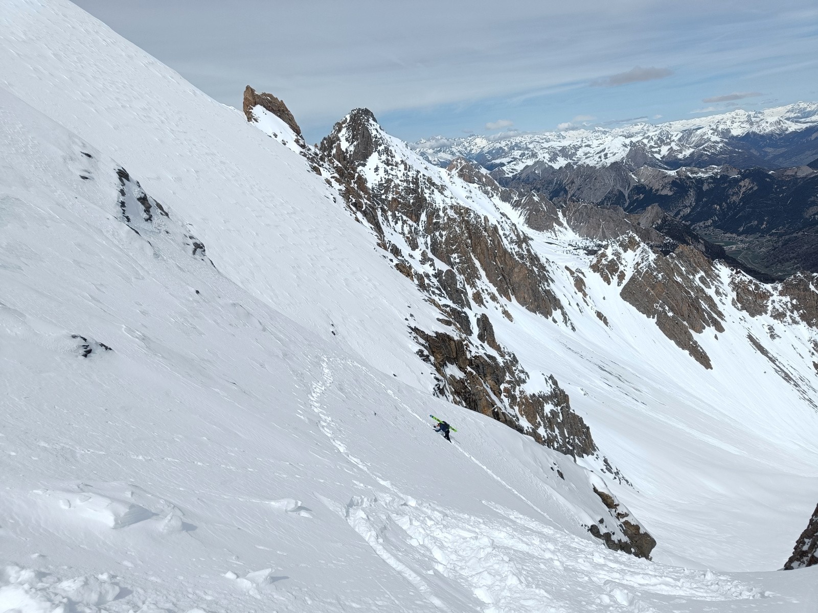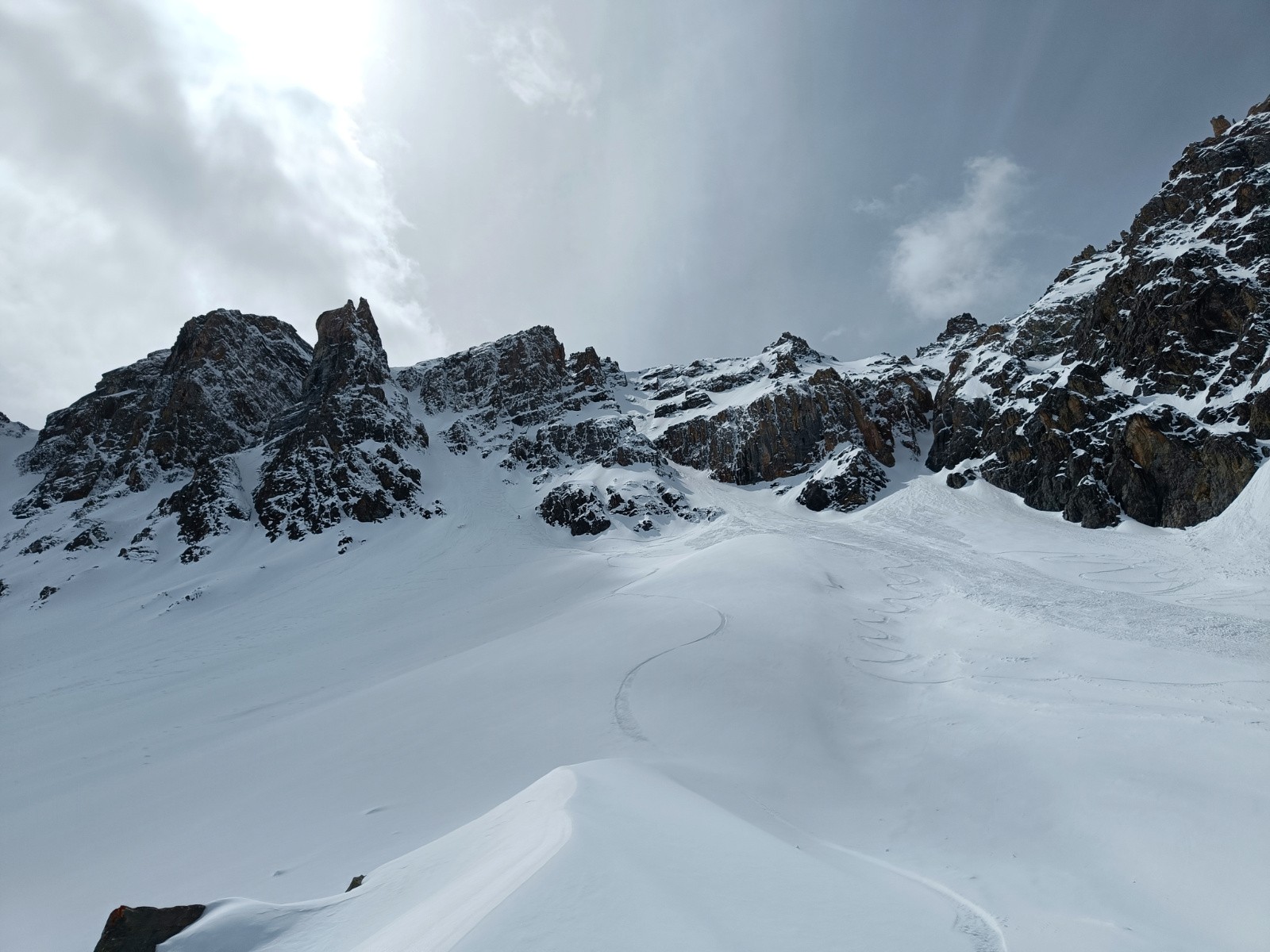 La descente qui suit et dantesque. Poudre en haut du couloir, poudre dans les contrepentes, poudre sur le socle. Puis moquette de qualité plus bas et sur les pistes.