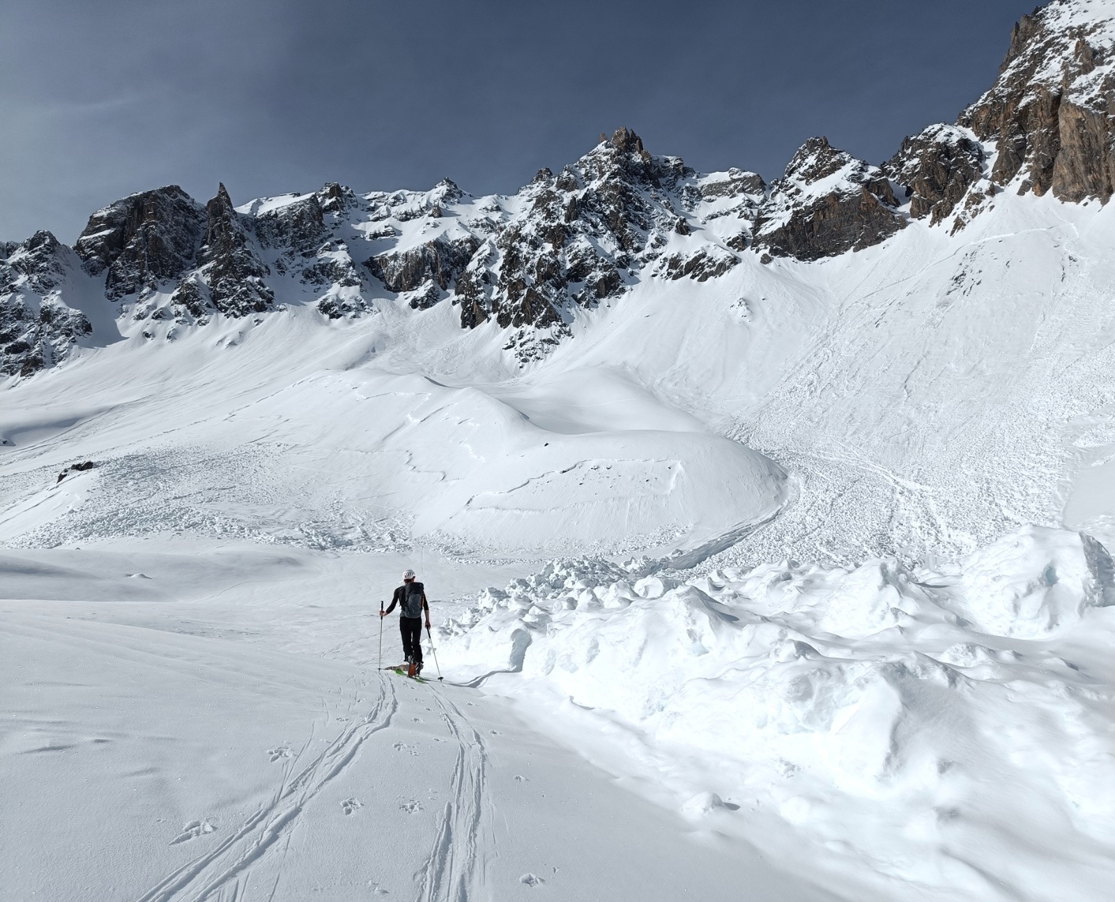 Petite montée sur les pistes avec les couteaux en guise d'échauffement puis on arrive au cirque de la Font Sancte. On ne peut pas s'empêcher de constater les avalanches monstrueuses qui ont ravagé tout les versants: plaques de 1m de large, purges, coulées de neige chaude, en vrai champ de bataille quoi. Dans ma tête je me rassure en me disant que le BRA annonce risque 2, et je prie secrètement que le soleil a fait son boulot de stabilisation. En effet, en se rapproche de la face, on constate que c'est bien le cas.