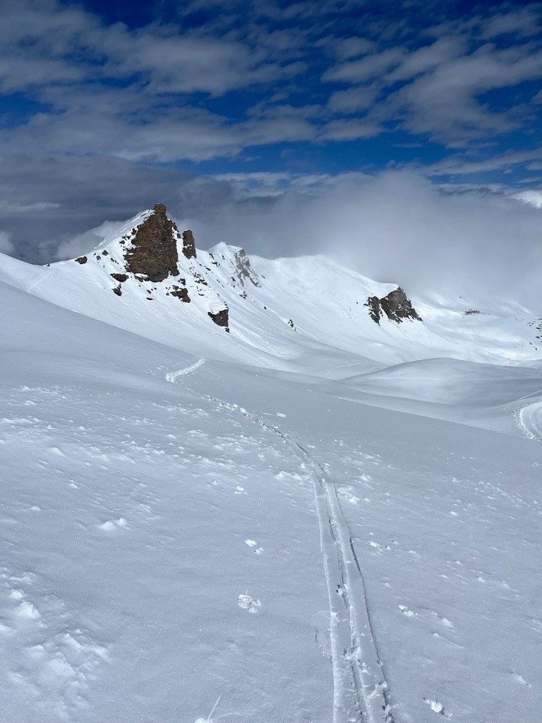 Conditions nivo et activité avalancheuse : tout les versant sauf N transfo jusqu'à 3000m avec relativement bon regel. N qui voit pas le soleil délicat. Je suis monté sous la bouche de gazex où on voyait les résultats des déclenchements, mais du coup c'était safe. Sous le couloir j'ai évité les quelques sections où le carton de surface commençait de dépasser 10-20cm en plaques plus conséquentes. Dans le couloir on arrive à naviguer proche des rochers et dans de la neige pas liée. Demi-tour 15m avant le col où ça s'est élargit et je sentais pas trop (la partie rive droite devenait plaquée sur une épaisseur conséquente, et centre + rive gauche commençaient à avoir vraiment trop de neige).