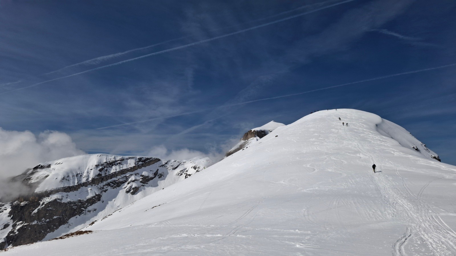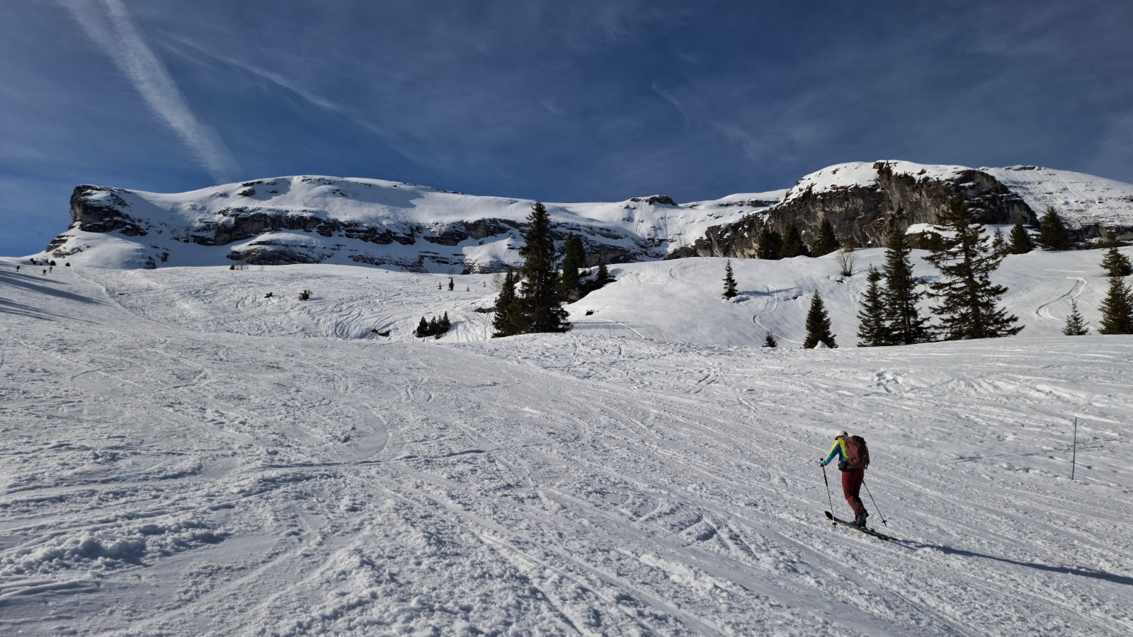 Itinéraire suivi : cf gpx, montée piste du stade et Méphisto, puis piste Fred jusqu'en haut du télésiège Lindards, croupe N jusqu'à la tête, descente vers les chalets de Platé, remontée au col du Colonney, descente par les pistes