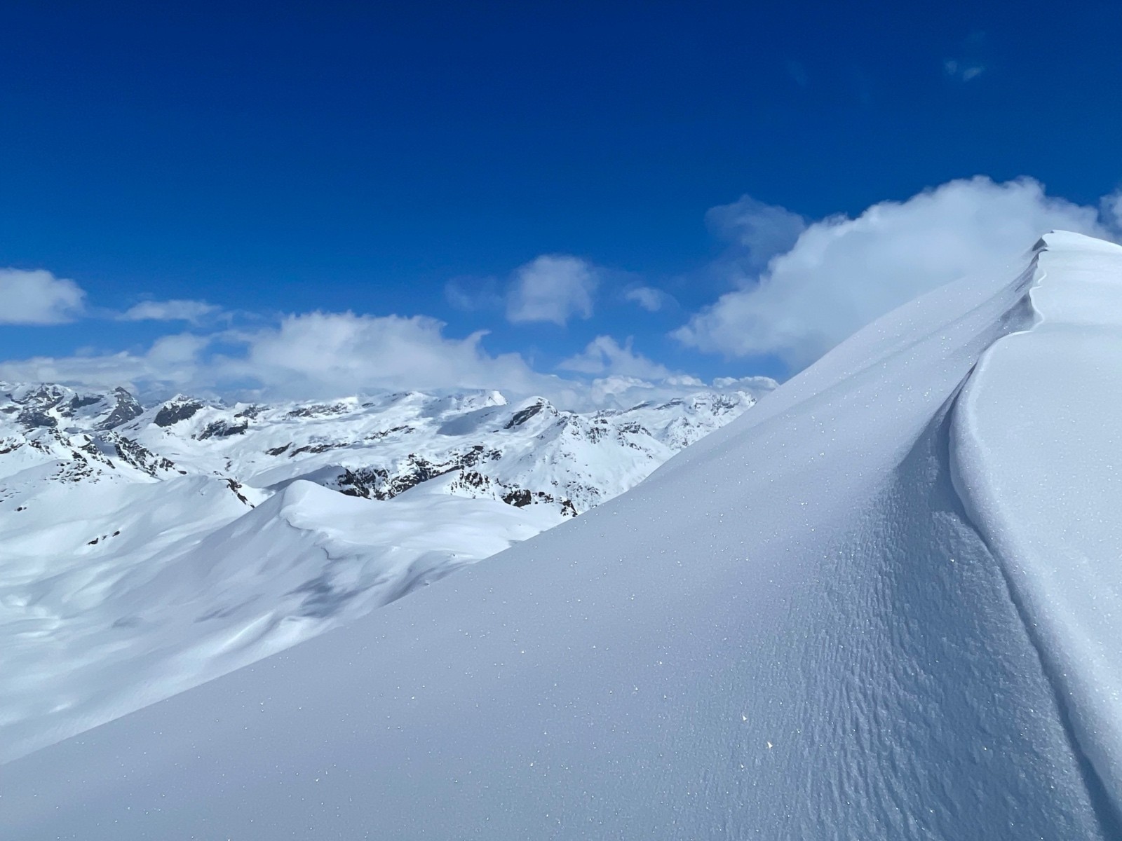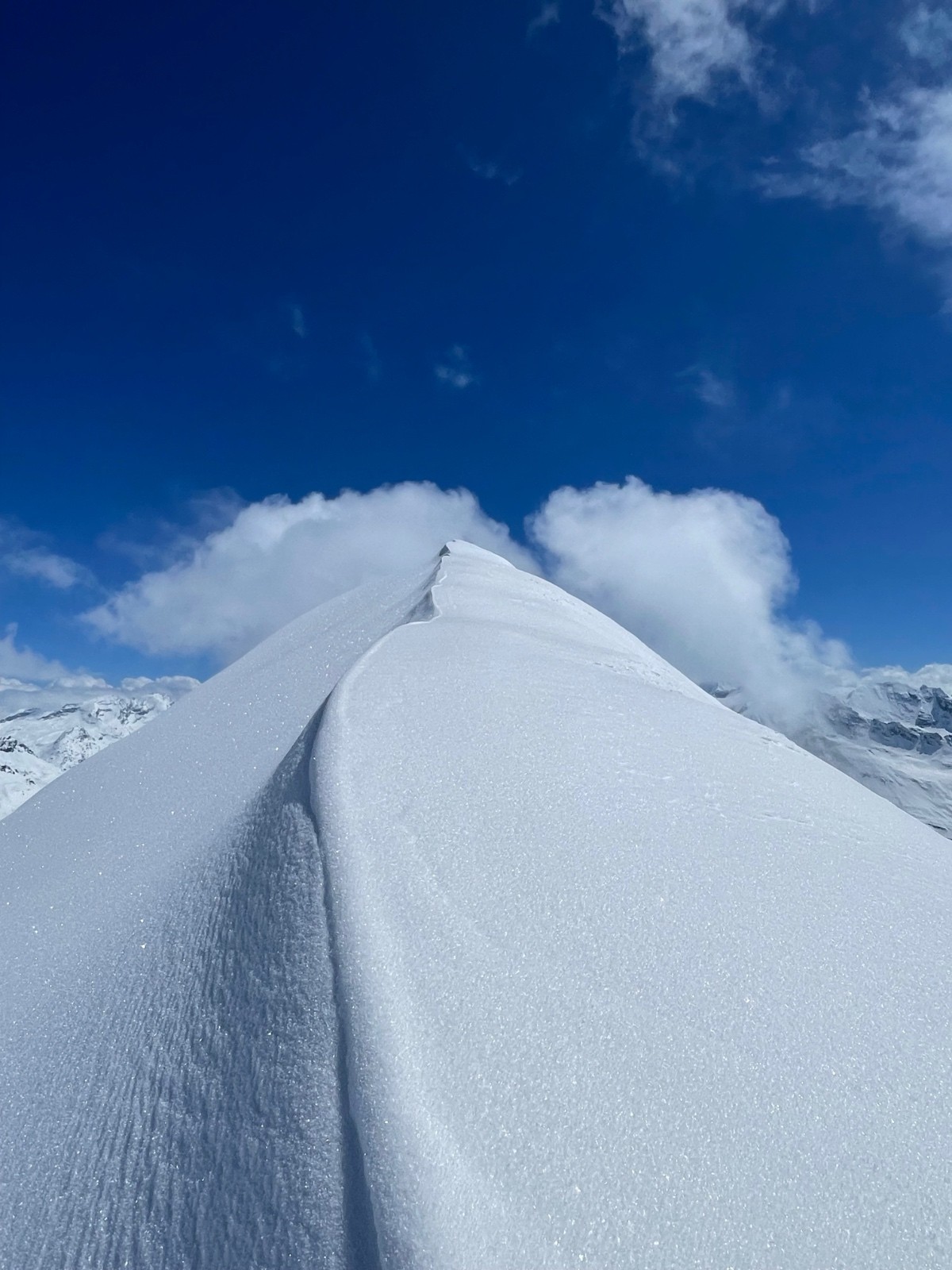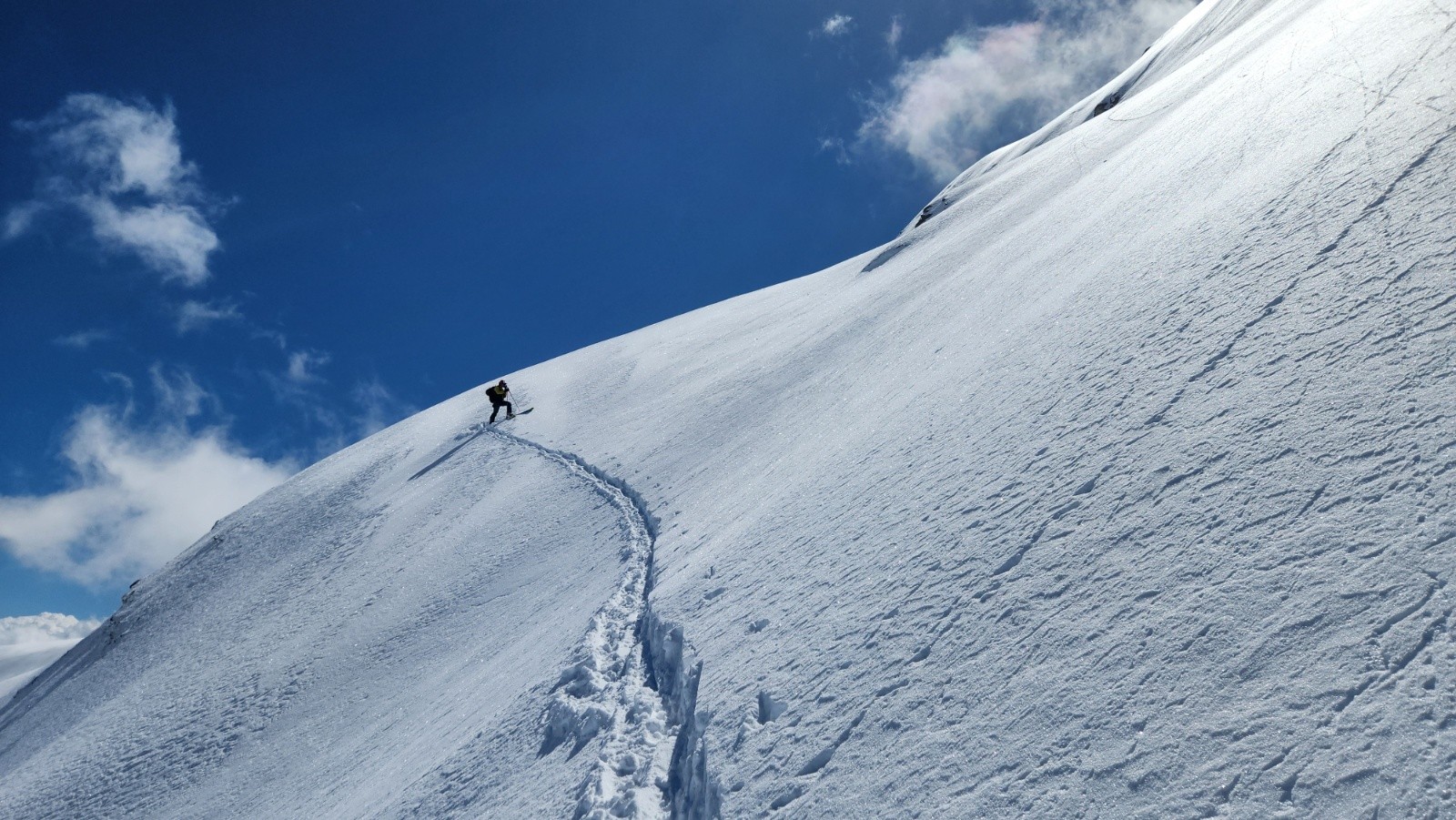 Conditions nivo et activité avalancheuse : jusqu'à 2800 m, condition de printemps donc RAS le matin. Dans la face nord, une partie de la neige du retour d'Est est descendue toutes seule pendant les chutes. Résultat, on ne retrouve pas les quantités démesurées observables sur le plat. A l'endroit du sondage, vers 3100 m sous la Pointe du Méan Martin, on ne trouve "que" 50 cm de neige récente, plus ou moins meuble, à peine plaquée, qui repose sur l'ancien manteau humidifié. Ces 50 cm hébergent un profil de plaque friable sur les 20 premiers centimètres, peu réactif sur notre tracé. L'ancien manteau neigeux est compact et stable.