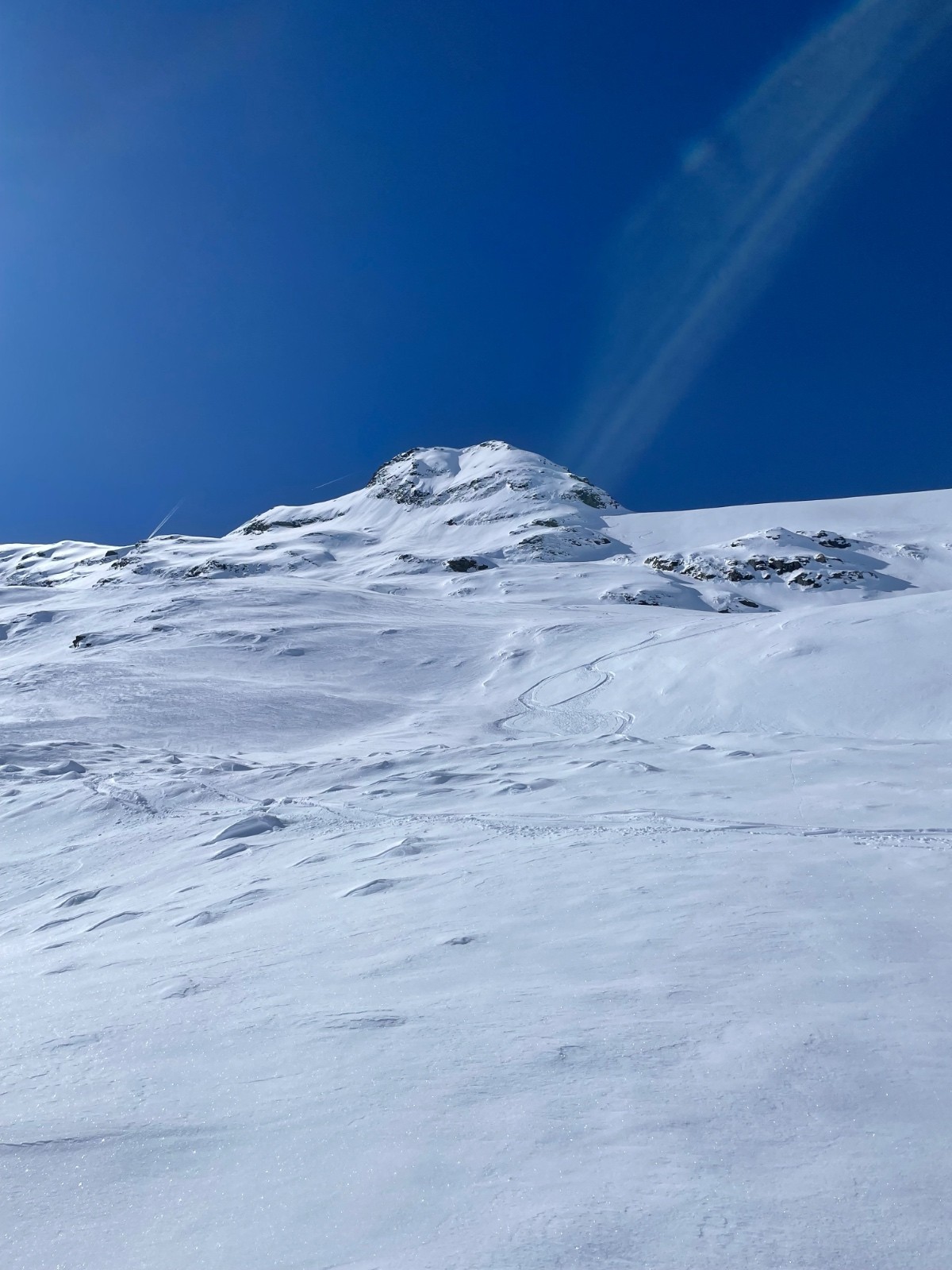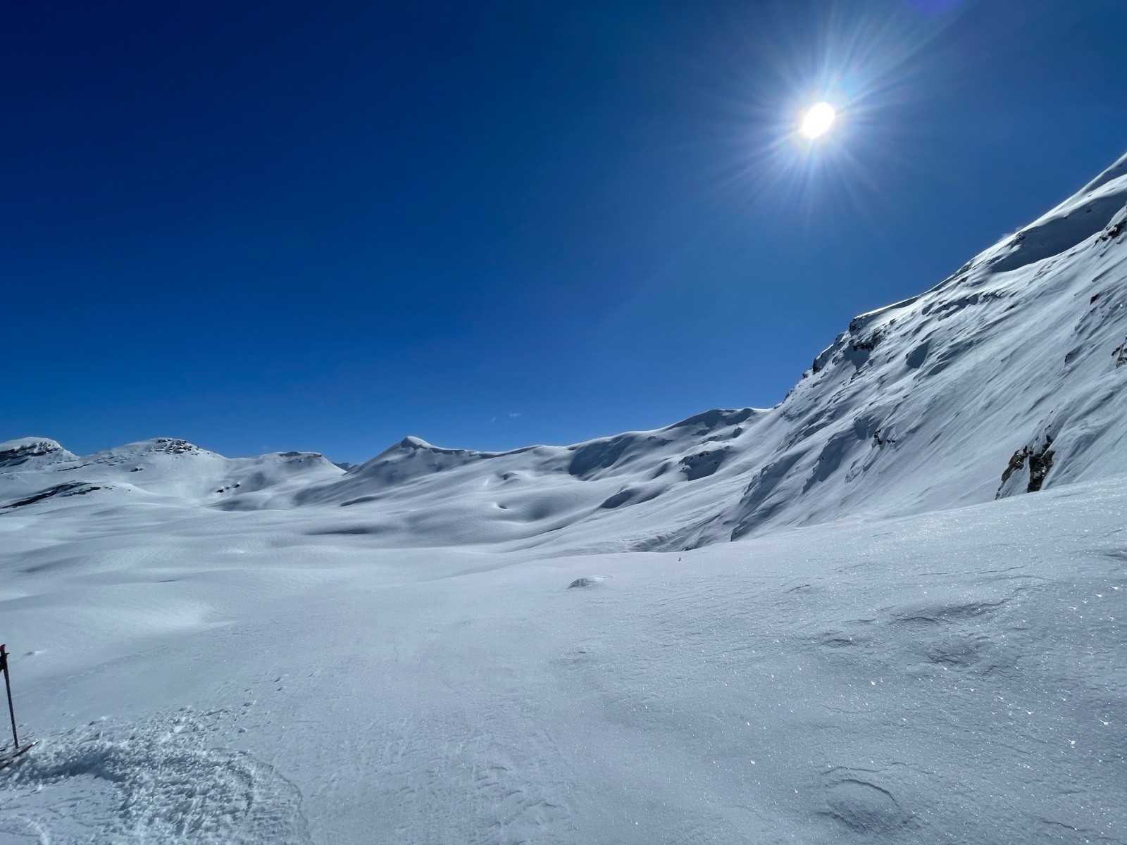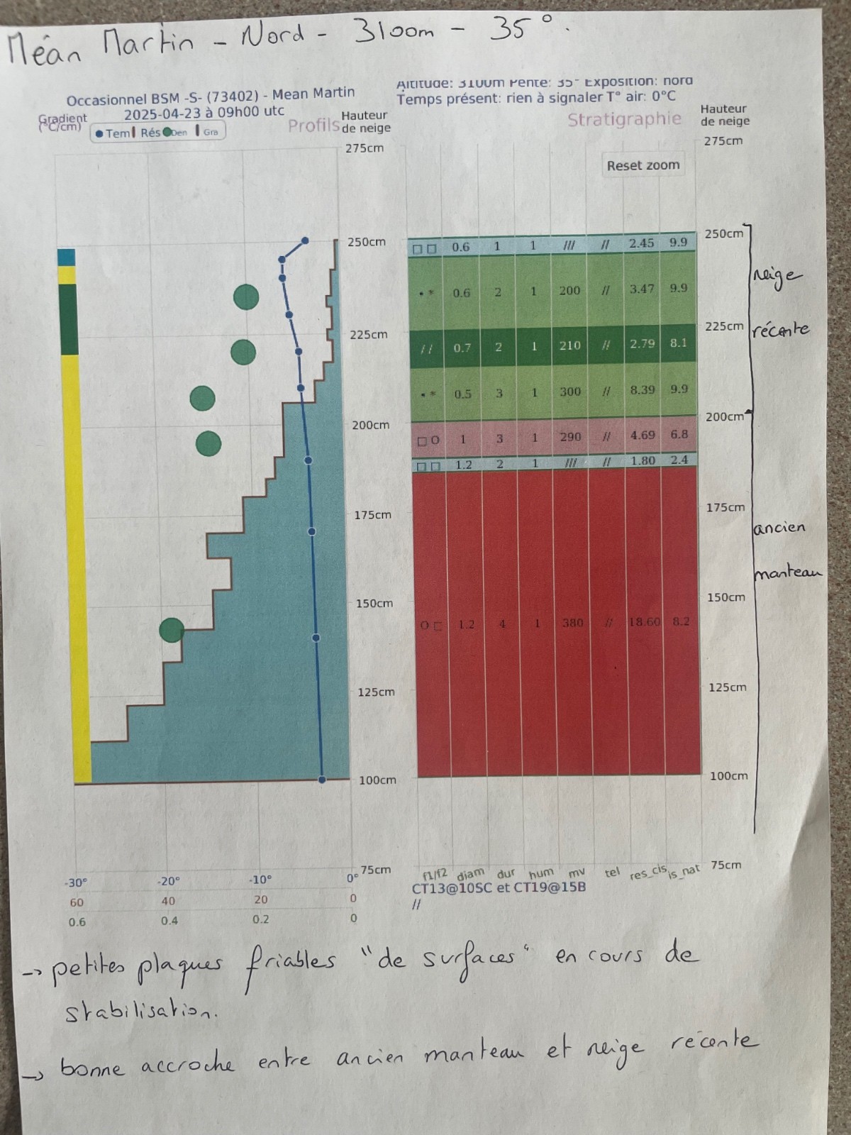 Conditions pour le ski : neige de printemps bien regelée le matin mais fortement traffolée jusqu'au refuge. C'est portant jusqu'à 2800 m où on bascule en neige froide, dans la face Nord de Méan Martin. Jusqu'au sommet, on trouve ~15 cm de neige poudreuse sur un fond dense. En surface, un peu de givre et de face plane. Pas de signe transport, la face nord est très bonne à skier et les avalanches du retour d'Est du 17/04/25 ne se voient presque plus. La descente à 12h30 était déjà hors timing pour espérer glisser sur les longs plateaux. A cela s'ajoute le manque de quelques cycles gel/dégel pour obtenir de la vraie neige de printemps.