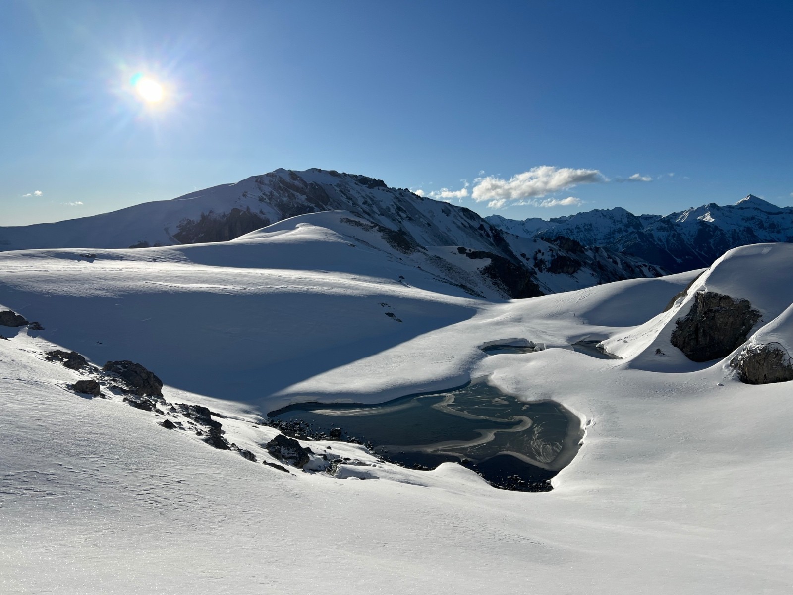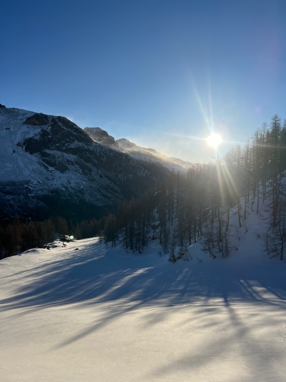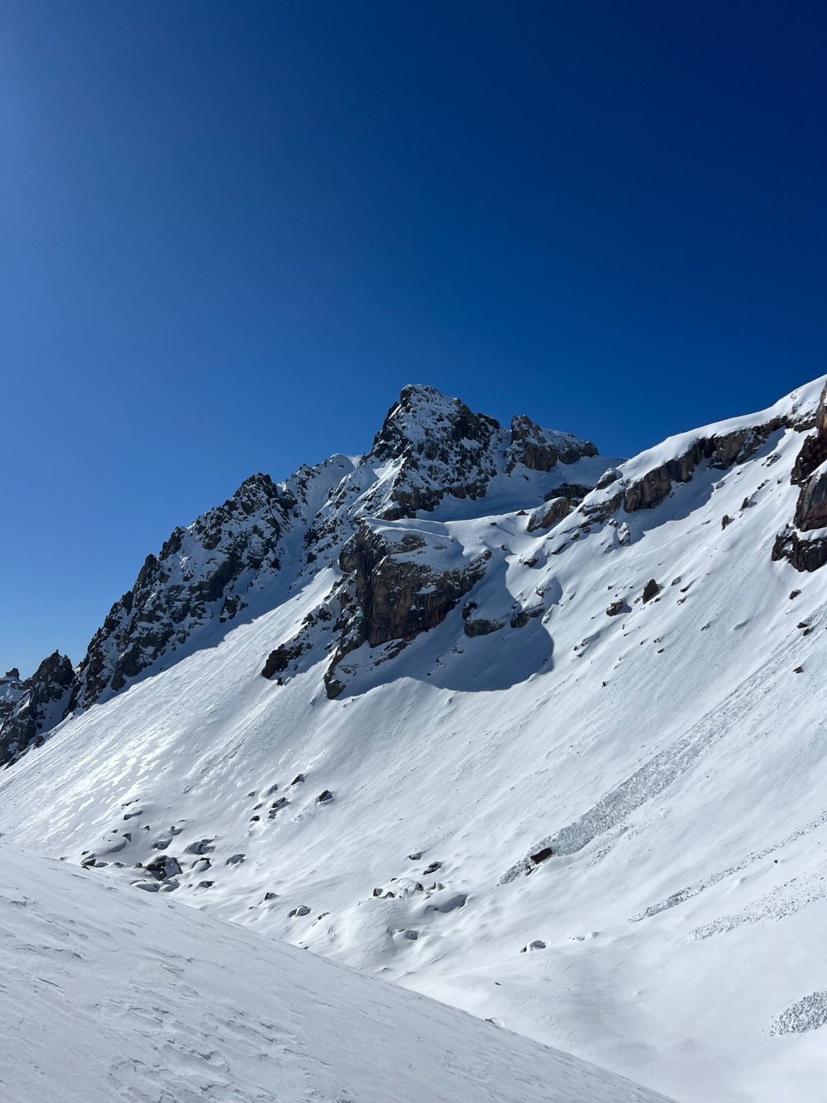 Depuis le sommet, descente plein nord plus ou moins sur le chemin d'été, je ski clairement sur des oeufs (non je rigole, c'est pour voir si vous suivez...)