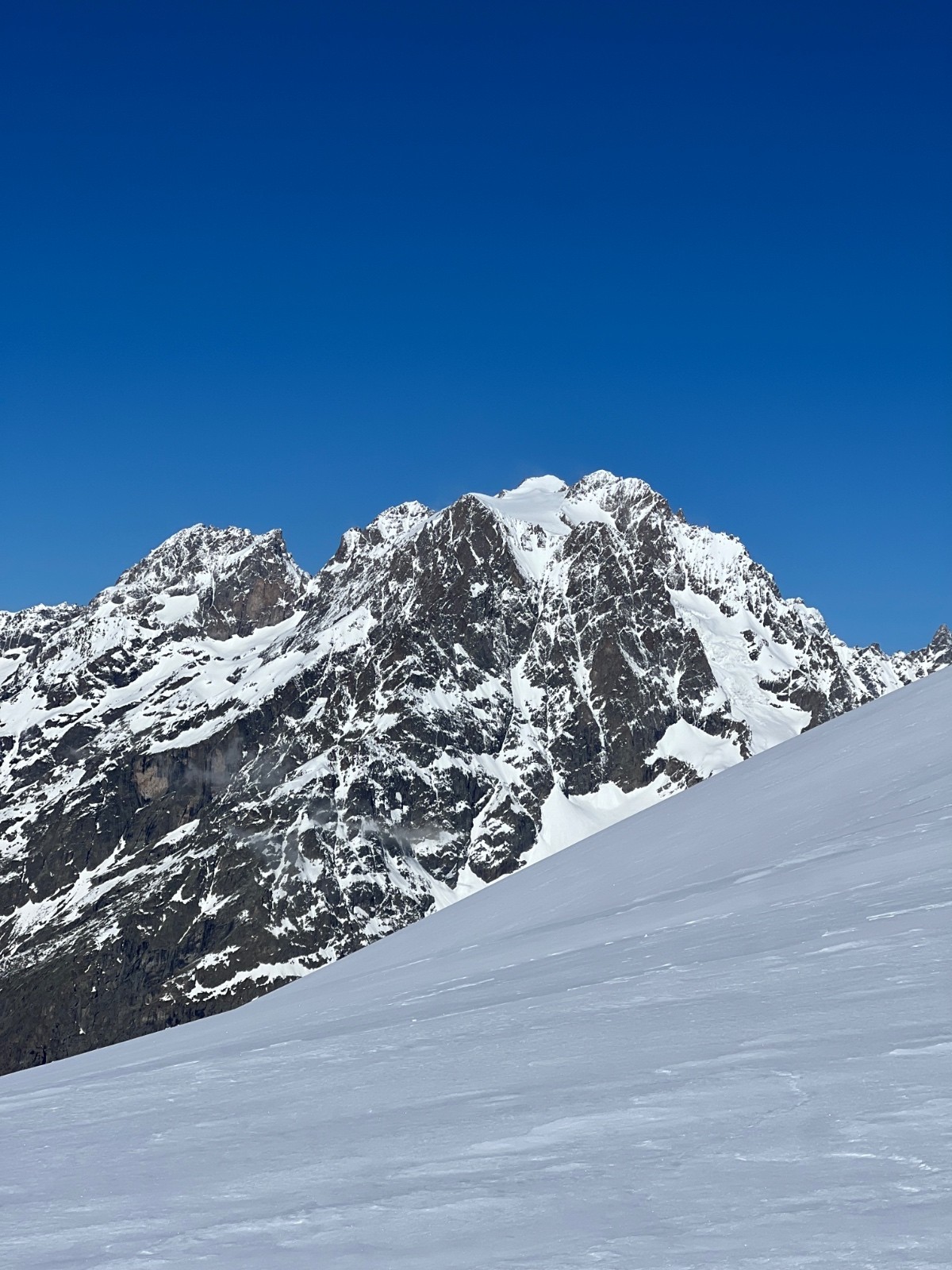 Pente de droite sous rocher bouchard plutôt que le col de Vallouise, je sors les couteaux 20m histoires qu'ils me servent une fois au moins ? Neige béton