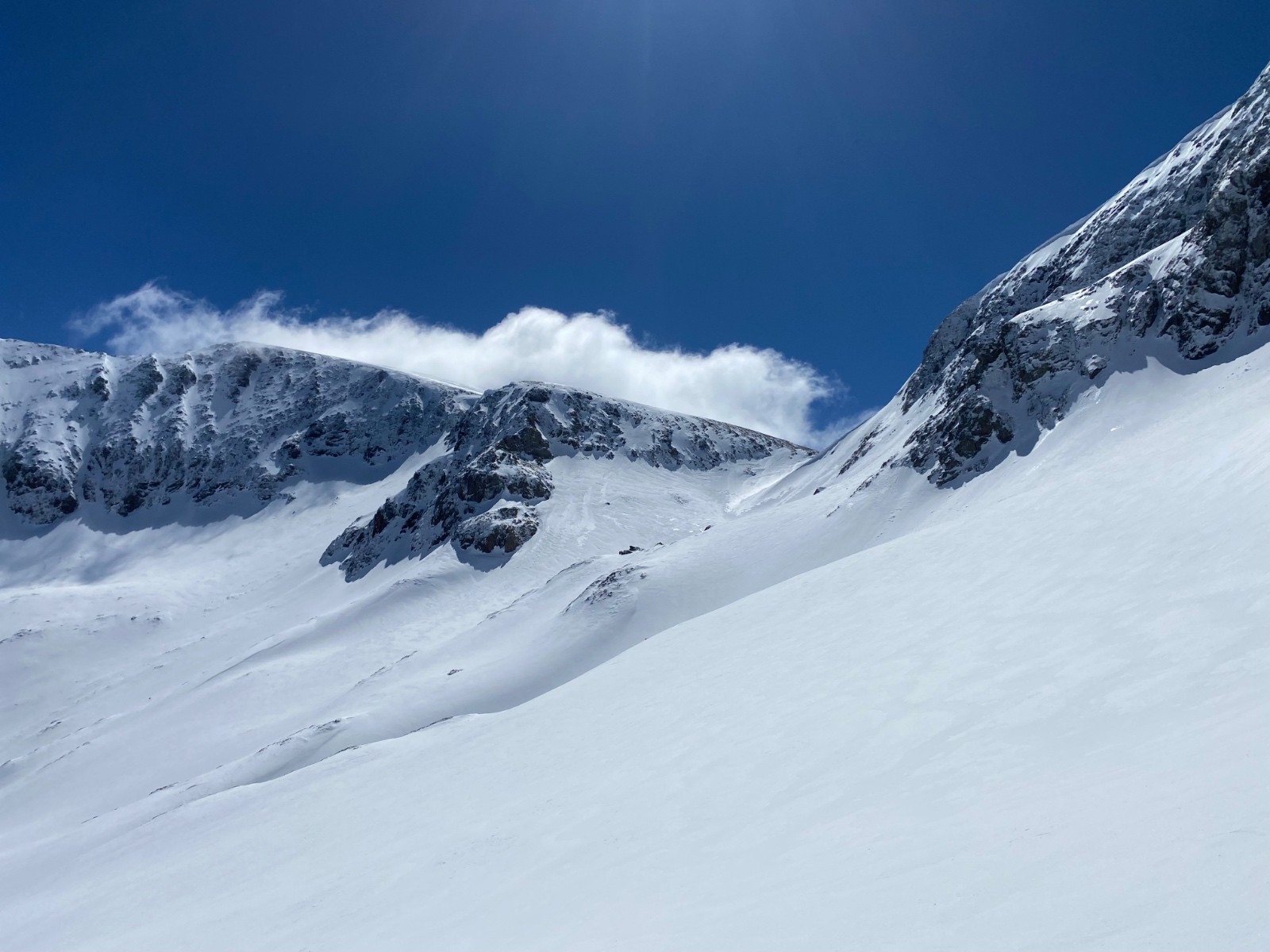 Conditions nivo et activité avalancheuse : des traces de coulées anciennes, beaucoup de spindrifts sous les rochers. C’est pas très très stable dans les grandes pentes, on a fait partir quelques petits trucs.