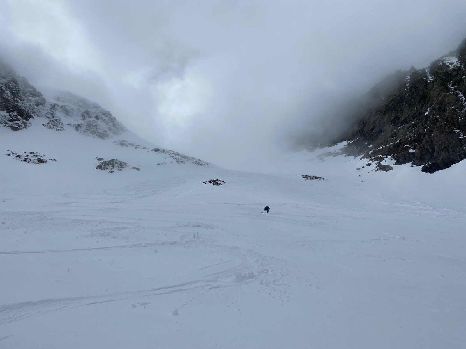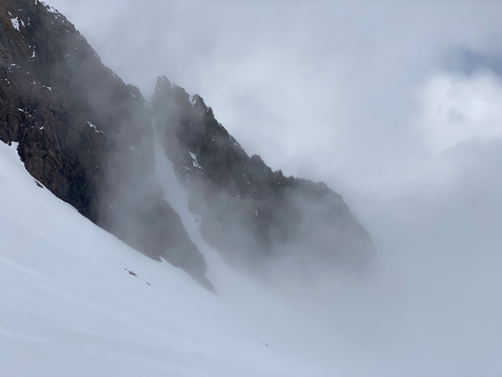 On s’arrête juste sous le sommet car la météo se dégrade d’un coup et on a plus aucune visibilité. On suit les traces de montée dans la première partie pour pas se perdre et éviter de filer en bas des barres rocheuses.