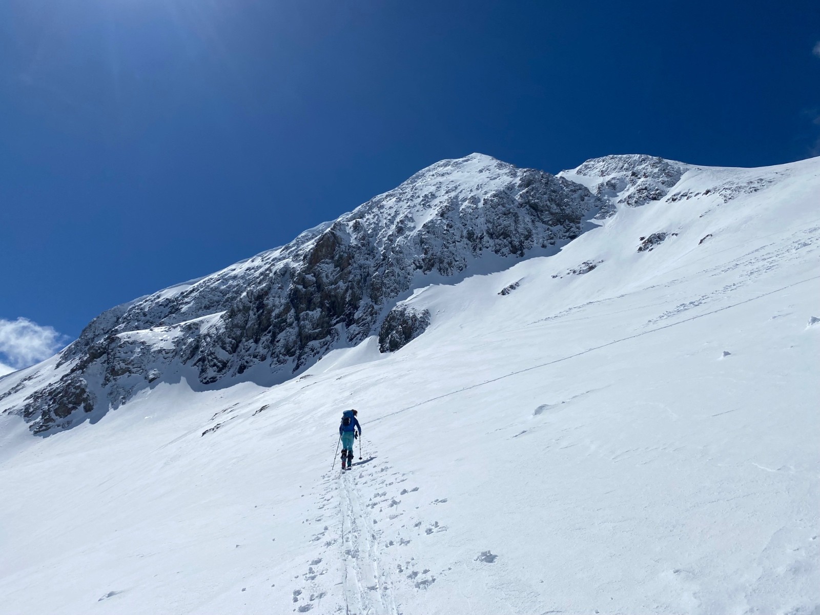 Conditions pour le ski : la neige devient très rapidement lourde. Dans les grandes pentes, au moins elle est pas gelée :-) mais à la descente c’est lourd. Pas mal de blocs de glace piegeux.