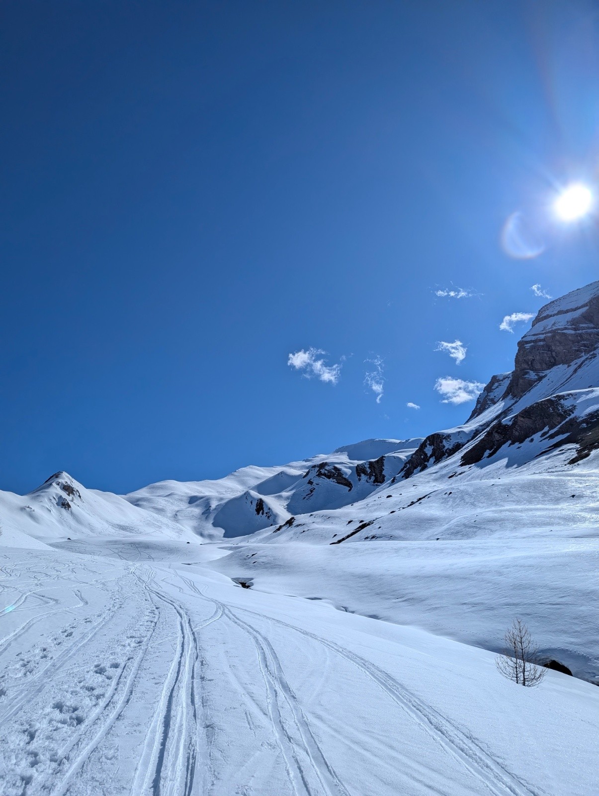 Conditions pour le ski : la neige au soleil est un peut lourde mais dans l'ensemble ça va et au dessus de 2400 une petite couche de 8cm de la veille sur fond dur agréable a skier.
