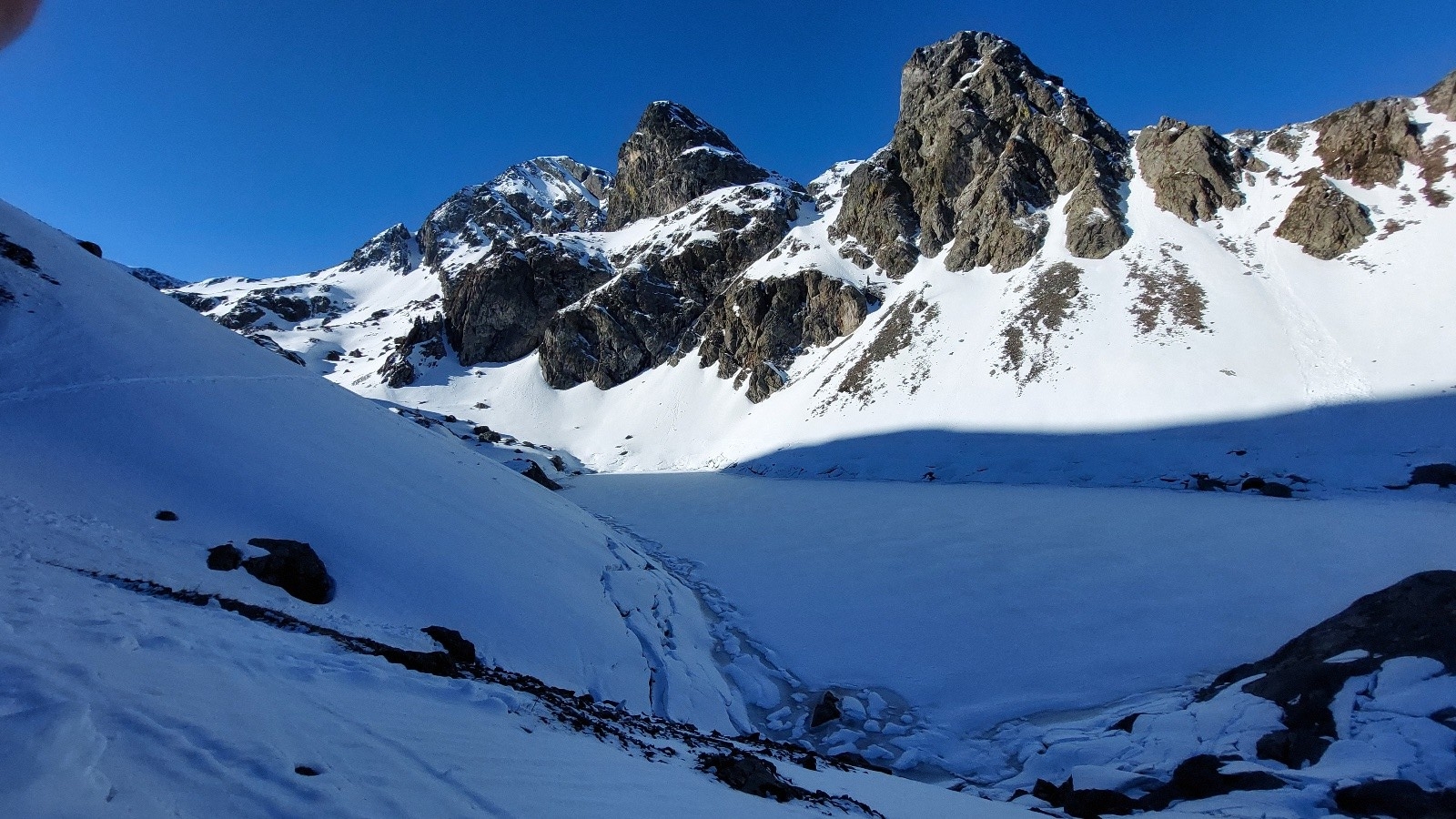 Conditions pour le ski : bof .. pas mal de vent qui empeche tout decaillage sans etre sous le soleil - Face Est de la grande lance : les 5 / 10 cm de poudre de la veille qui zippe un peu sur le fond dure (manque de cycle gel/ degel pour uniformiser tout ca) - carton souple en descente face Sud/Ouest jusqu au lac du crozet plutot OK, mais parfois encore bien dure à 11h/11H30