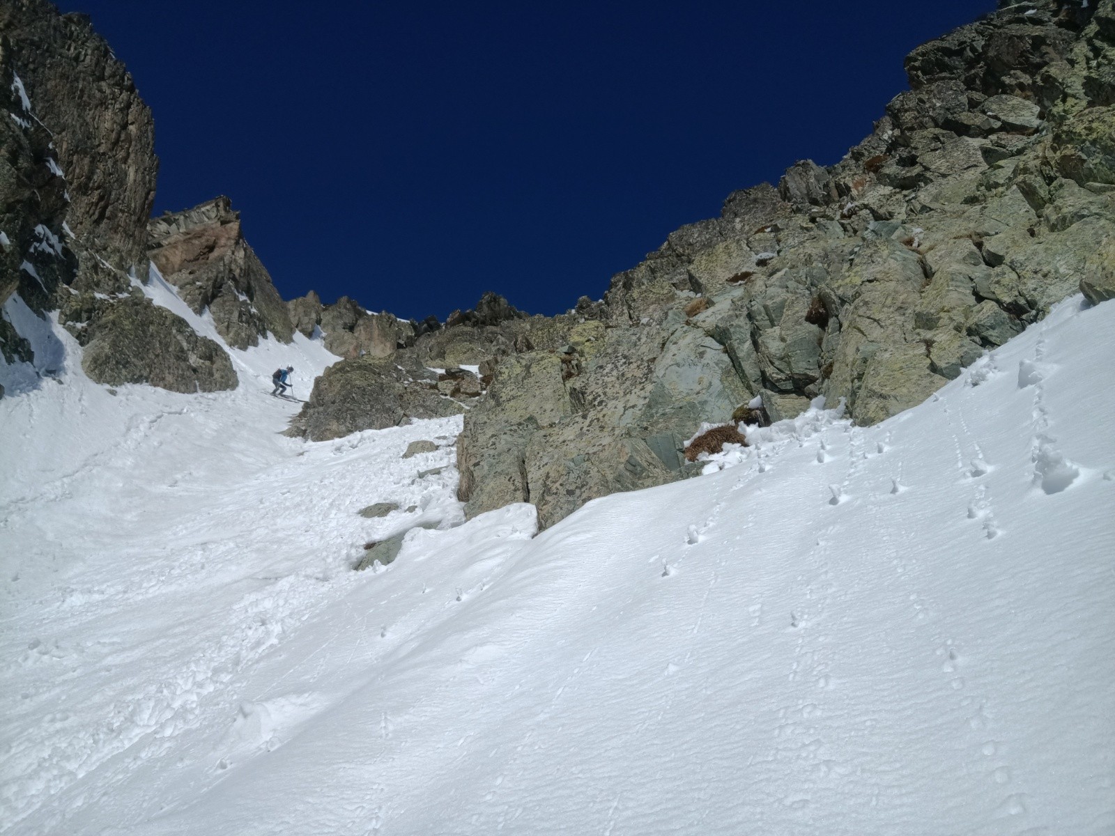 On poursuit vers l'épaule sous le Villonet, la face SE est un peu sèche en haut, on avisera quand on y sera, ça se trouve le temps d'arriver au sommet ce sera pourri. Le petit couloir d'accès en E est bien remplie et très sympa. Un peu de brassage au milieu des cailloux ensuite et on rejoint le collu au dessus du couloir N. Au-dessus, beaucoup de cailloux et peu de neige, ça semble assez pourri. On s'arrête donc 30m sous le sommet. De là on hésite, poudre en N, transfo en S? On se décide finalement pour la face SE. Marc me laisse le privilège de la première trace en me disant "je laisse passer les experts devant". Ah, ben, go alors! Une petite étroiture et c'est tout bon, jolie facette décaillée! Petit passage en neige un peu pourrie puis on retrouve une neige dure en traversant qui nous amène à un replat à 2000m. La combe des Roches semble sauvage aujourd'hui !