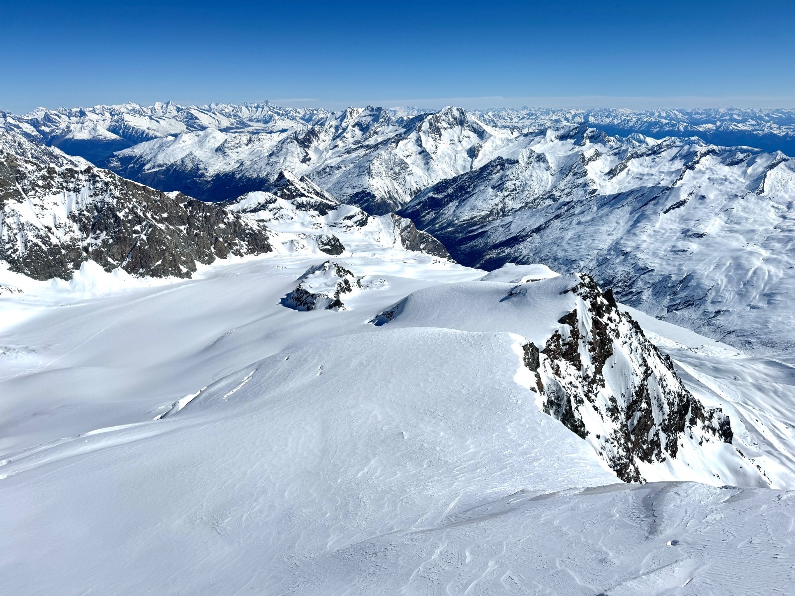 Sommet ultra panoramique avec aujourd'hui une visibilité exceptionnelle pour la saison, du Mont Blanc à la Bernina.