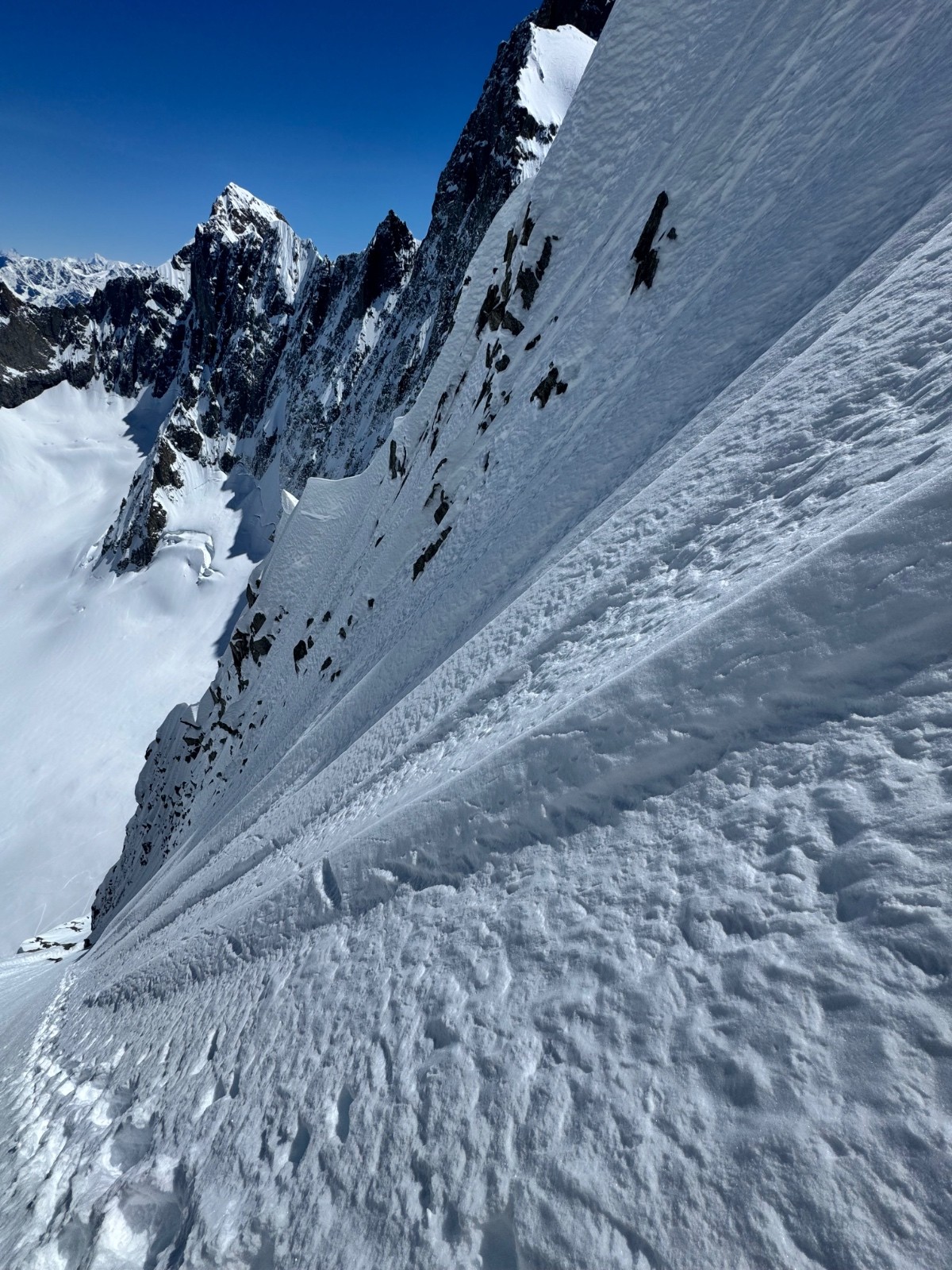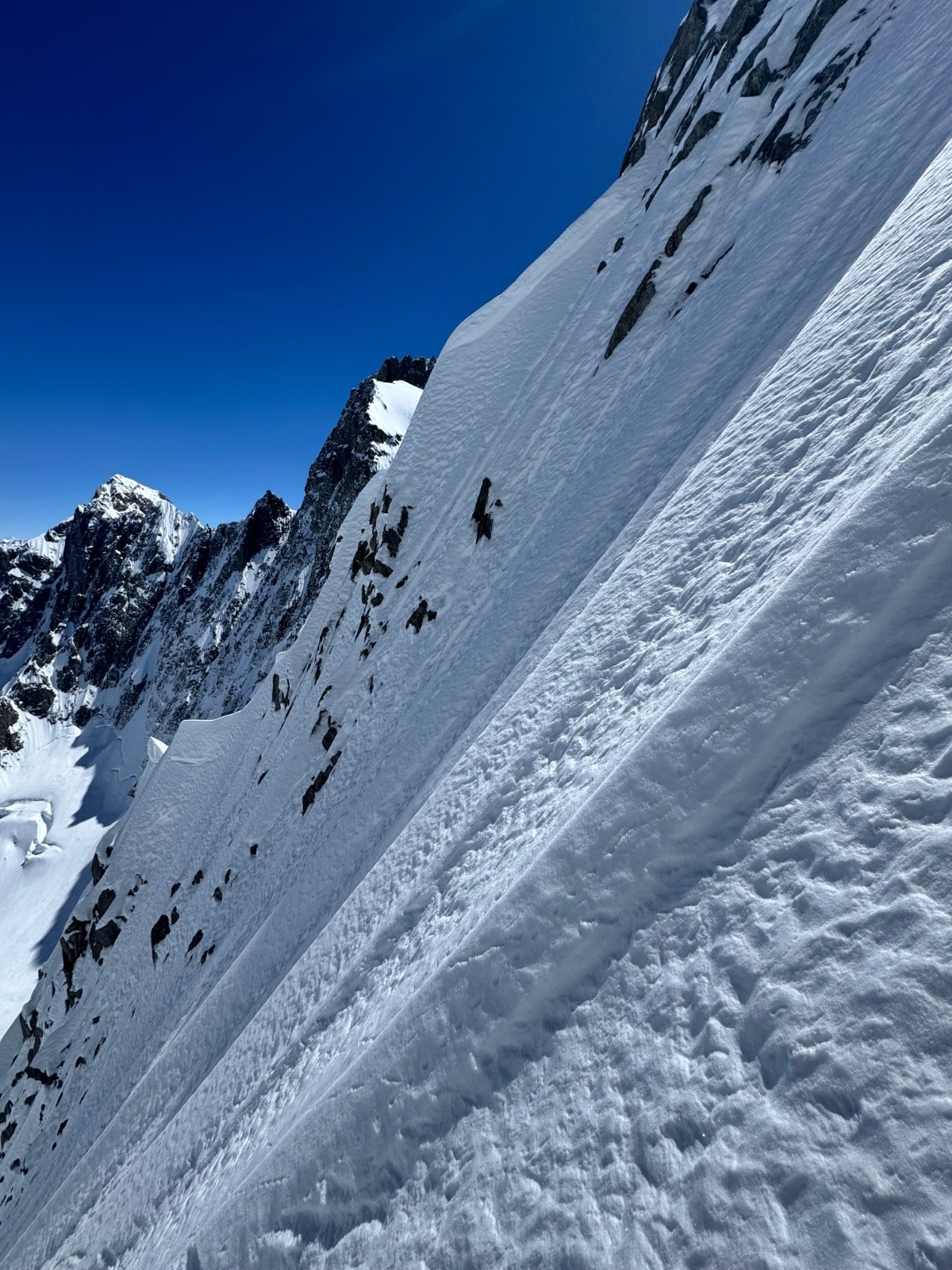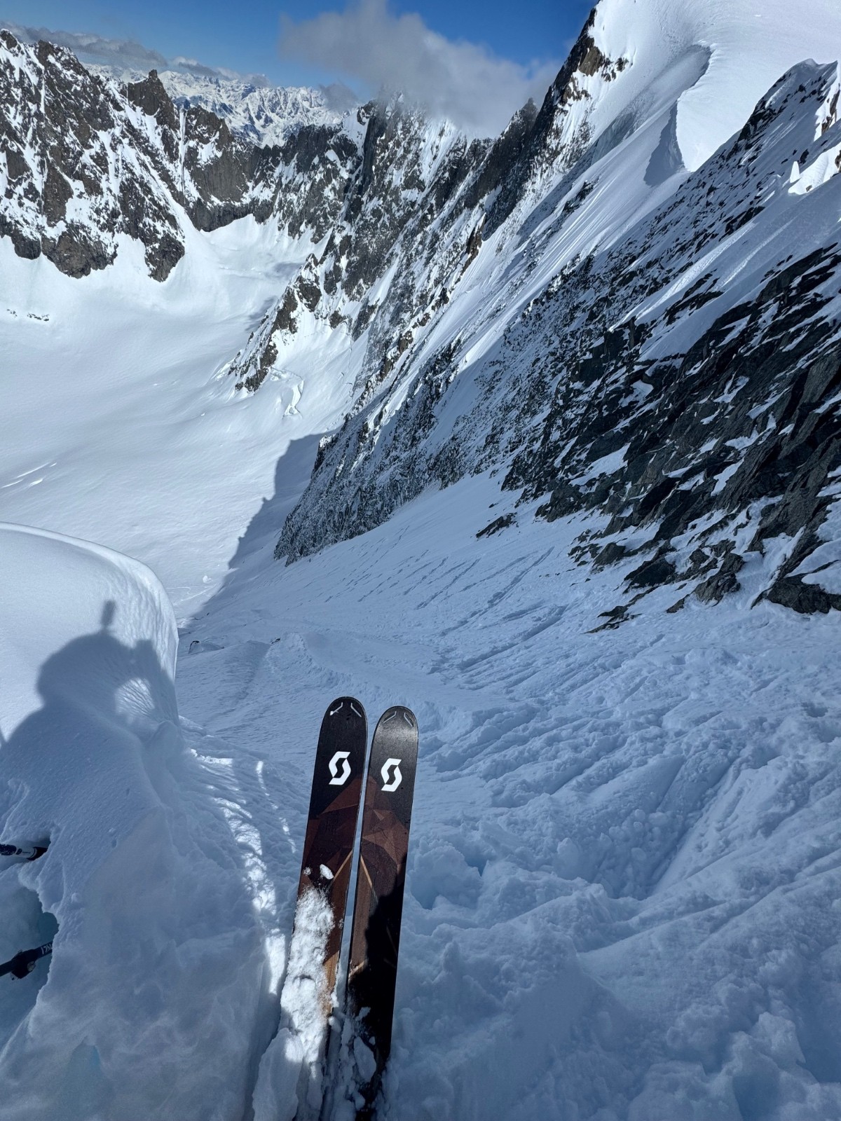 En voyant Eales j’ai envie d’y aller donc ce sera peut etre pour une 2e descente. On monte et il faut viser entre les Spines, l’angle d’incidence du soleil vers le Nord et le reste devient crucial, un bout de Spine tourné vers l’Est légèrement est crouté. Vers le Nord il reste poudre. Ça se joue à rien. La partie sommitale est particulièrement raide, à toucher le bassin dans les virages. Globalement toute la ligne est poudre, le sluff pas évident à gérer.