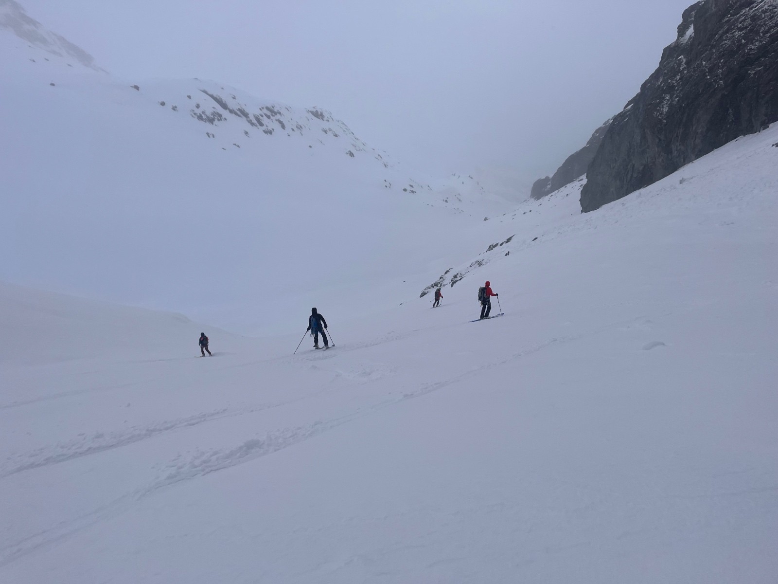 Conditions pour le ski : un peu de poudre ventée sous le Col puis neige pourrie.
