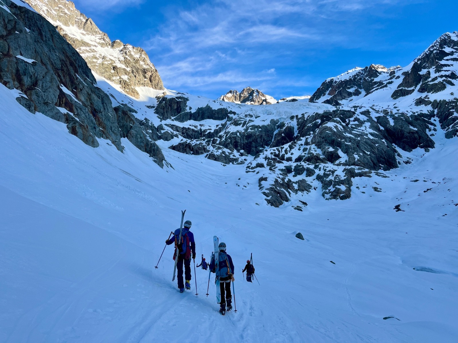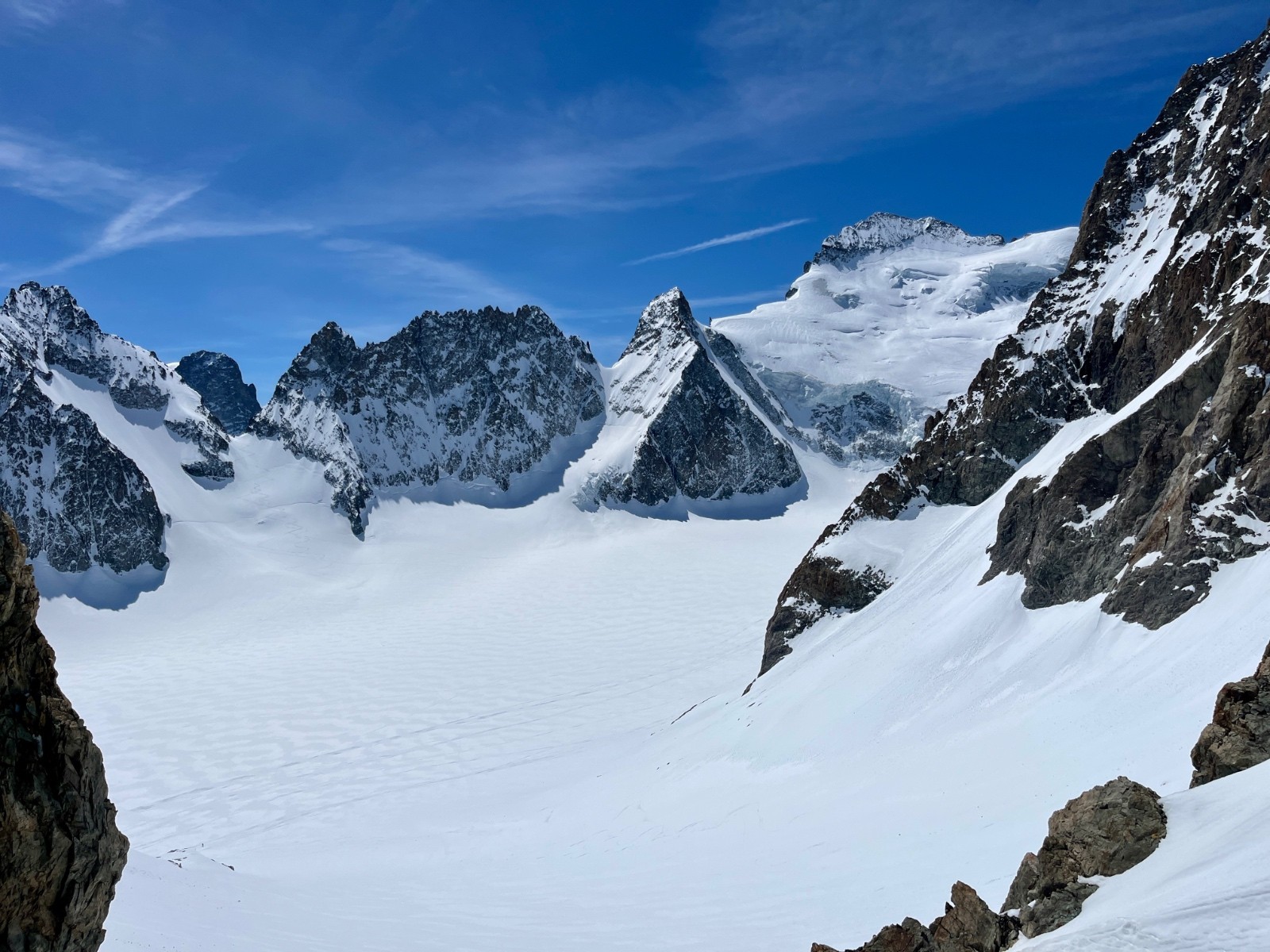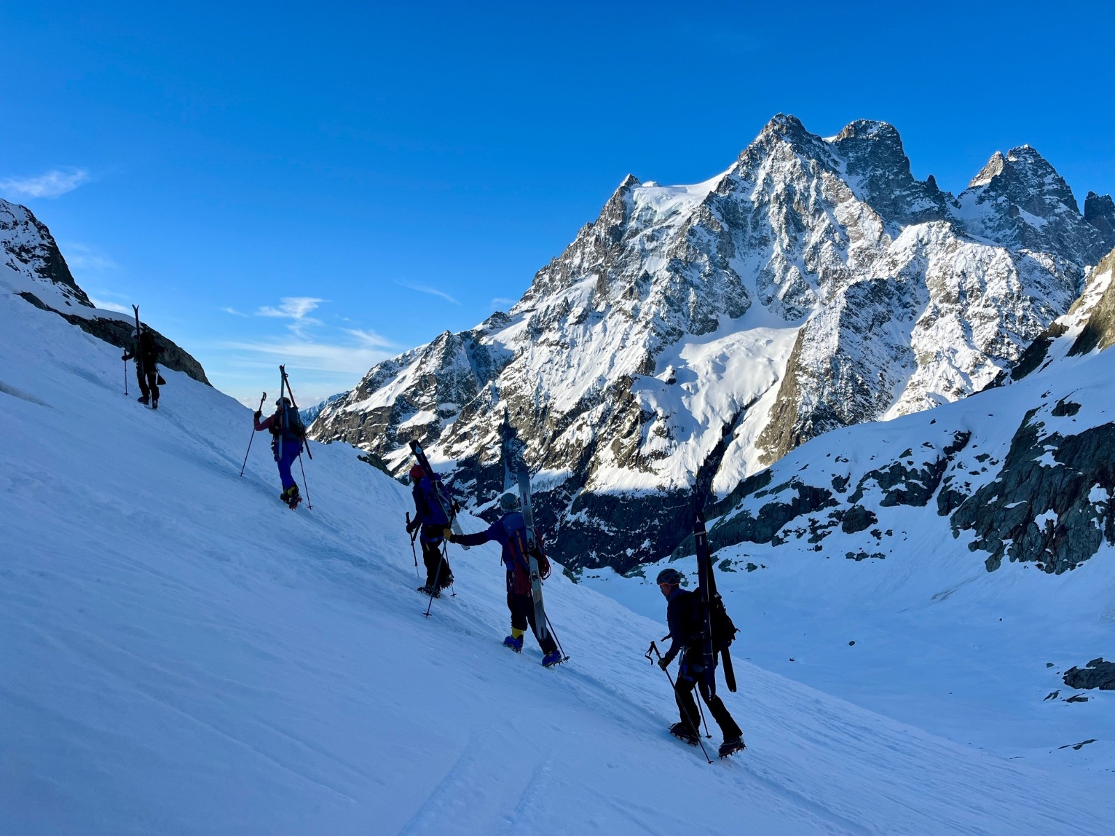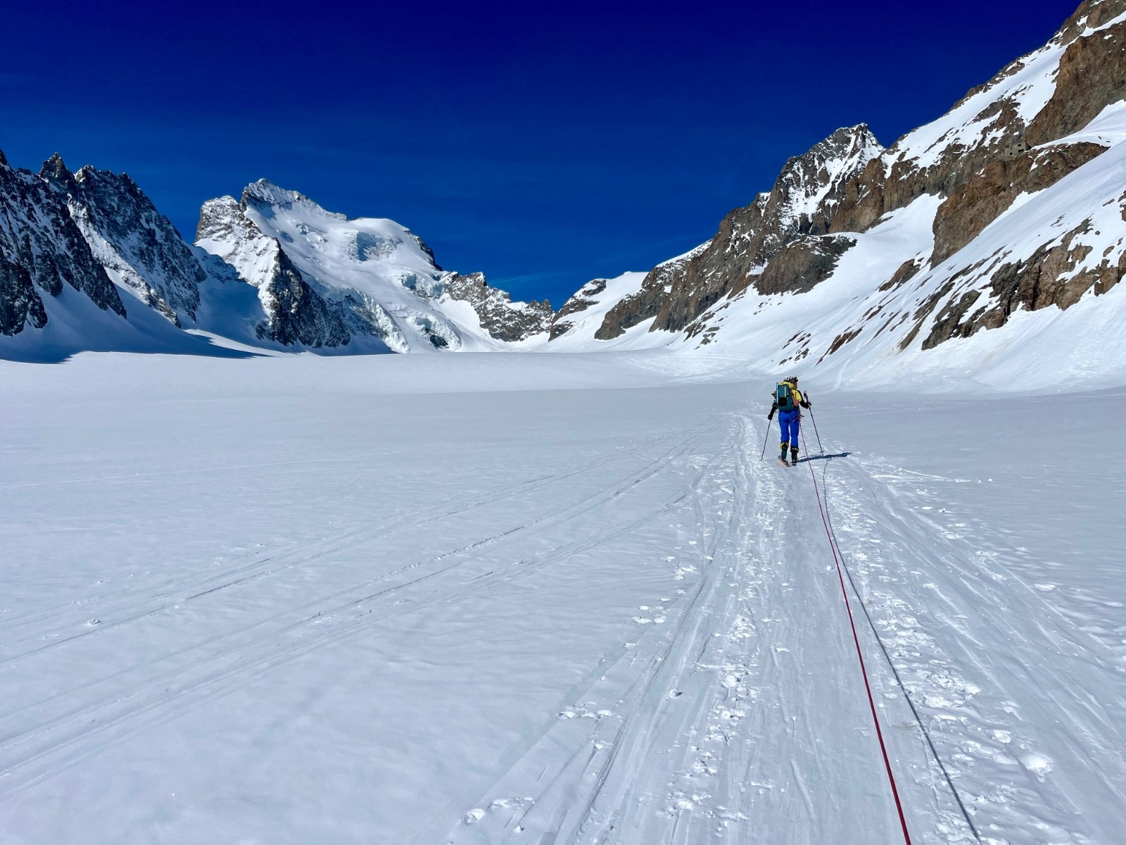 Conditions pour le ski : peu de ski aujourd’hui, puisqu’on a filé après au refuge des Écrins. Descente du col de Roche Faurio en bonne transfo. Sur le Glacier Blanc, il restait encore un peu de neige sèche.