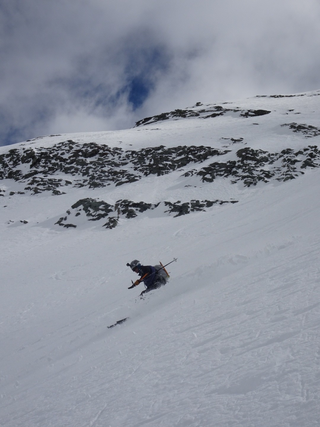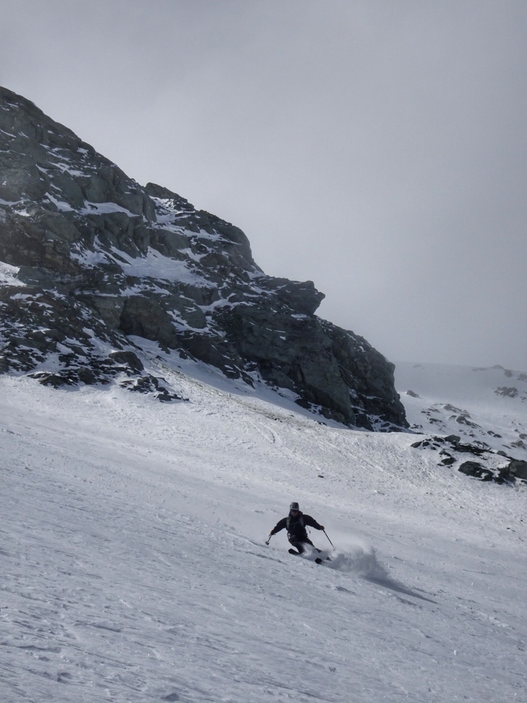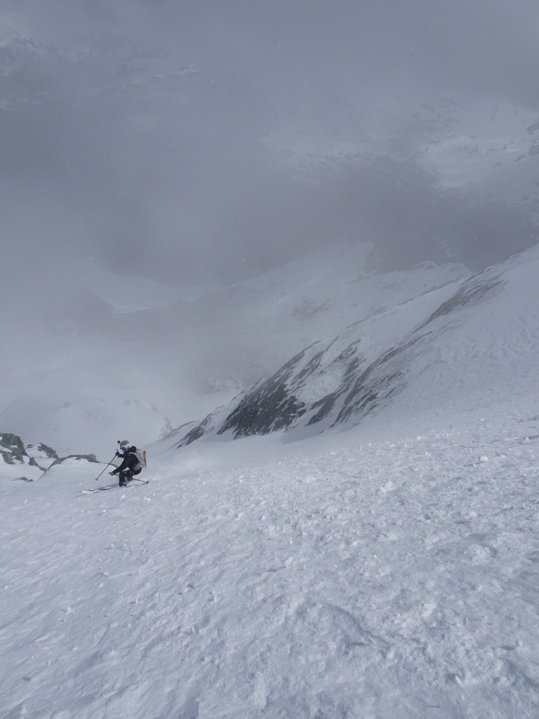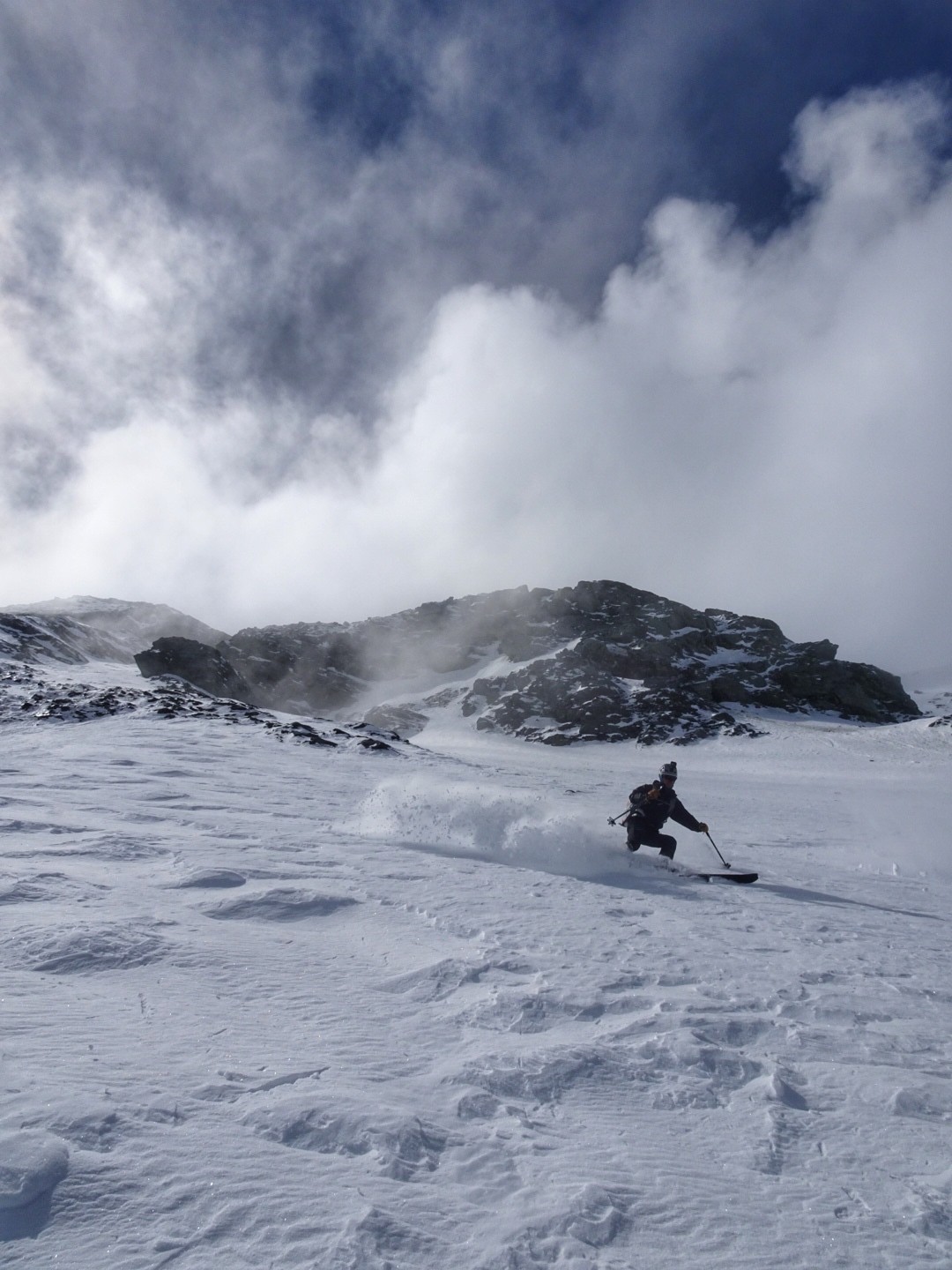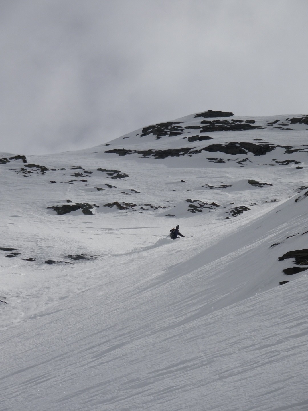 Ducoup on se retrouve en haut de la Turia, petite poudre de la nuit (5cm compacte), parfait pour recouvrir les quelques traces! On attend lâĂ©claircie et broaaaap Ă fond dans la face, câest excellent, neige compacte qui permet de skier bien fort, plus bas transfo trĂšs glissante miamm !