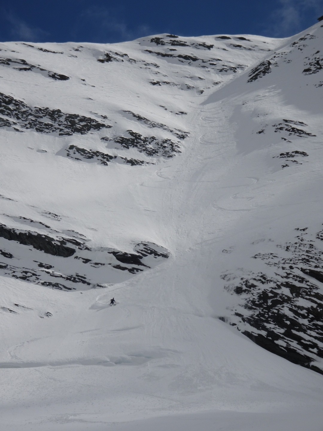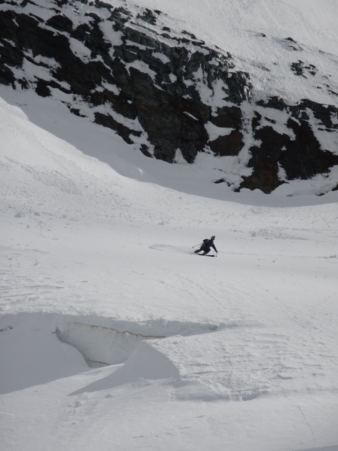 On repeaute pour visiter le versant NE du glacier de Turia, jolie passage de rimaye, on continue jusquâĂ mis face, neige au top, puis petit Ă petit on trouve une neige un peu trop dure, on enfonce presque pas le pouce donc câest trop limite pour continuer, on signe le but⊠Mais un se console par un superbe couloir en belle poudre tassĂ©e et tout le glacier lisse en poudre-moquette! On remonte Ă la station pour finir sur les piste fraĂźchement damĂ©es bien glissante jusquâĂ la voiture đ!!!