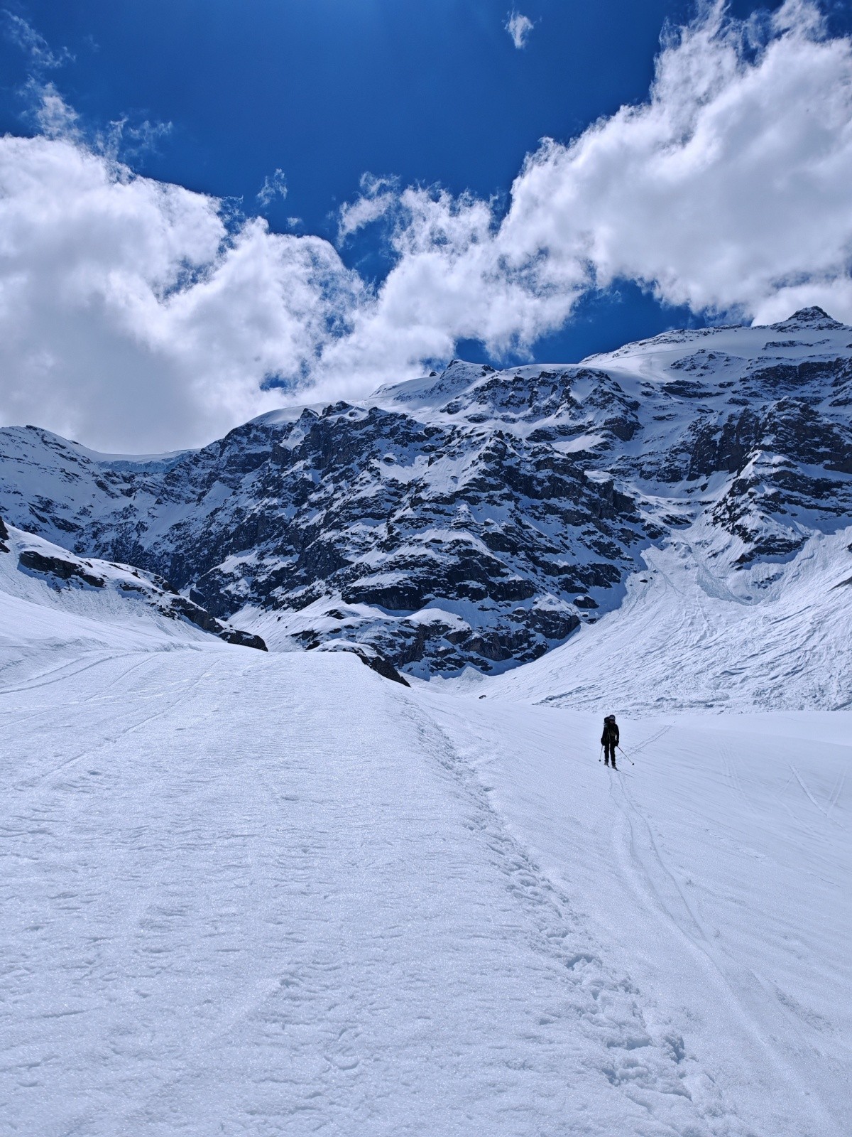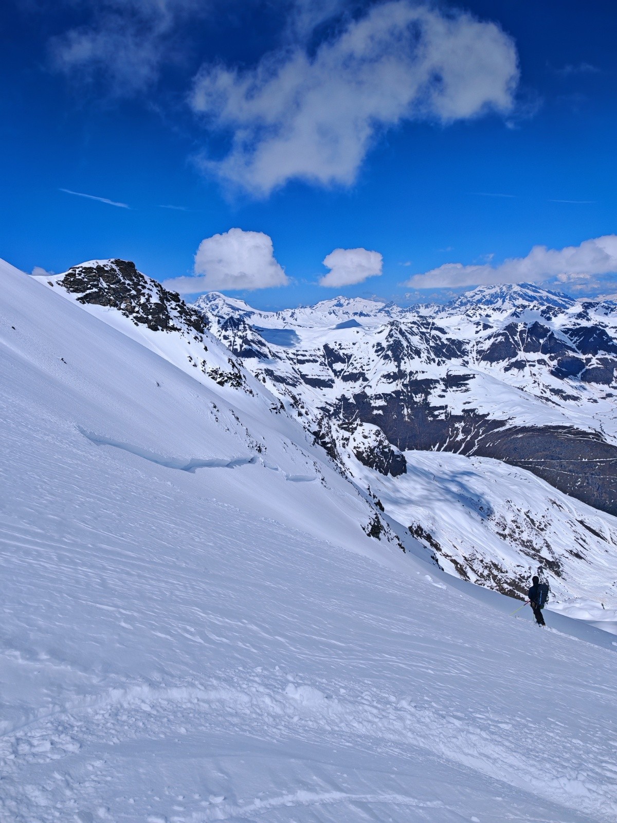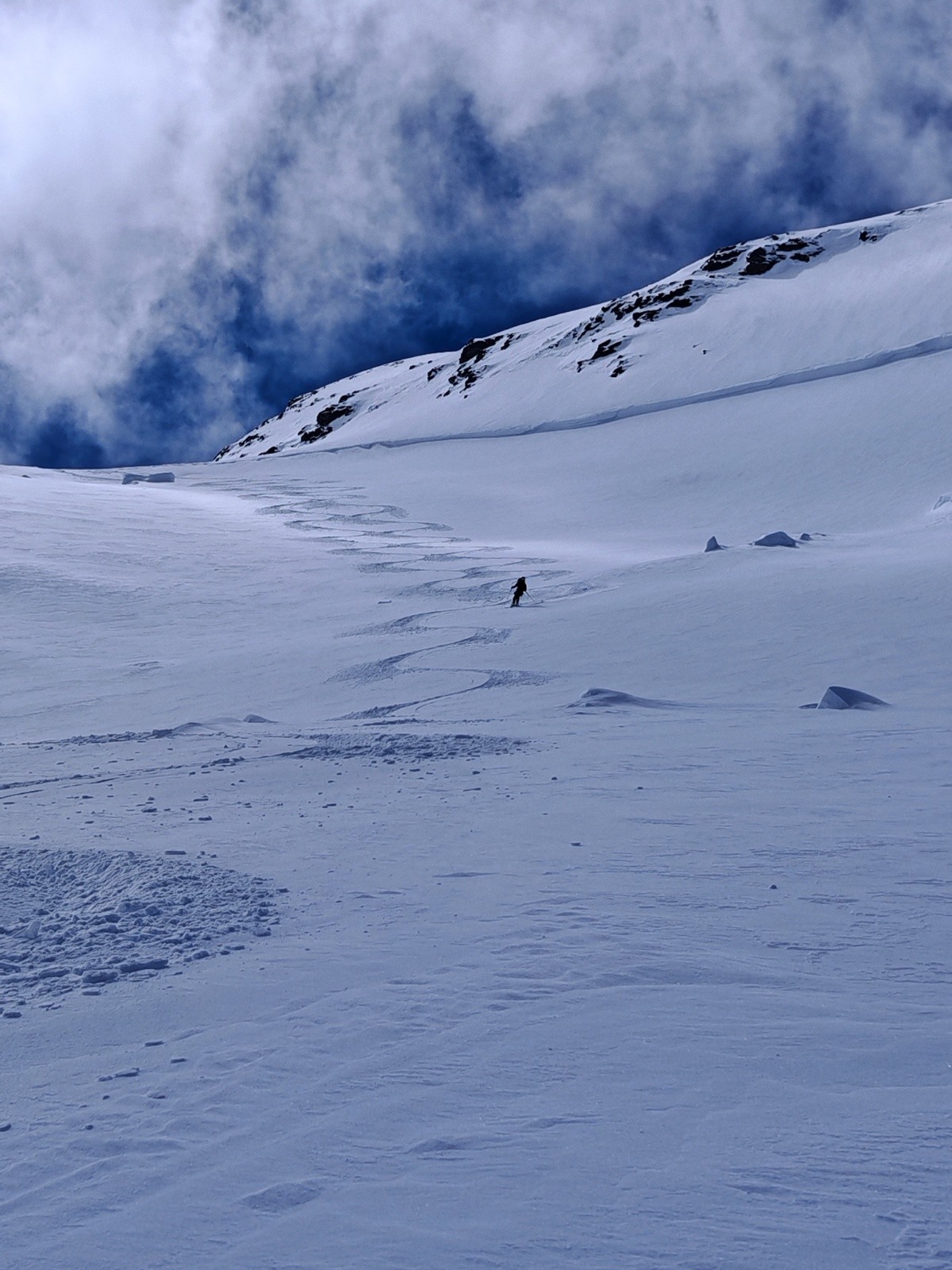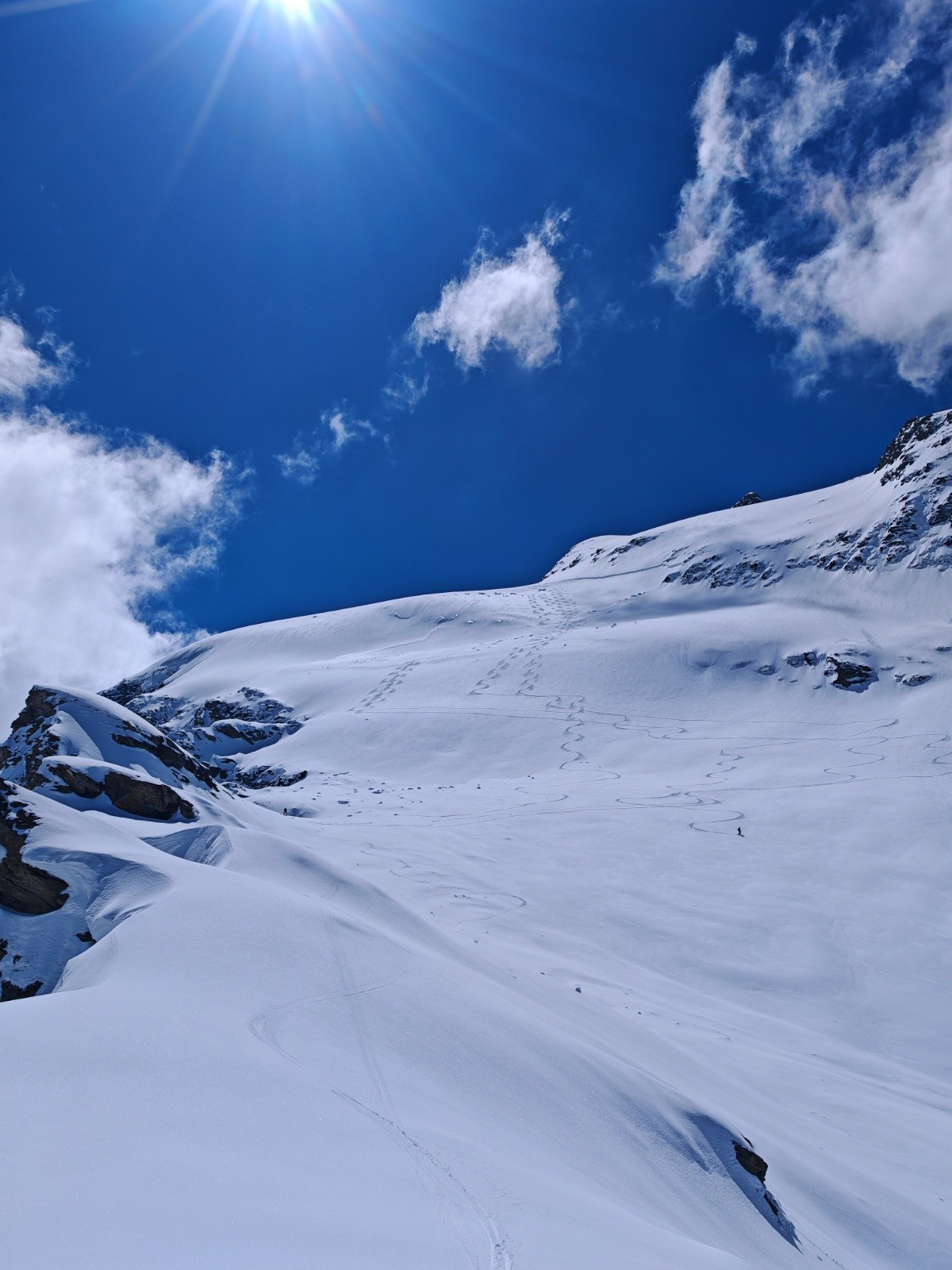 Bonne descente dans ce beau glacier, un peu de poudre, puis un petit passage en croûte et rive D des belles pentes en moquette...