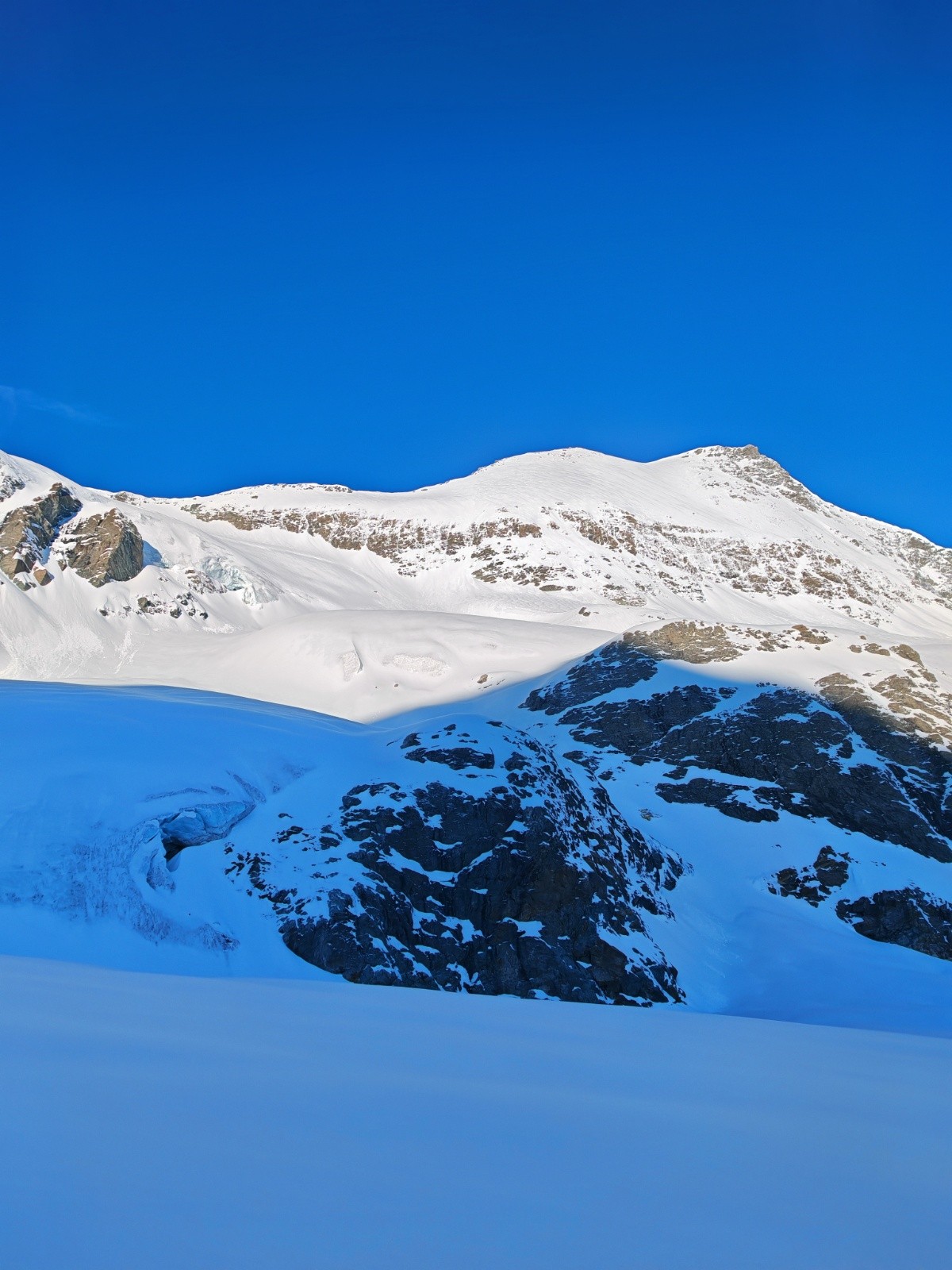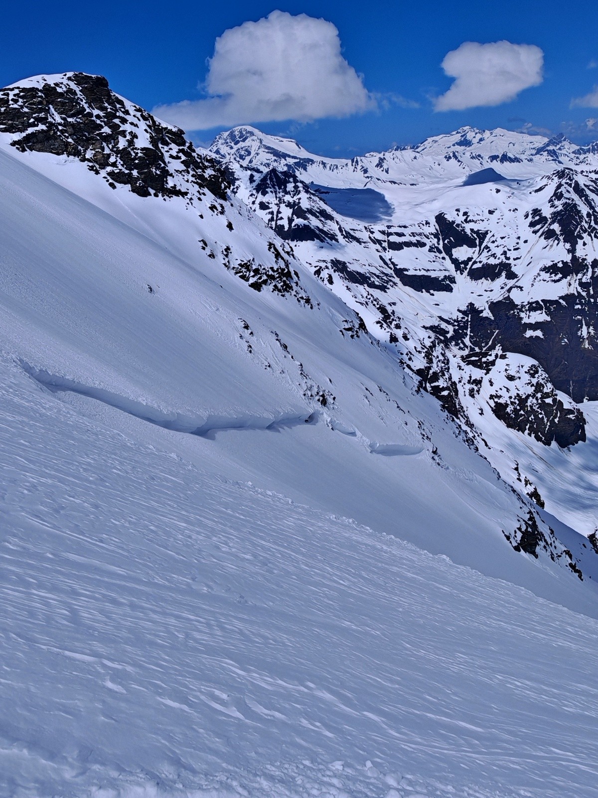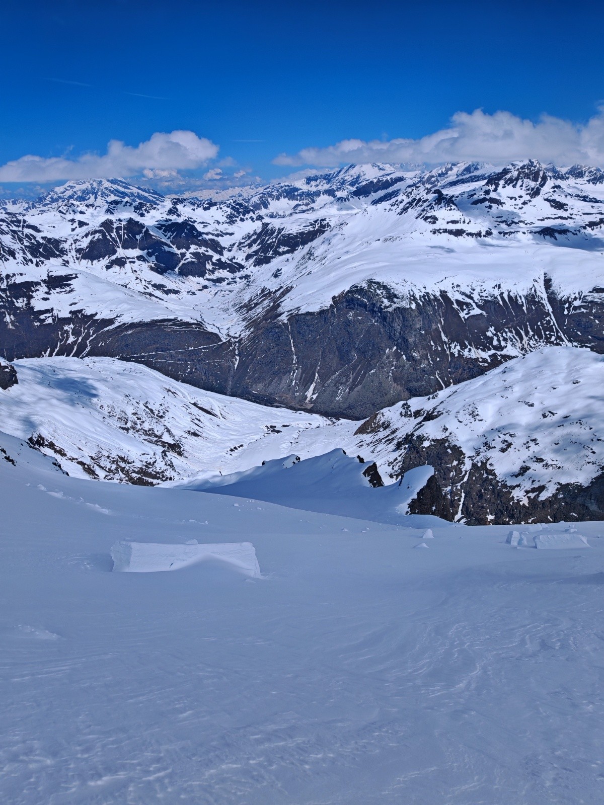 Bonne descente dans ce beau glacier, un peu de poudre, puis un petit passage en croûte et rive D des belles pentes en moquette...