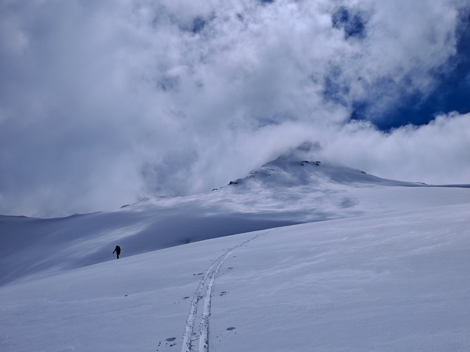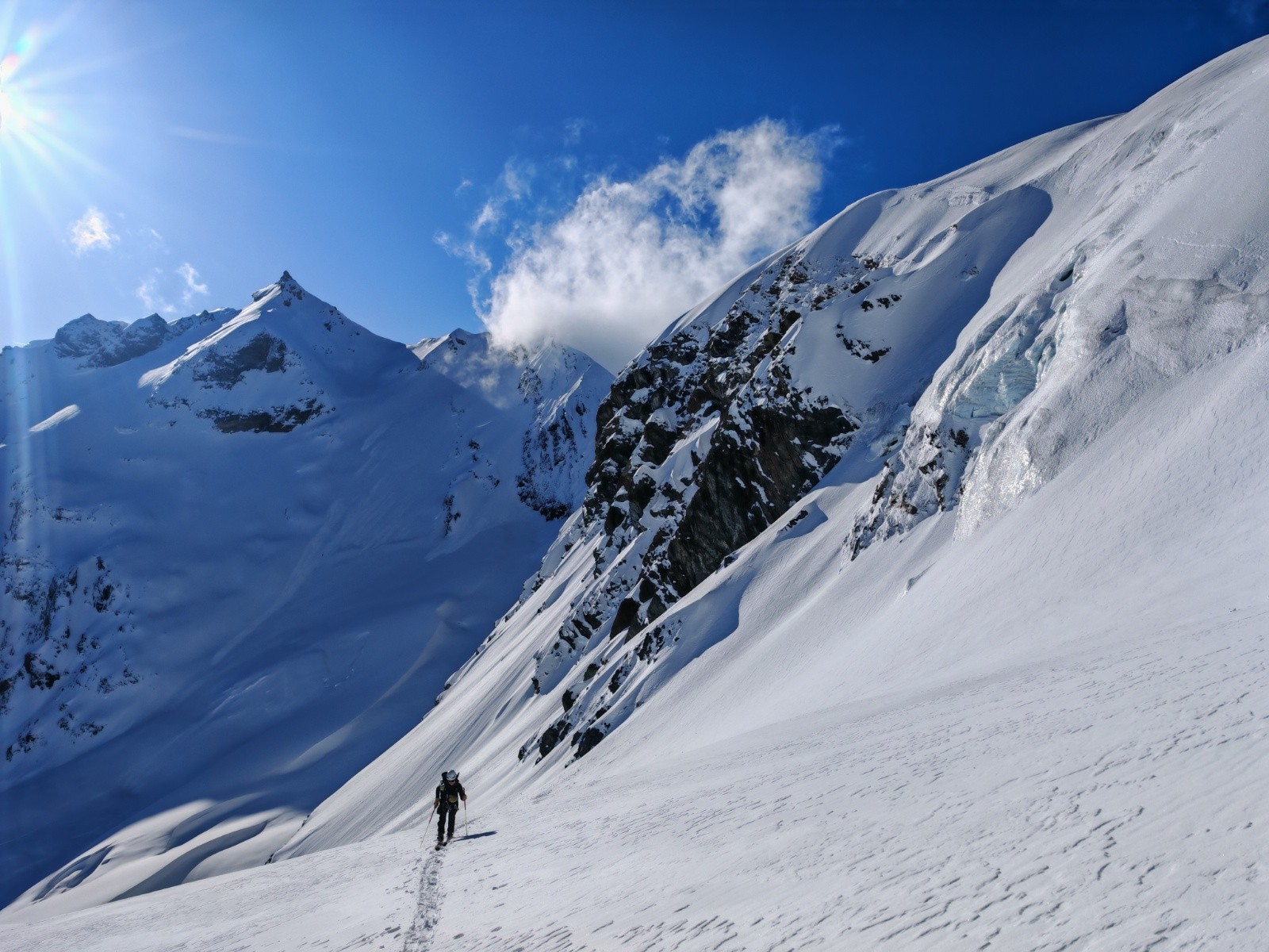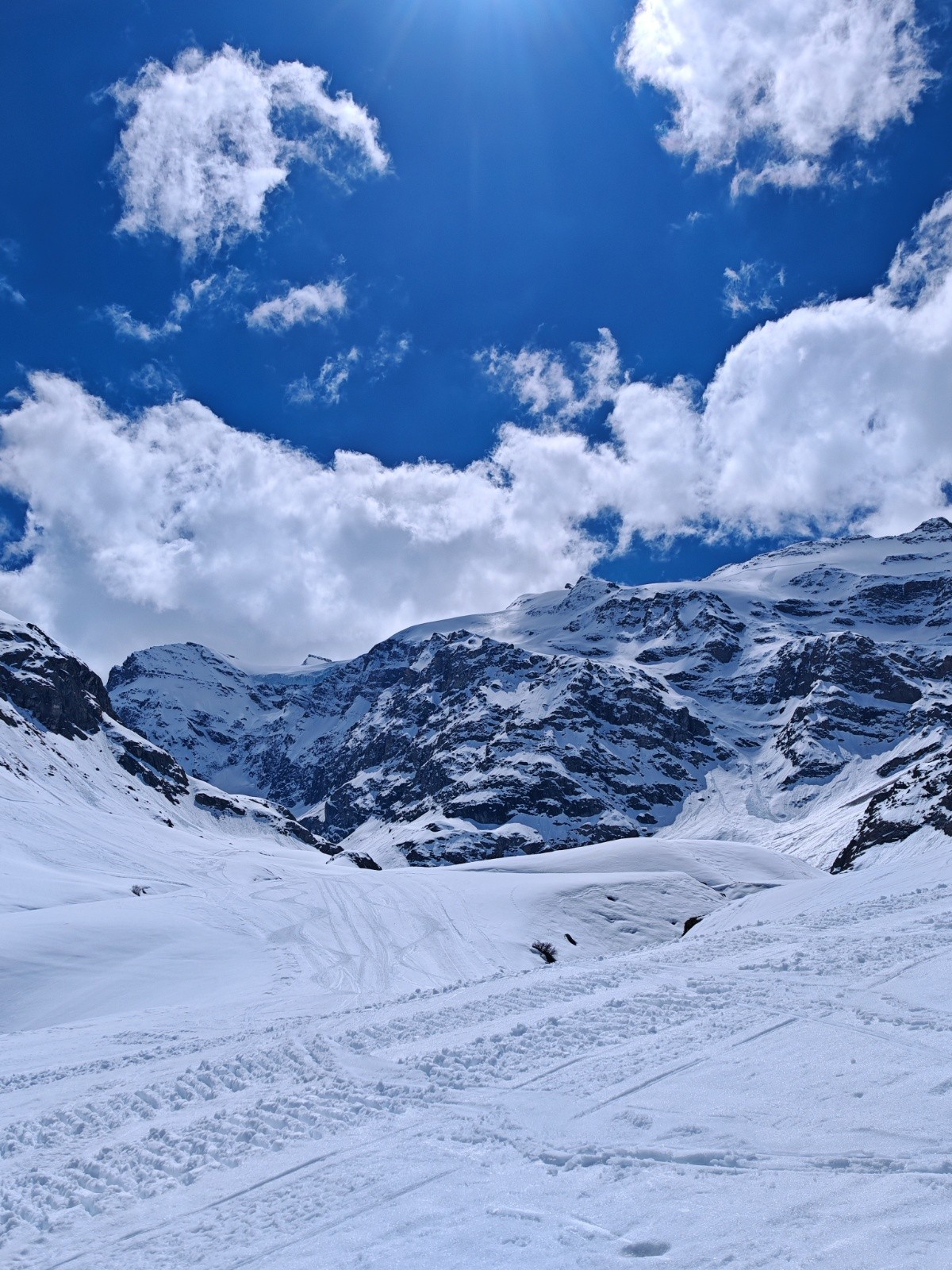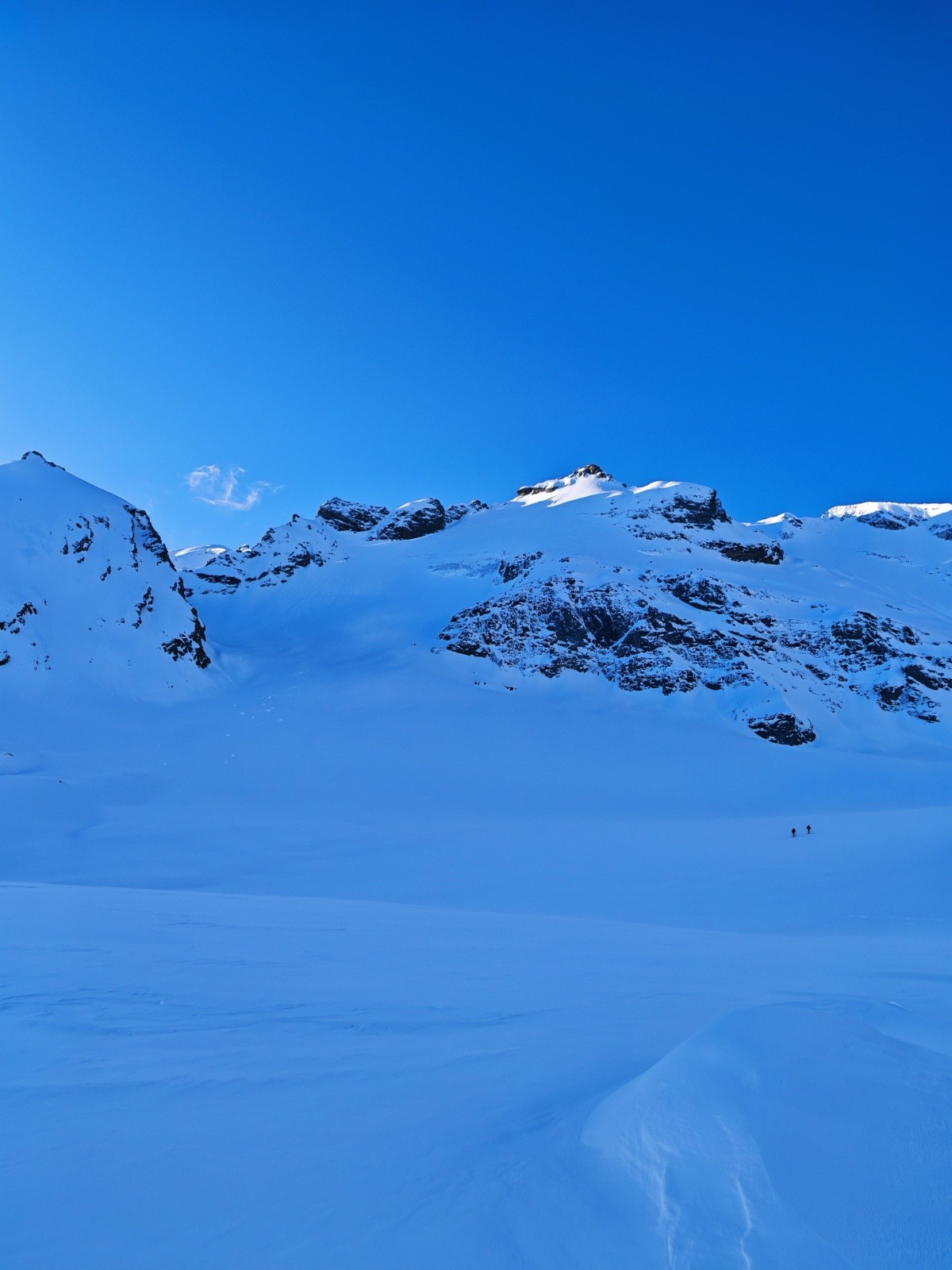 Bonne descente dans ce beau glacier, un peu de poudre, puis un petit passage en croûte et rive D des belles pentes en moquette...