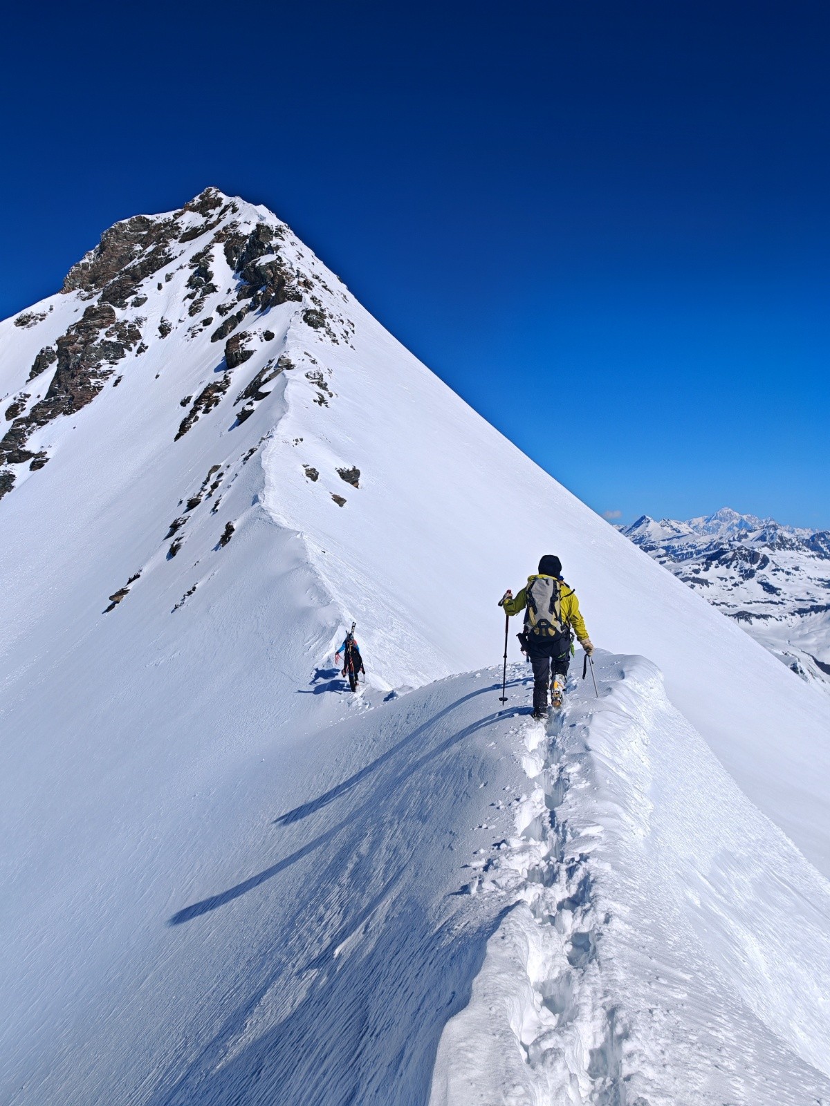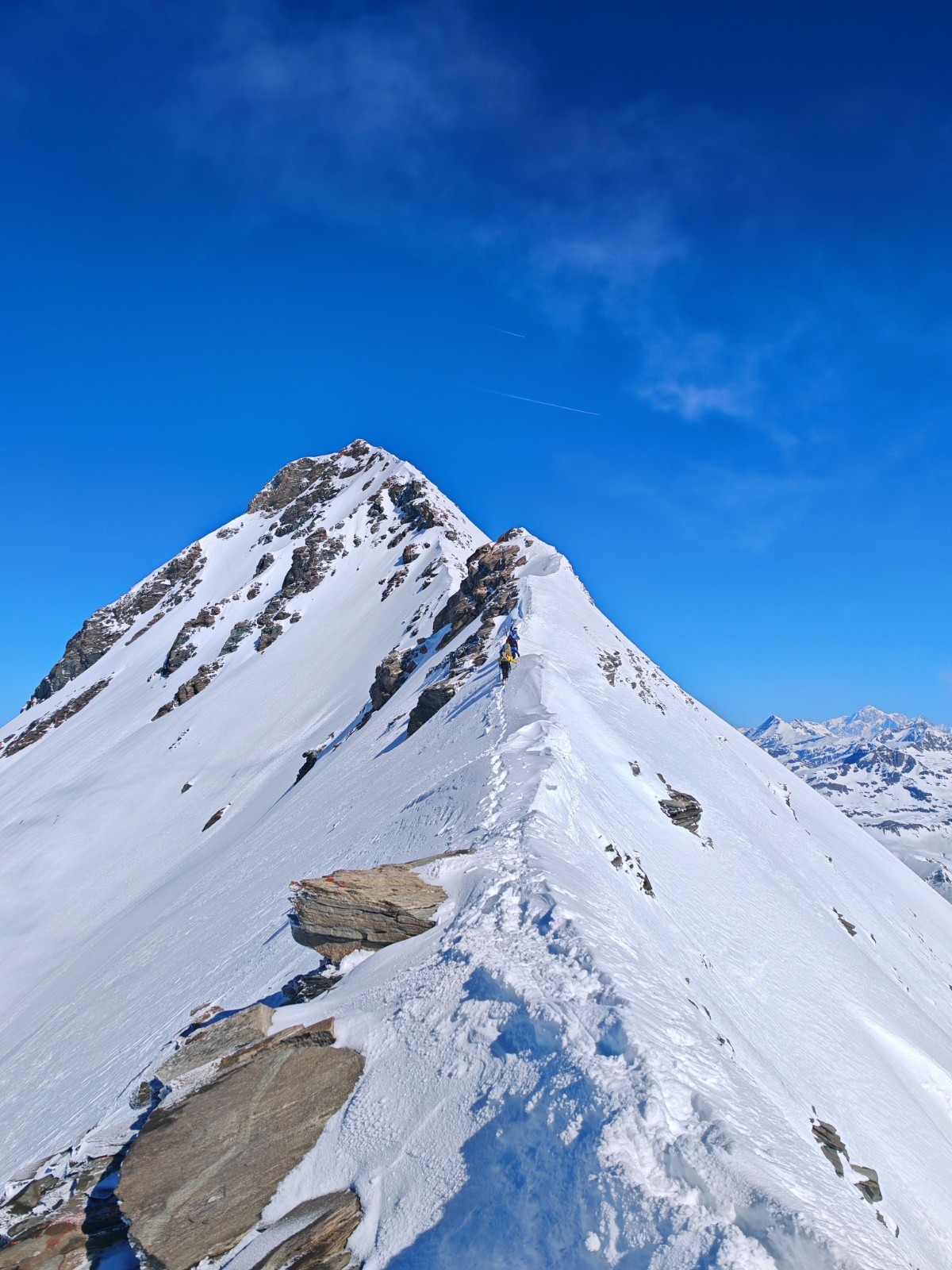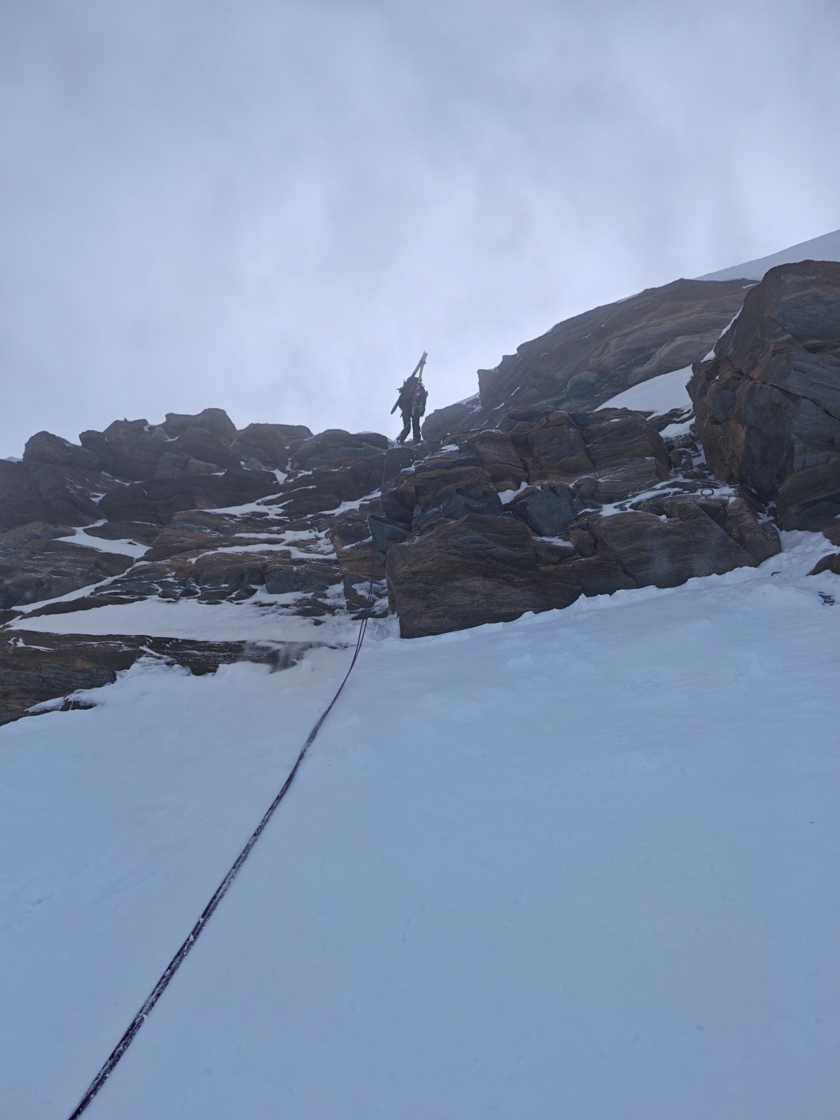 Pourtant c'était pas gagné, car une fois sur l'arête (en très bonnes condis) les nuages nous rattrapent d'Italie et on fini dans le brouillard au sommet pour entamer la descente... Il se fait désirer ce sommet ! 😞 On entame le rappel dans la purée de pois, on attend la fameuse éclaircie qui veut pas venir.... Ça se annonçait mal cette affaire....