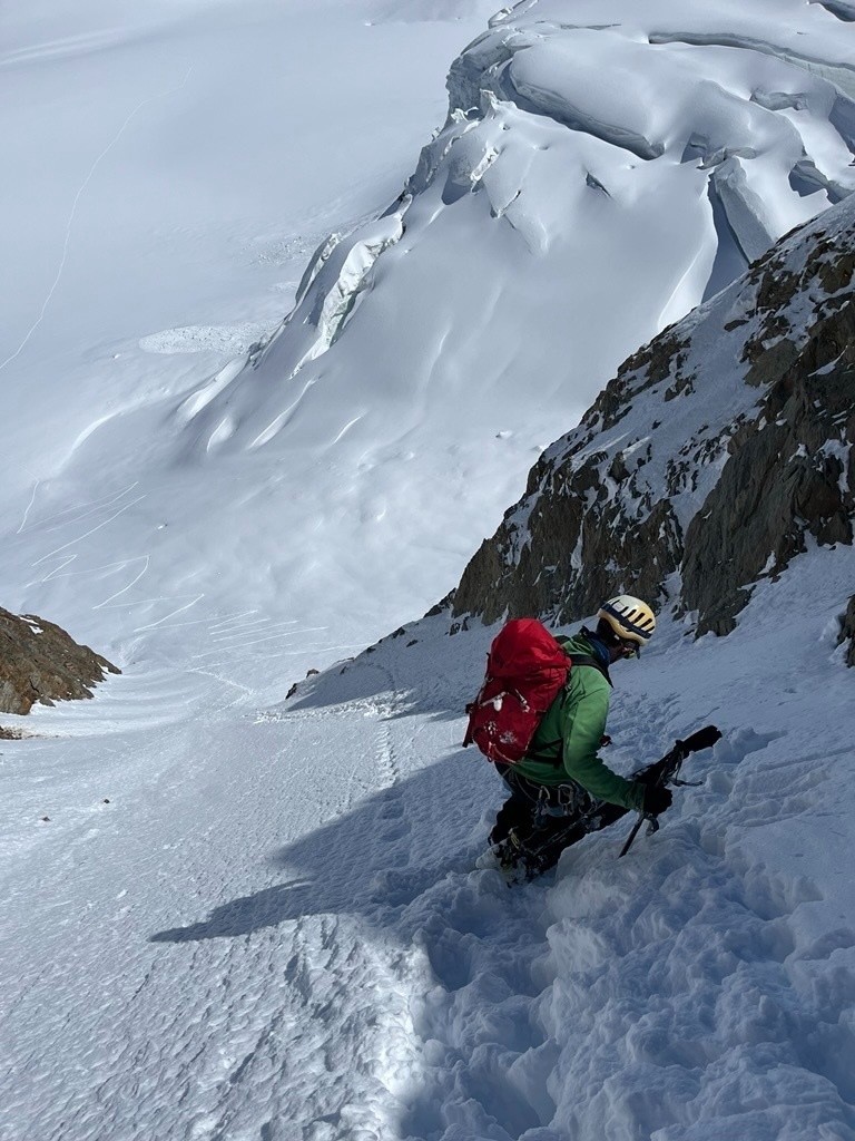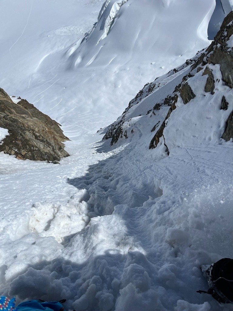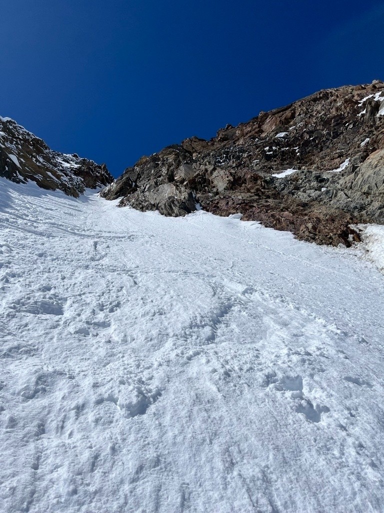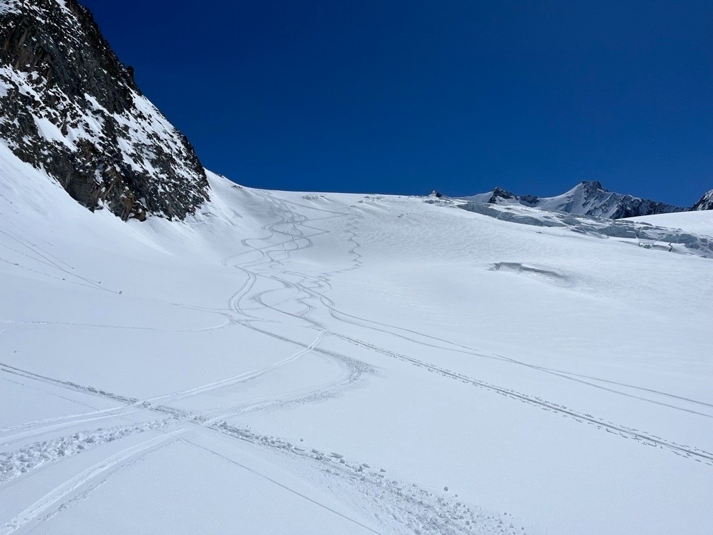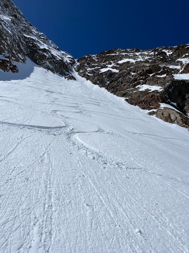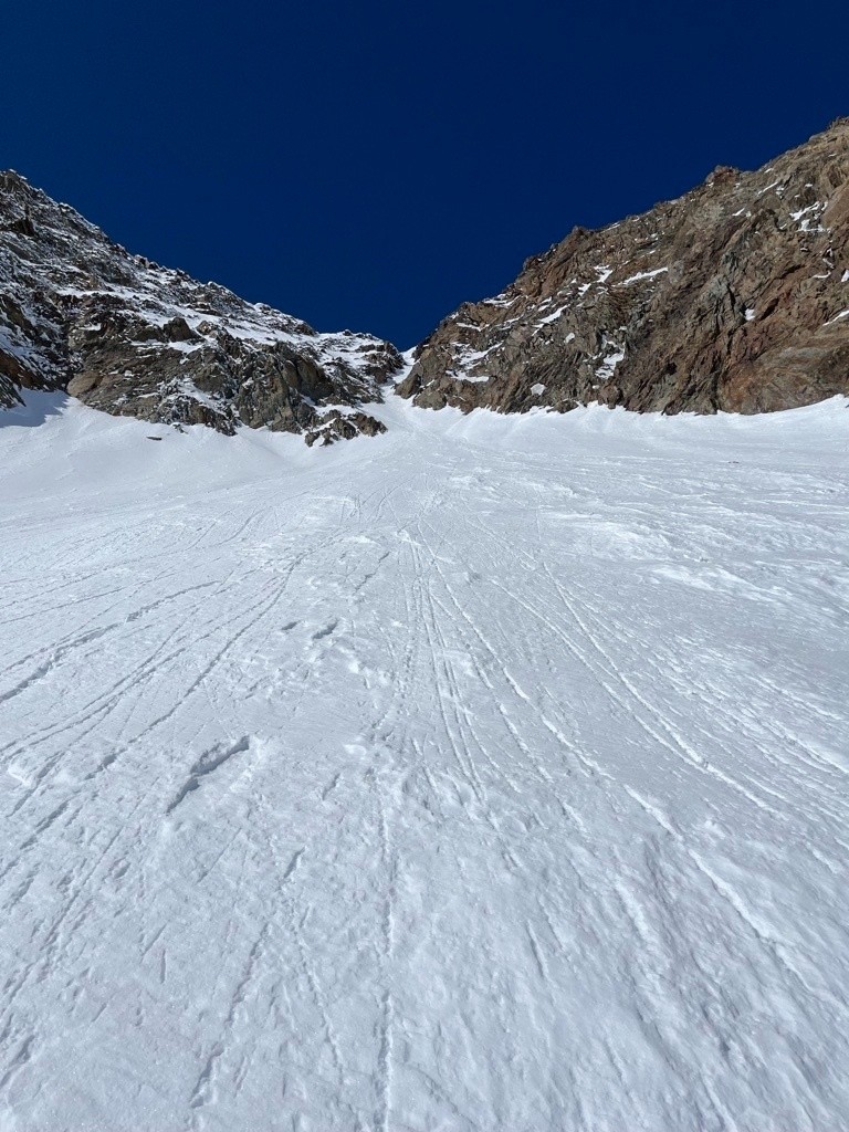 Conditions pour le ski : Couloir et cône 30-40cm de poudreuse *****, sous le couloir la pente N jusqu'au plat du glacier 20-30cm de poudre *****. Jusqu'à 3200m alternance de la bonne poudreuse *****, avec transfo ***** et parfois neige plus cartonnée. Reste jusqu'au refuge plutôt neige de printemps ****