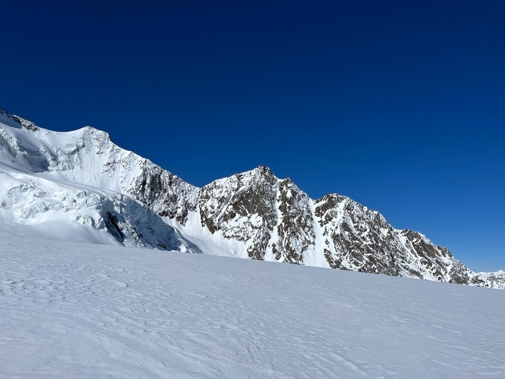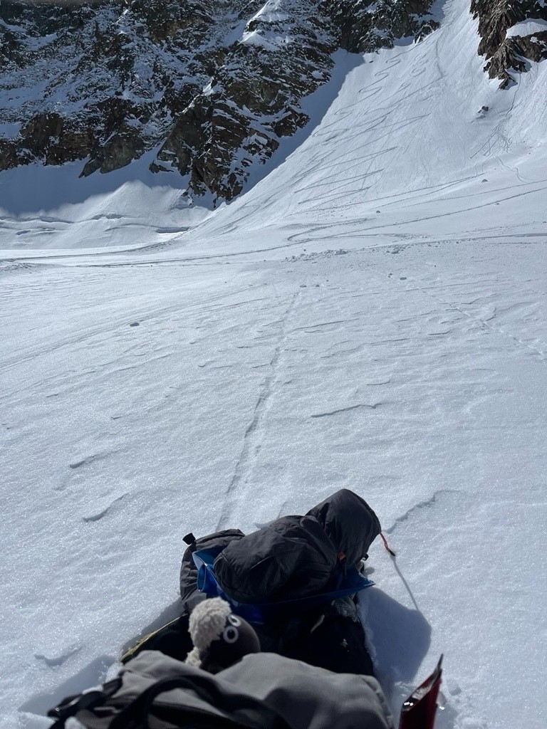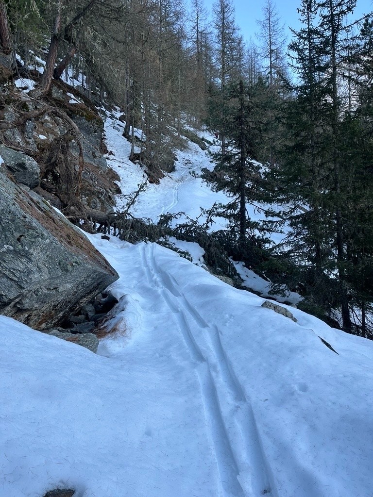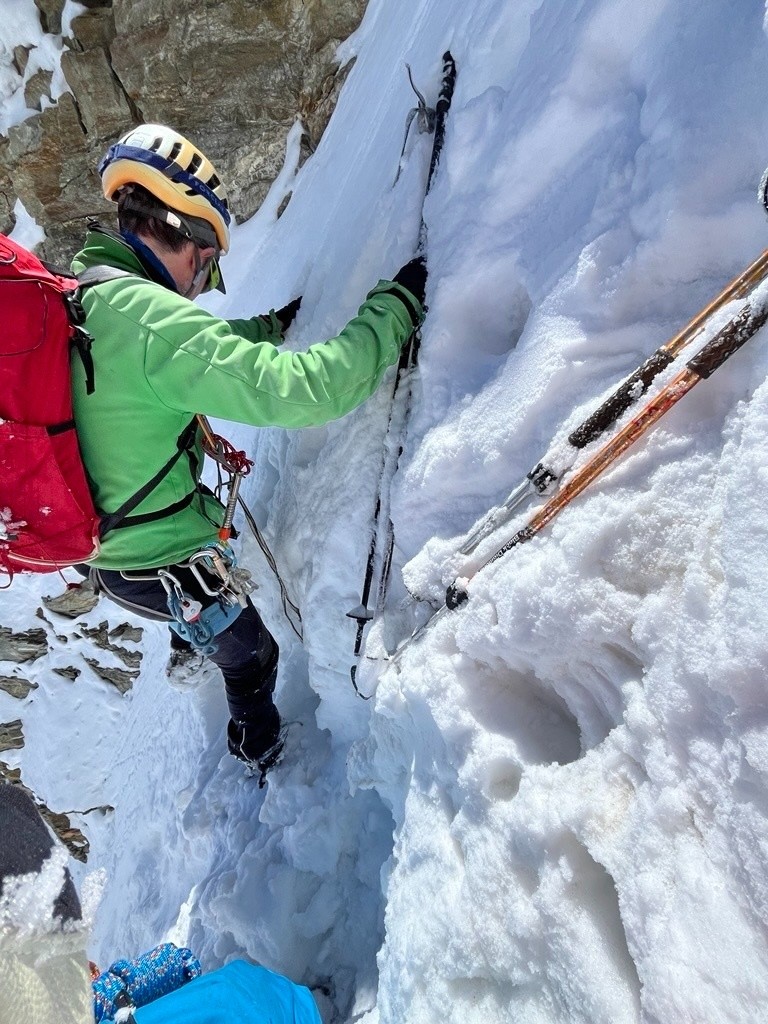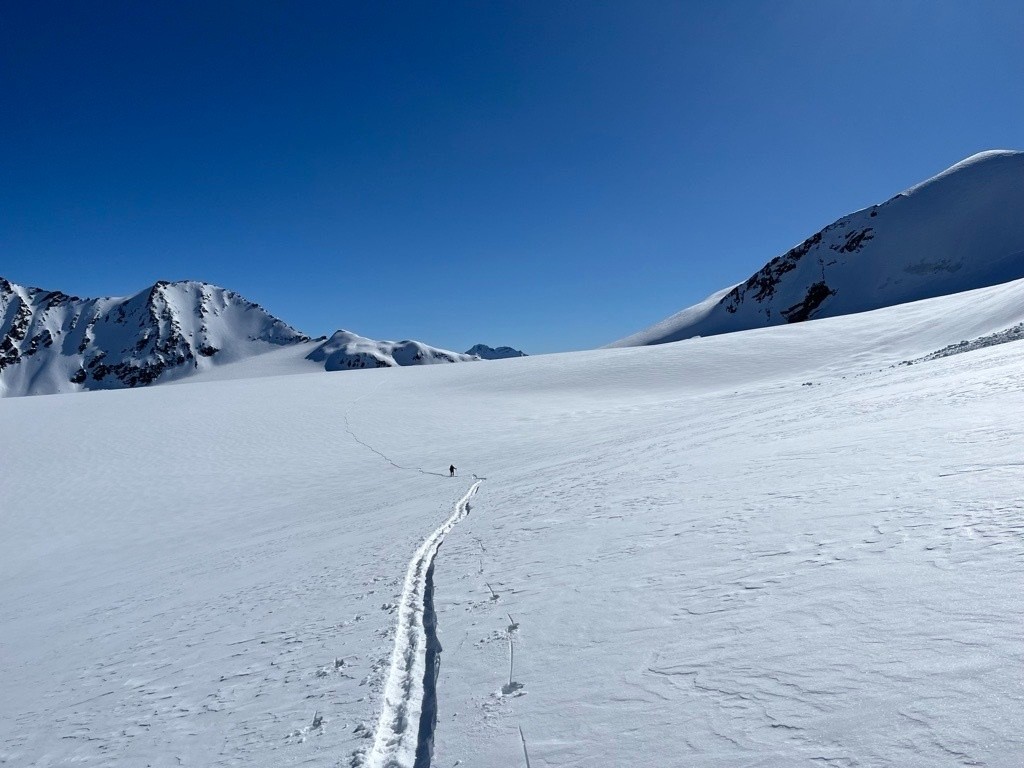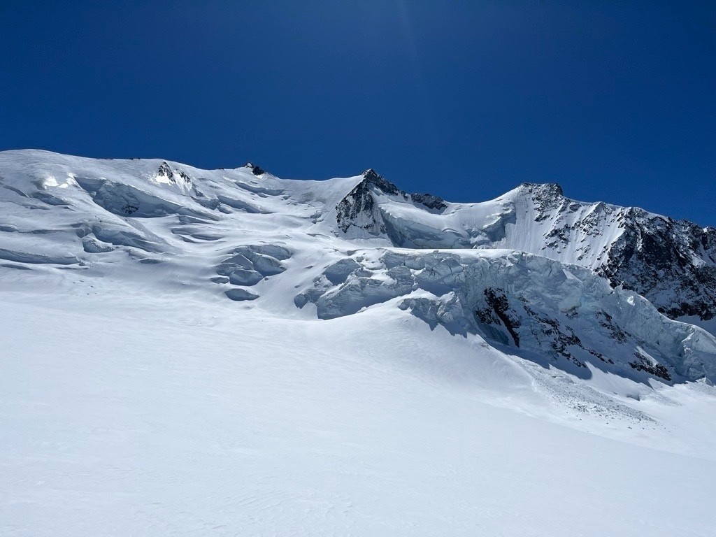 Montée après taf, du coup départ assez tardif après 19h et arrivée juste avant minuit. On a pris rive droite à la montée et franchement c'était le bon choix (on a vu rive gauche à la descente, beaucoup plus de neige pourrie, d'arbres couchée etc). A partir d'Alpja c'est tout bon. La partie échelles-cordes avant le refuge est assez technique parce que la plupart est sous la neige. Départ à 6h le lendemain, on a fait la grass mat'. On tente le Dirruhorn par Dirrujoch. Traçage assez pénible car y a pas mal de poudre. Une fois arrivés dans la partie très étroite après 50-70m ça devient pourri en profondeur (vraiment étrange comme consistance). On la sent pas trop (et en plus quasi impossible de monter). On lâche l'affaire à moins de 100m de la sortie pour profiter de la bonne poudreuse à la descente. Jamais vu le passage vers 3300-3400m aussi bien rempli. Hohbarghorn pas en condition, trop de glace. Stecknadelhorn, peut être ça passe à côté de la glace. NE du Bishorn ne va pas du tout, trop de glace. Par contre arête W du Lagginhorn de loin a l'air d'être exceptionnelle! Belle journée en montagne!