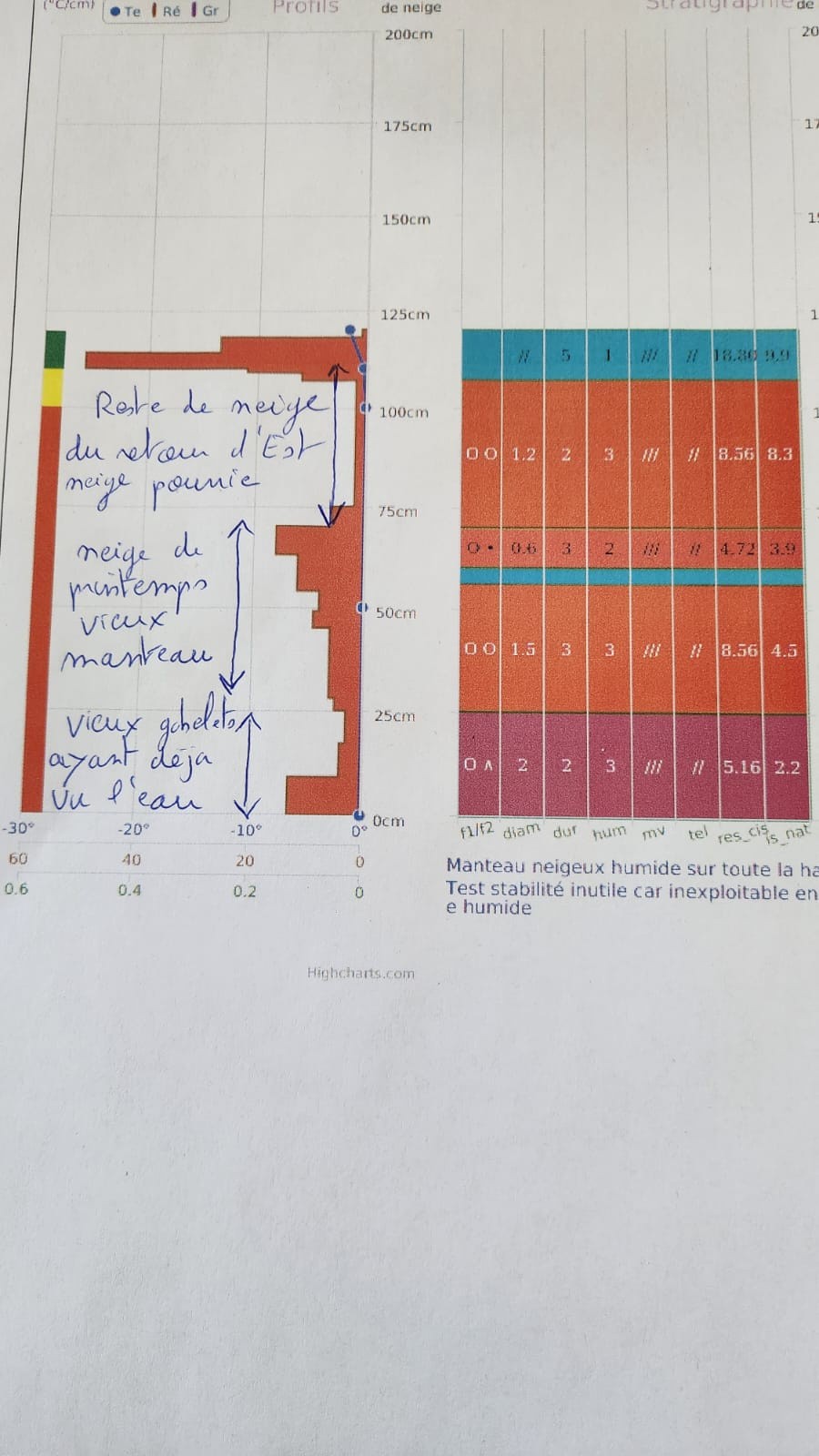 - Sondage vers 2500m, en sud-ouest sous le point haut de la Crête de Montséti : Seulement 1.2m de neige dans cette zone exposée aux vents et au soleil. Encore une soixantaine de centimètres de la neige du fameux retour d’est du 17/04, à plus de 200kg/m3, ce qui correspond en équivalent eau à environ 150mm. Vue qu'une partie a fondu, on imagine qu'il en est tombé bien plus... Ce matin, cette neige avait regelé sur 10cm mais elle est restée pourrie au fond. Plus profond, une vielle croûte puis de la neige pourrie, puis une vingtaine de centimètres d'un mélange de grains rond et de Gobelets peu cohésifs (sur l'herbe), à priori inactivé par l'humidification qui date. Les conditions de printemps sont bien installées au dessous de 2700/3000m, voire plus en sud. Par-contre, la vielle neige qui n'est pas si vielle manque de densité (pourrie non portante). Quand la croute faiblit au soleil et cède sous les skis, on s'enfonce d'un coup dans la pourrie. Une fois la croûte fondu, on ski de la neige pourrie en profondeur donc lourde et peu portante...