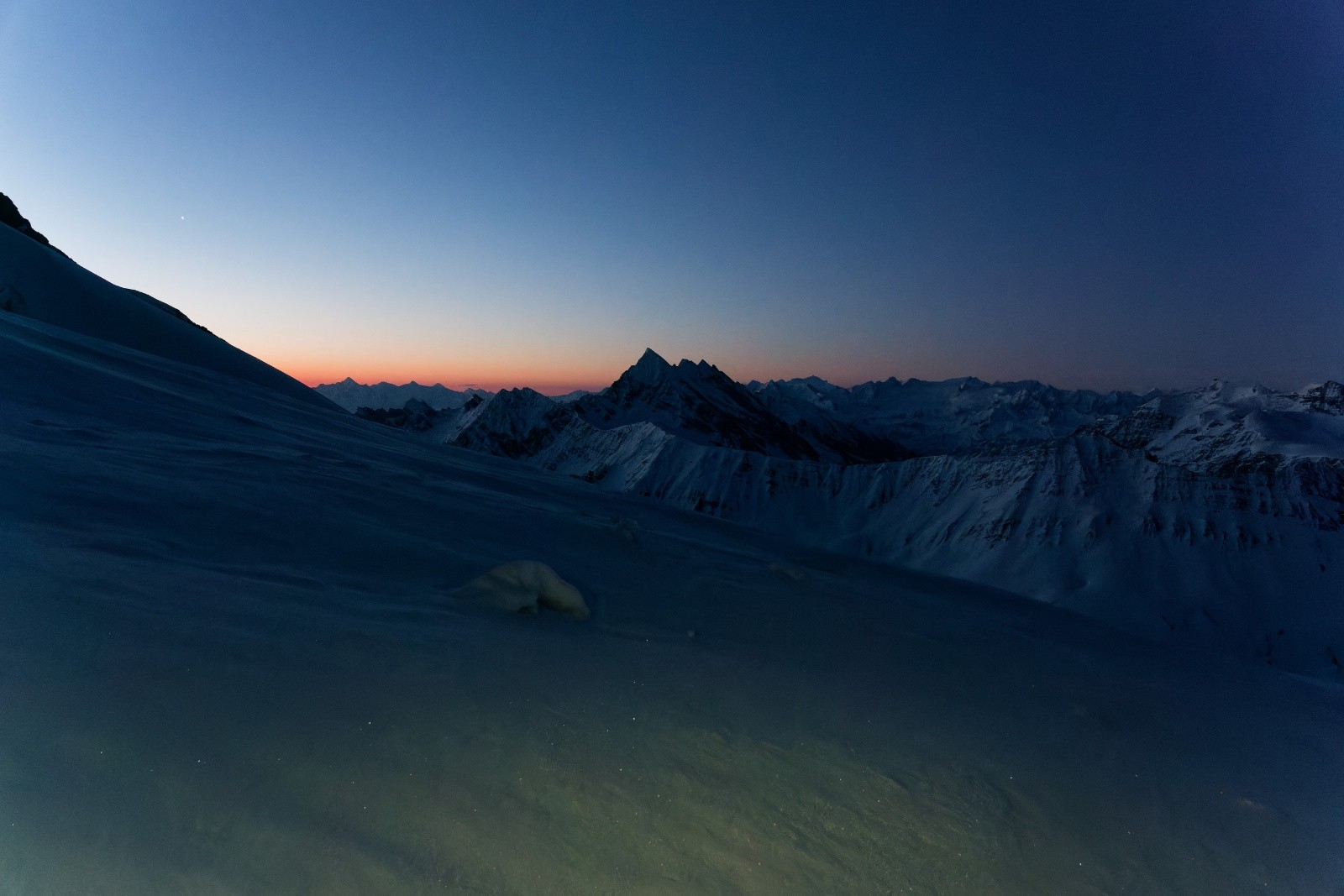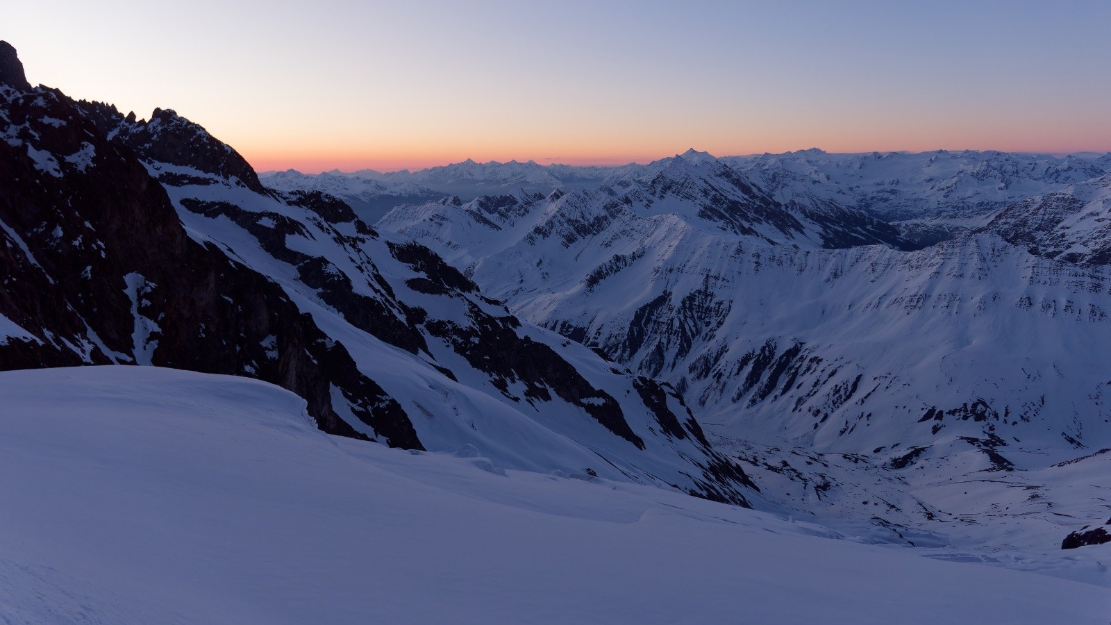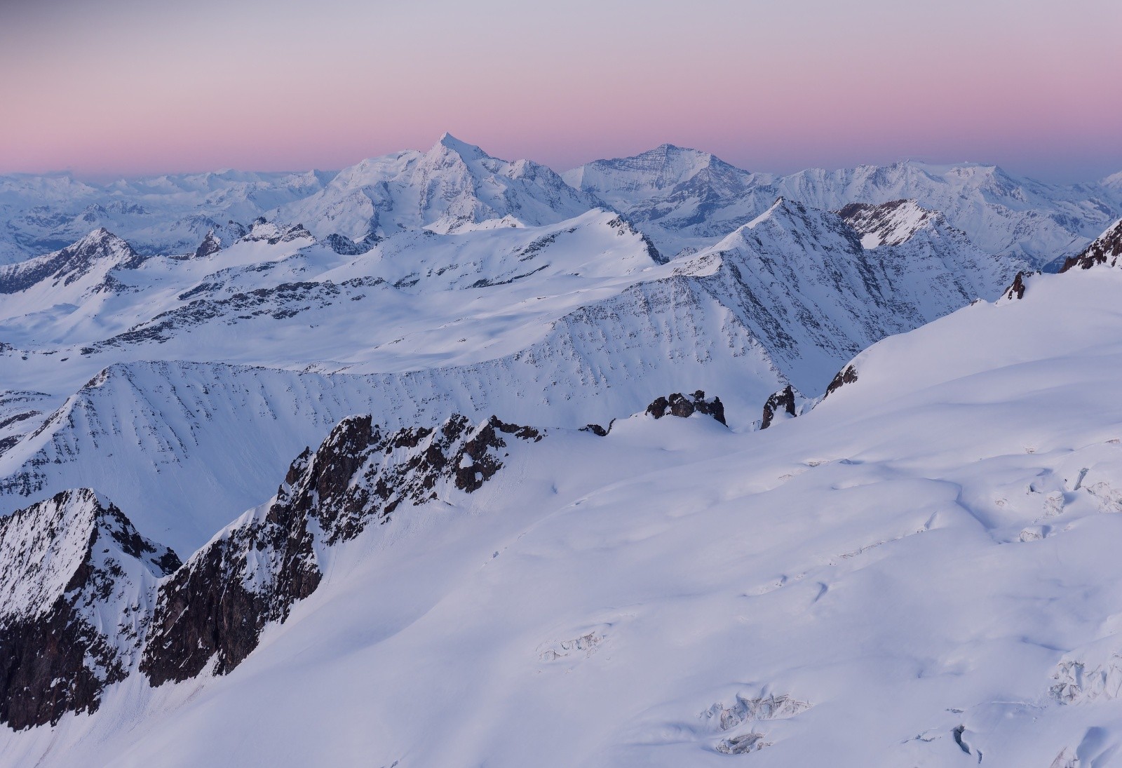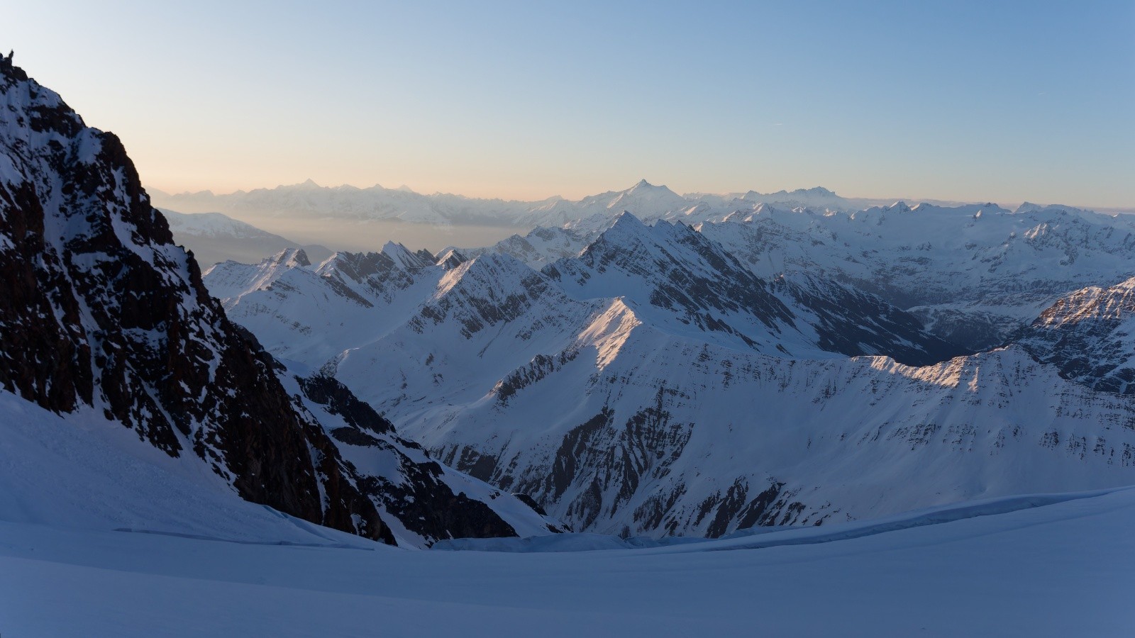 4 heures n'ont pas sonné au clocher du refuge (sans doute car il n'en a pas) que nous voilà partis vers le glacier de la Lex Blanche, qui nous a paru une option plus directe que les couloirs du topo. Le regel est aussi bon que le grip, même si quelques passages raides méritent les couteux. Nicolas fait des merveilles pour se repérer dans la nuit noire et le petit matin et nous louvoyons au mieux entre séracs et crevasses. Belvédère extraordinaire sur les Alpes, des Ecrins au mont Rose, dans une aube qui s'éternise et prend son temps pour déployer ses palettes de couleurs.