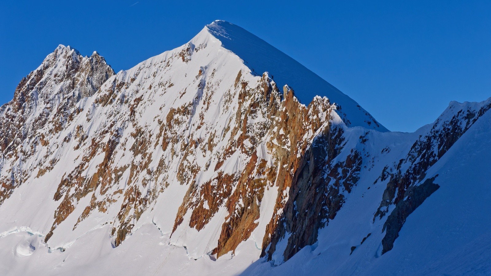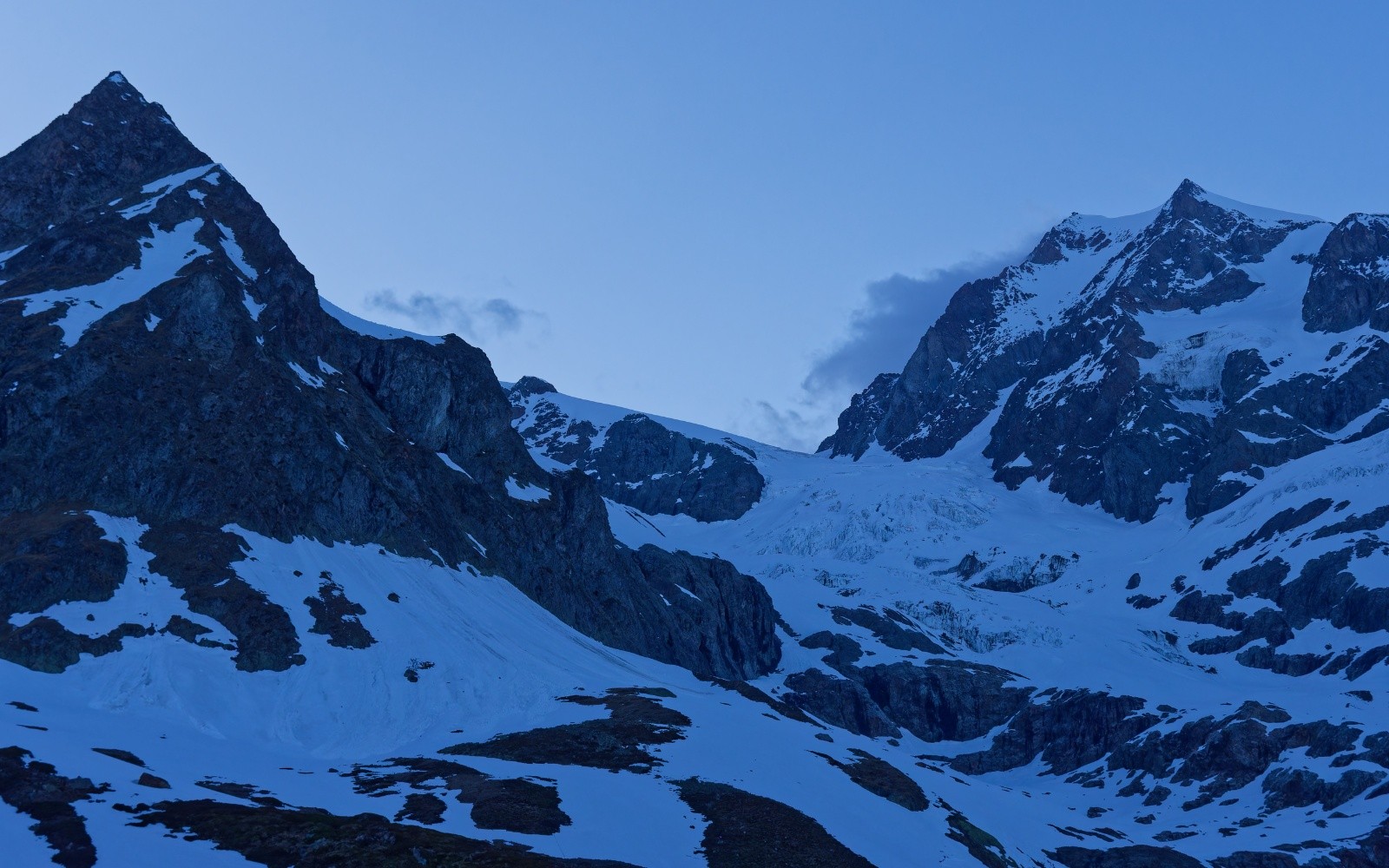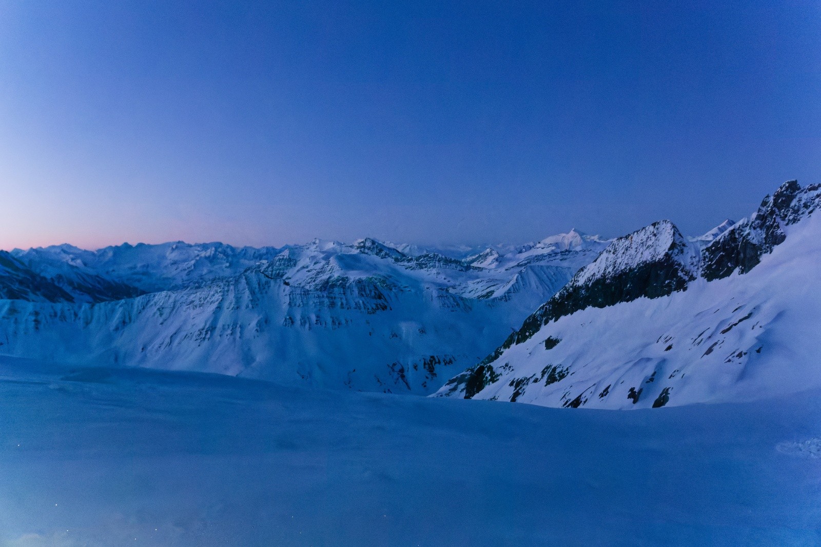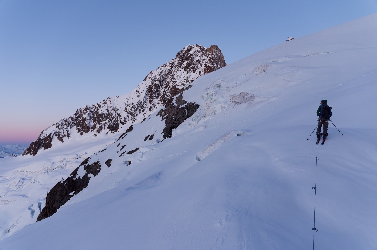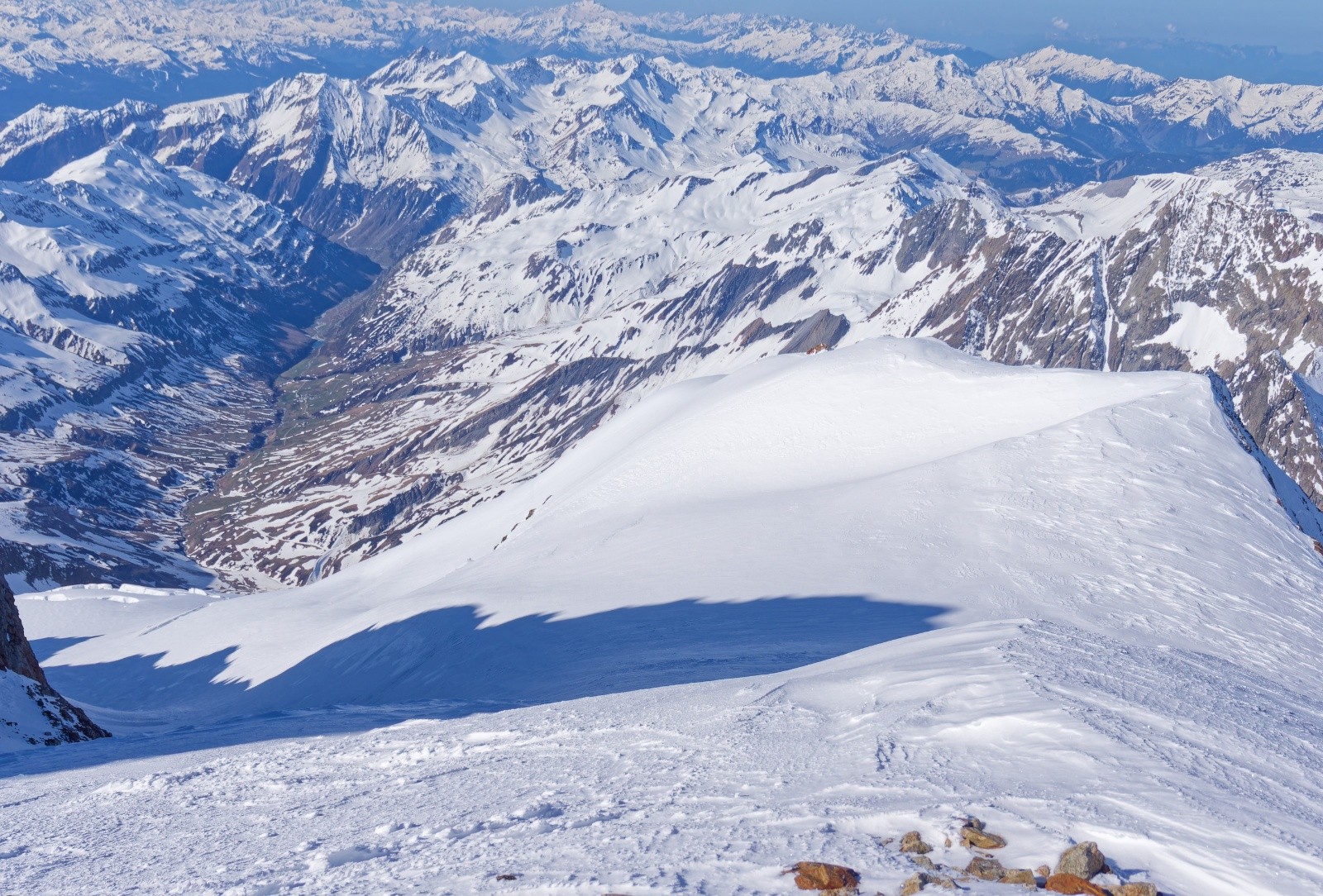4 heures n'ont pas sonné au clocher du refuge (sans doute car il n'en a pas) que nous voilà partis vers le glacier de la Lex Blanche, qui nous a paru une option plus directe que les couloirs du topo. Le regel est aussi bon que le grip, même si quelques passages raides méritent les couteux. Nicolas fait des merveilles pour se repérer dans la nuit noire et le petit matin et nous louvoyons au mieux entre séracs et crevasses. Belvédère extraordinaire sur les Alpes, des Ecrins au mont Rose, dans une aube qui s'éternise et prend son temps pour déployer ses palettes de couleurs.