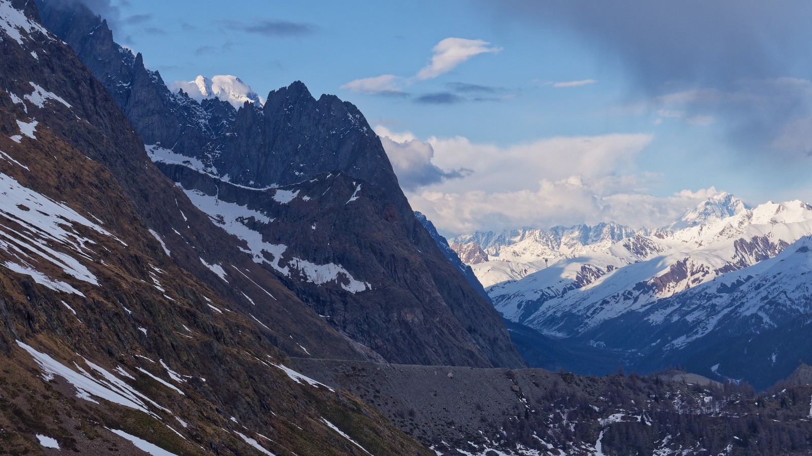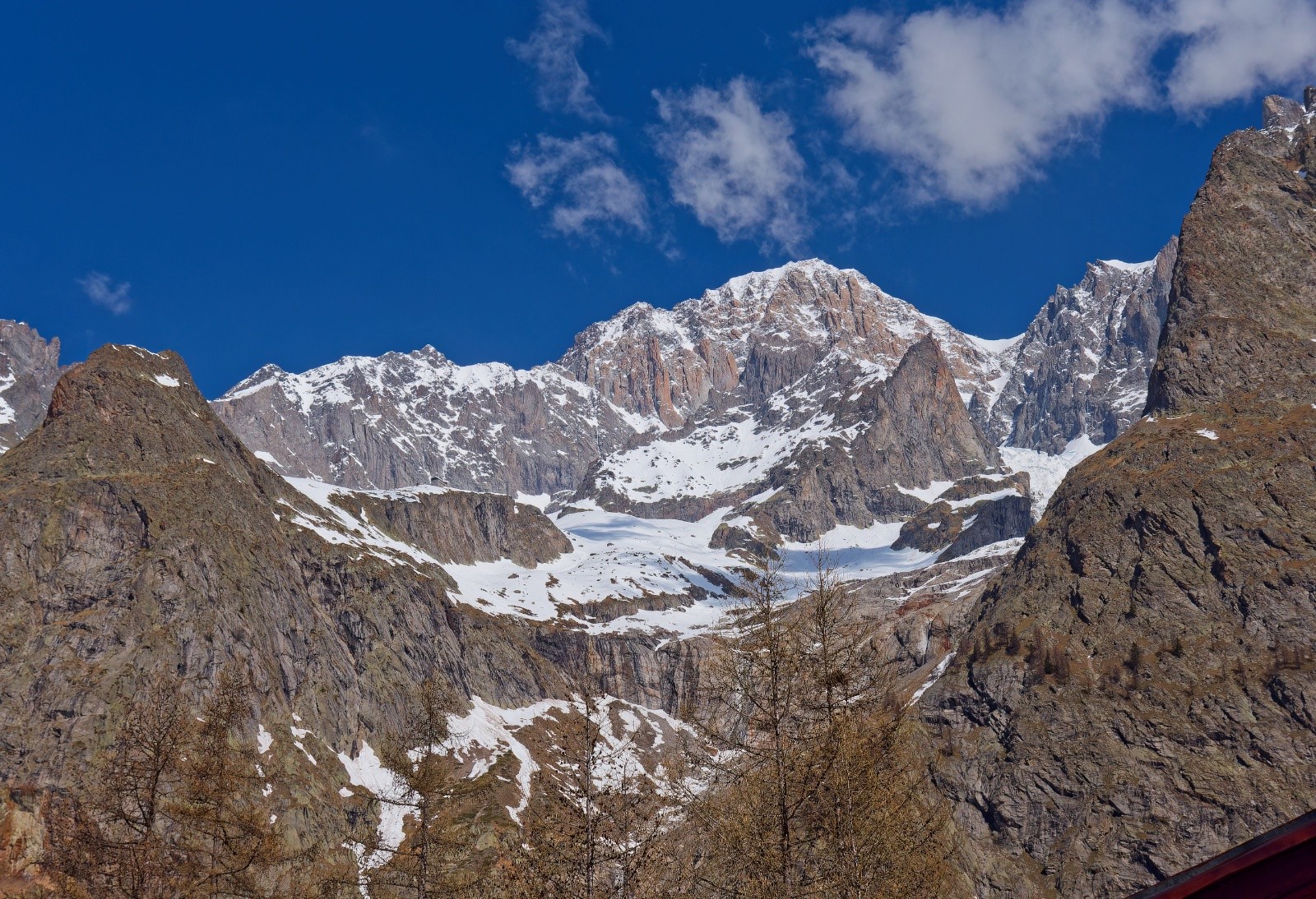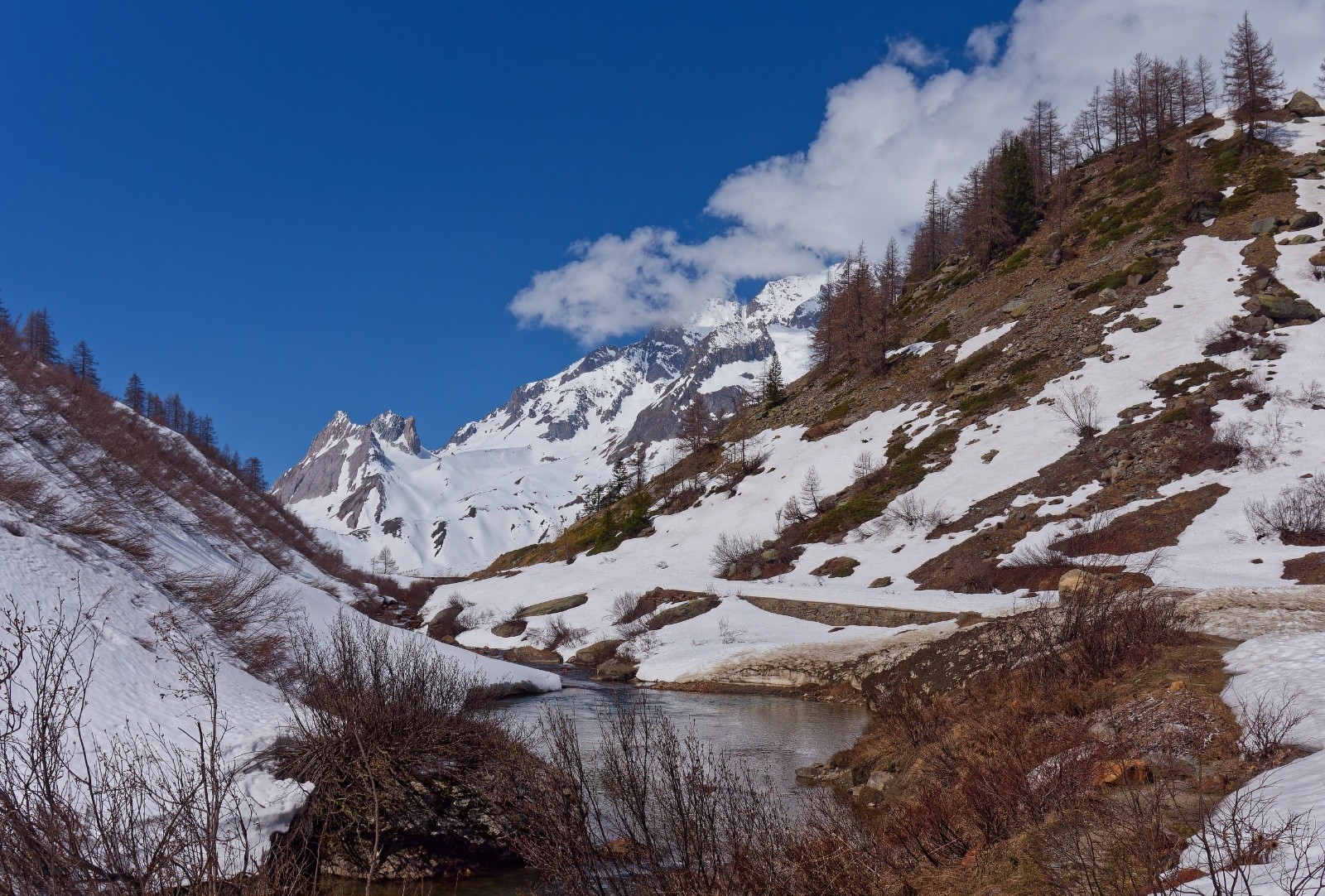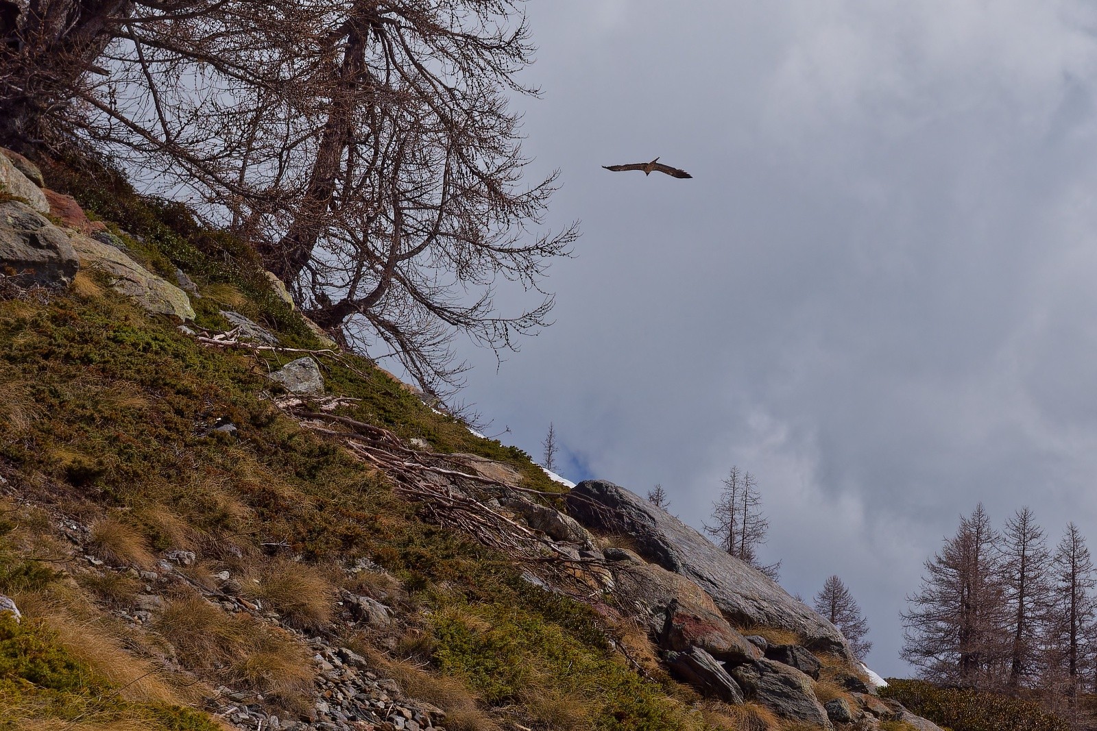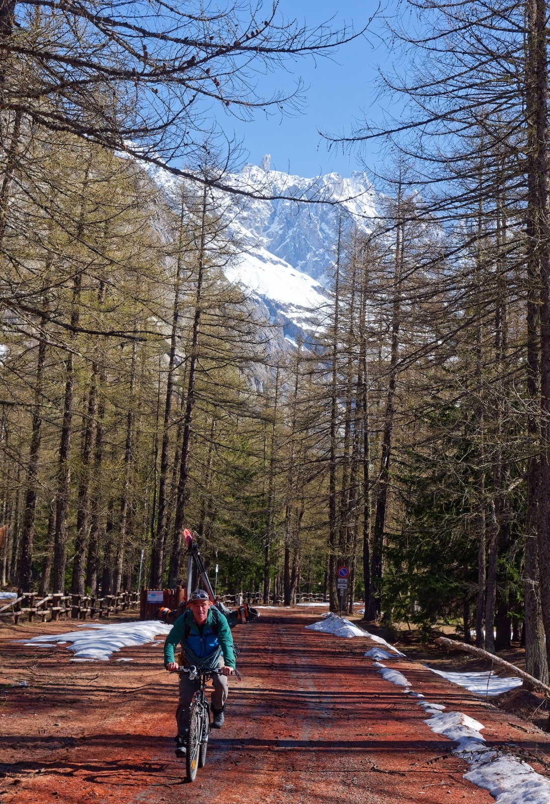 Les VTT étant dans le coffre, nous les enfourchons : las, au bout d'1 km dont 700 m à les pousser dans une neige tendance soupe chaude, nous nous rendons à l'évidence et les laissons au rifugio Monte Bianco, avant de remonter la route plus ou moins enneigée. Ce Val Veny est absolument superbe, sauvage vallon planté de mélèzes surplombés par les gigantesques murailles du versant italien du mont Blanc : Brenva, Brouillard, Fréney... Des traces de (très) gros canidés se font voir, entrecoupés d'ossements régurgités. Nous écarquillons les yeux dans l'espoir d'apercevoir le museau du rusé compère : c'est dans les airs qu'une ombre se déploie soudainement et nous survole à quelques mètres. Envergure immense, jabot jaune : c'est un gypaète ! Voilà qui vaut bien le gros toutou.