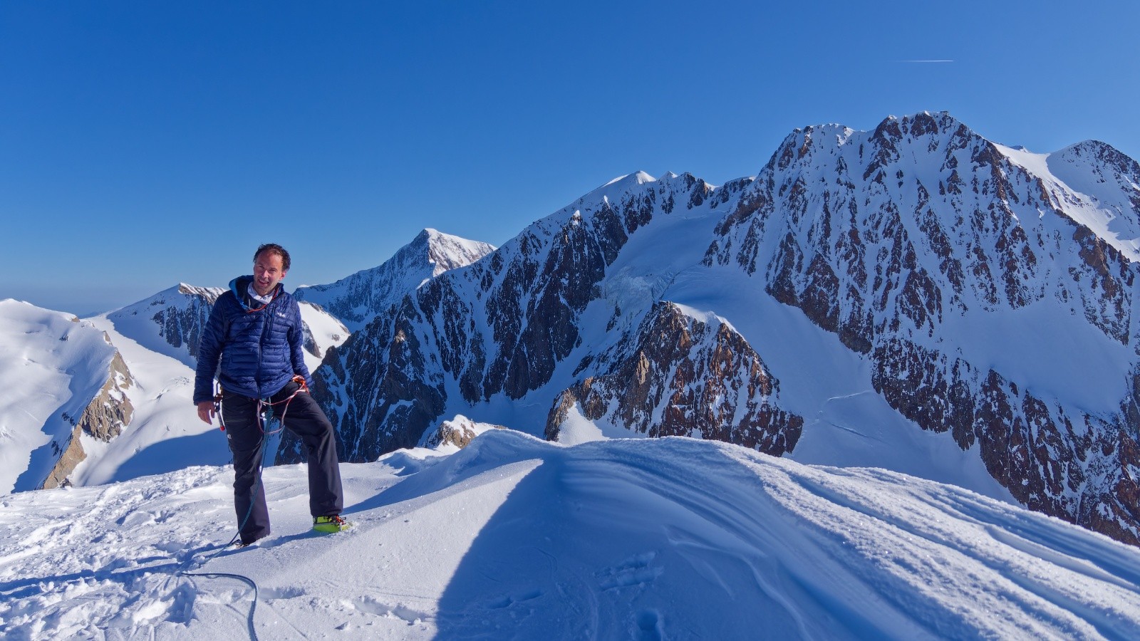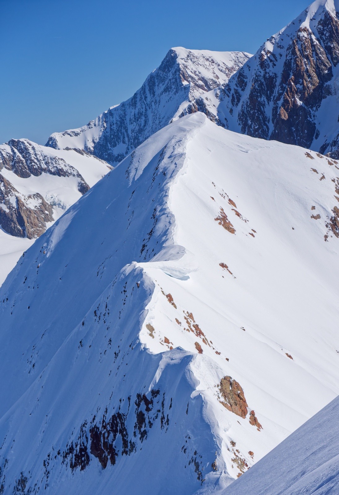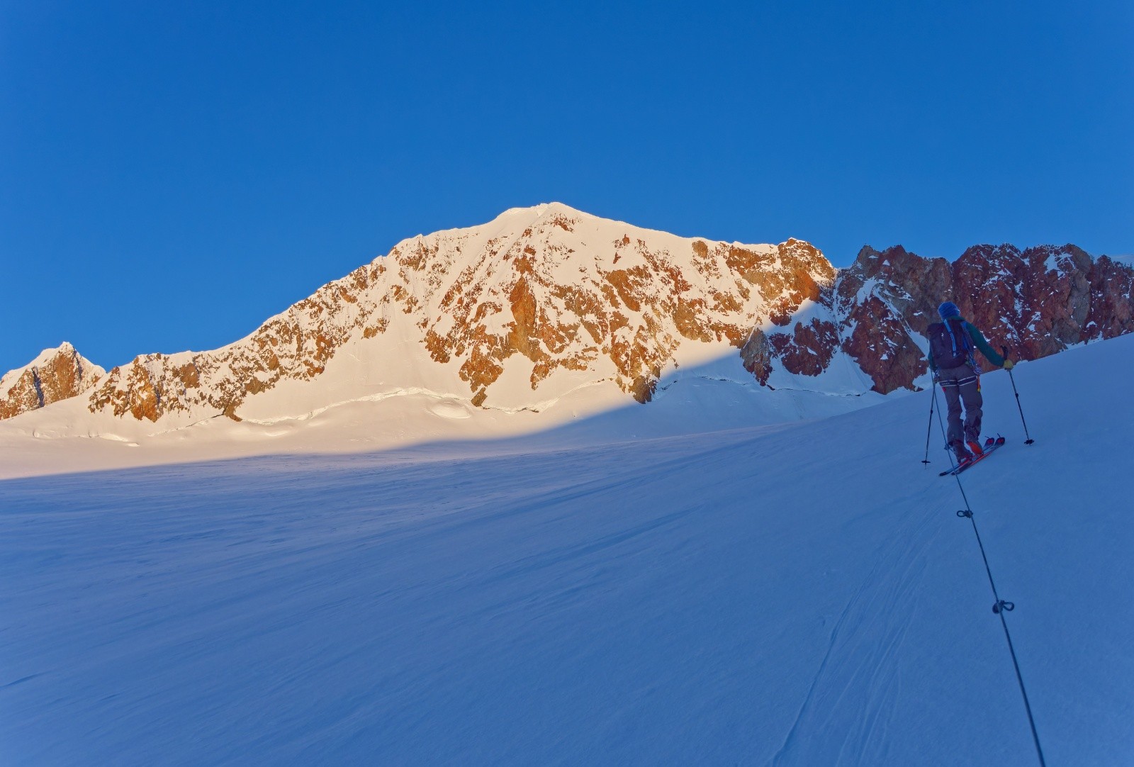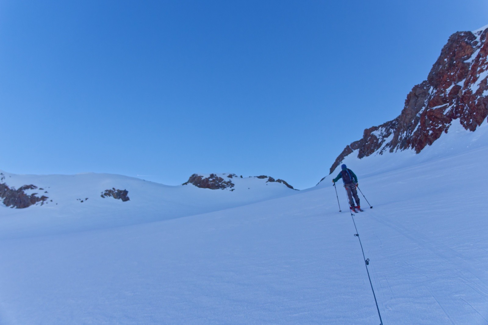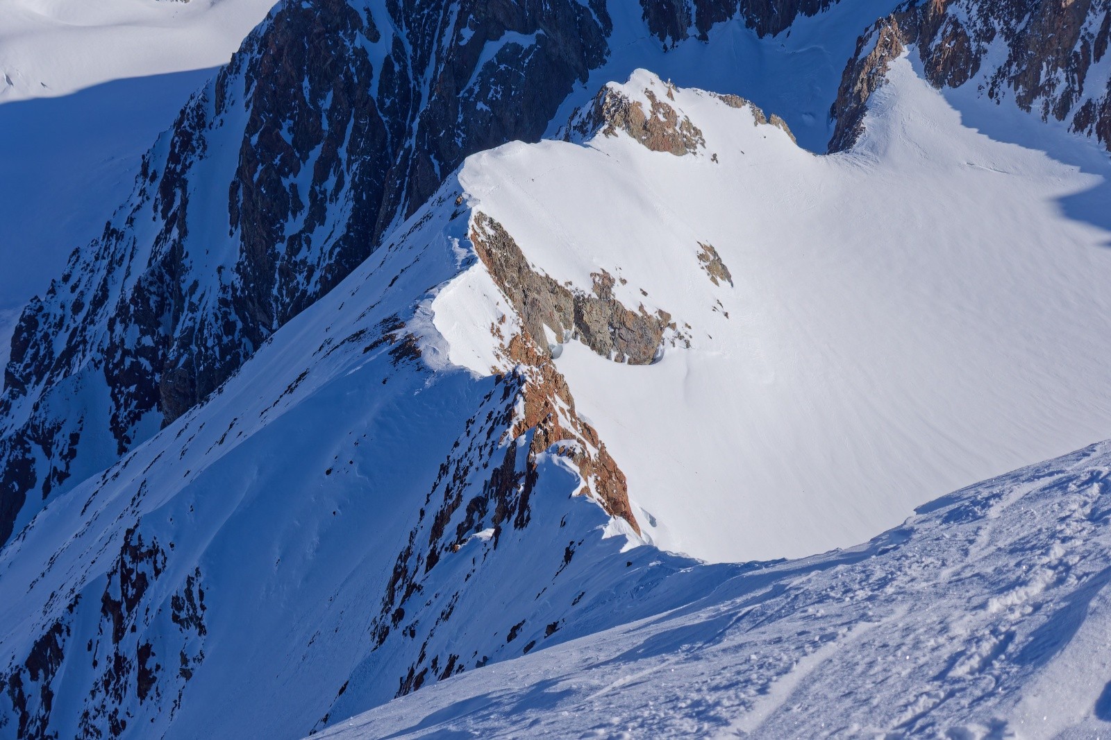 Conditions pour le ski : Très bon regel, bon grip sur le glacier de la Lex Blanche, neige bien portante et sécurisante sur l'arête et en-deça, glacier des Glaciers pas encore à point, neige très lourde après les Pyramides Calcaires