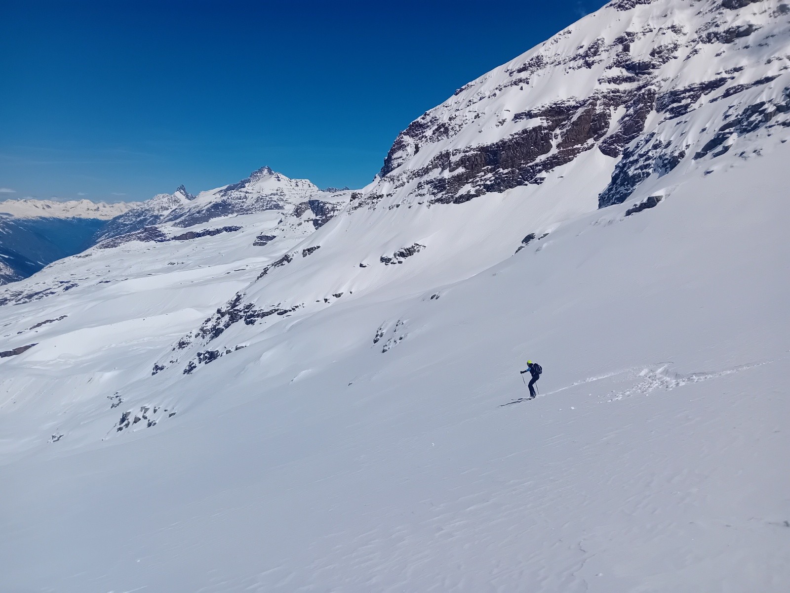 Traversée vers le fond du vallon : poudre tassée, croûte ou dure.