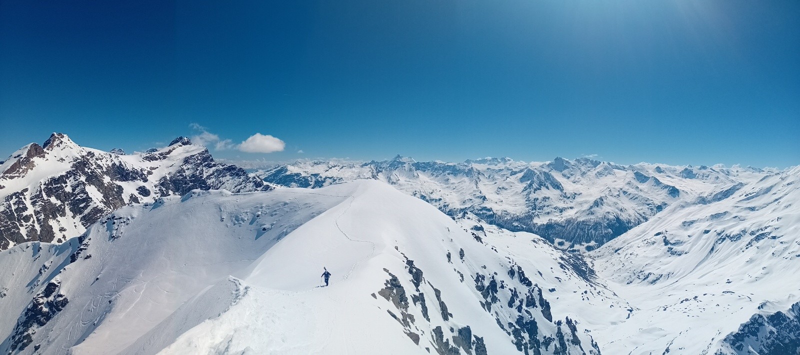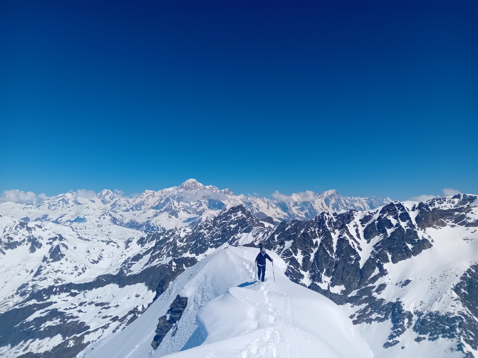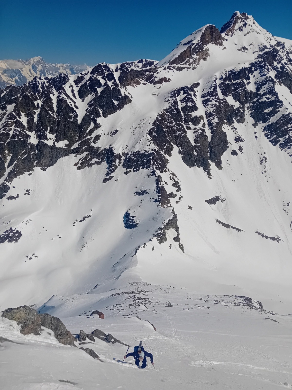 Le plan A était la rive droite du Valgrisenche depuis Uselliere mais la route est encore fermée après Bonne (barrière ouverte mais travaux en cours et rapidement un arbre en travers). Heureusement, on avait un plan B et même plan C. Finalement, on a bien su adapter le programme. Un petit portage dans les champs de crocus . Secteur peu fréquenté, on a vu plus de marmottes que de skieurs.