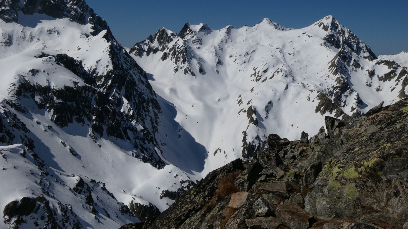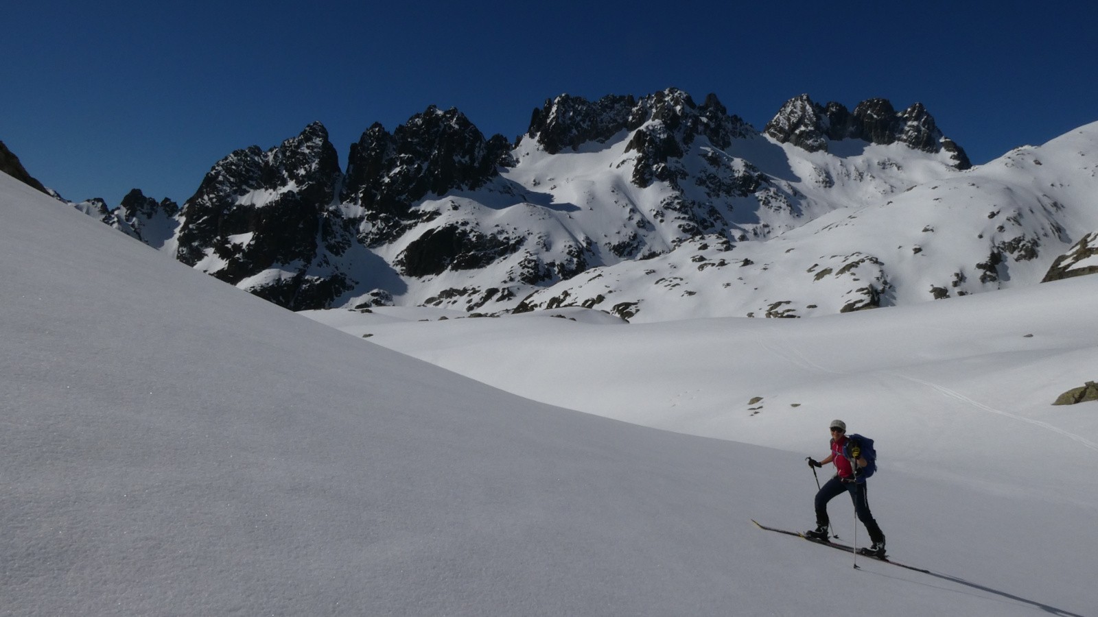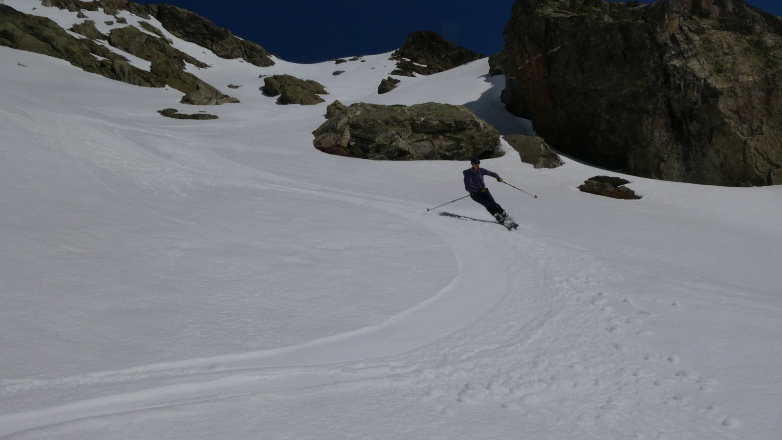 Mais il n'y eut pas que les paysages, il y eut des sensations de plénitude quand sous nos skis, le velours se déroula en qualité supérieure quasiment sans défaut jusqu'au déchaussage au milieu des fleurs qui ne demandaient qu'une chose : « ne marchez pas sur moi ! » . A part, 2 ou 3 sérials skiers qui faisaient solitairement leurs gammes, tous ces vastes espaces étaient pour nous seules.