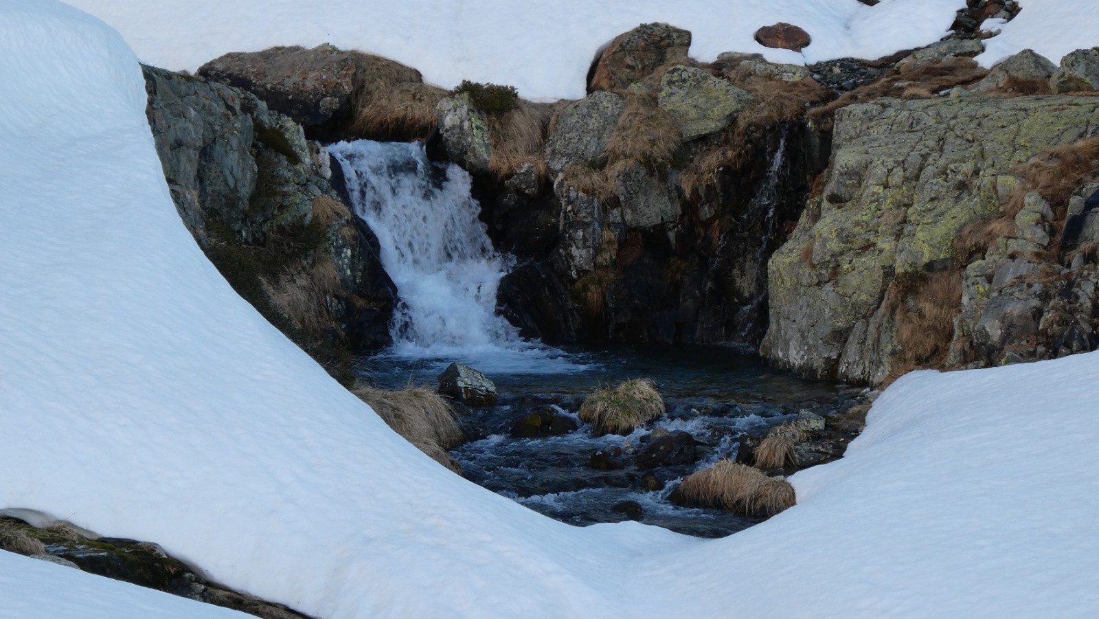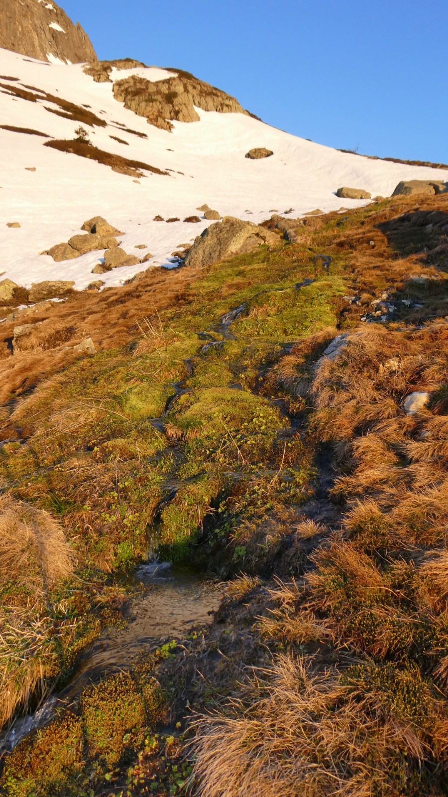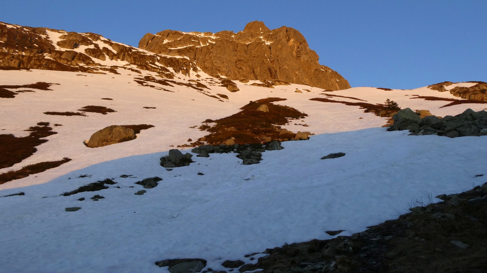 La lumière du jour nouveau nous a cueillies au début du Plan des Trois Eaux. L'or et le cuivre ont coulé des Têtes des Cos, l'argent de la petite cascade. Et la neige était là. Encore immaculée, quasi intouchée, si ce n'est par quelques marques de sabots d'ongulés, de griffes de marmottes et quelques vestiges de traces de skieurs. On devinait les bouquetins sur les pelouses de la rive G.