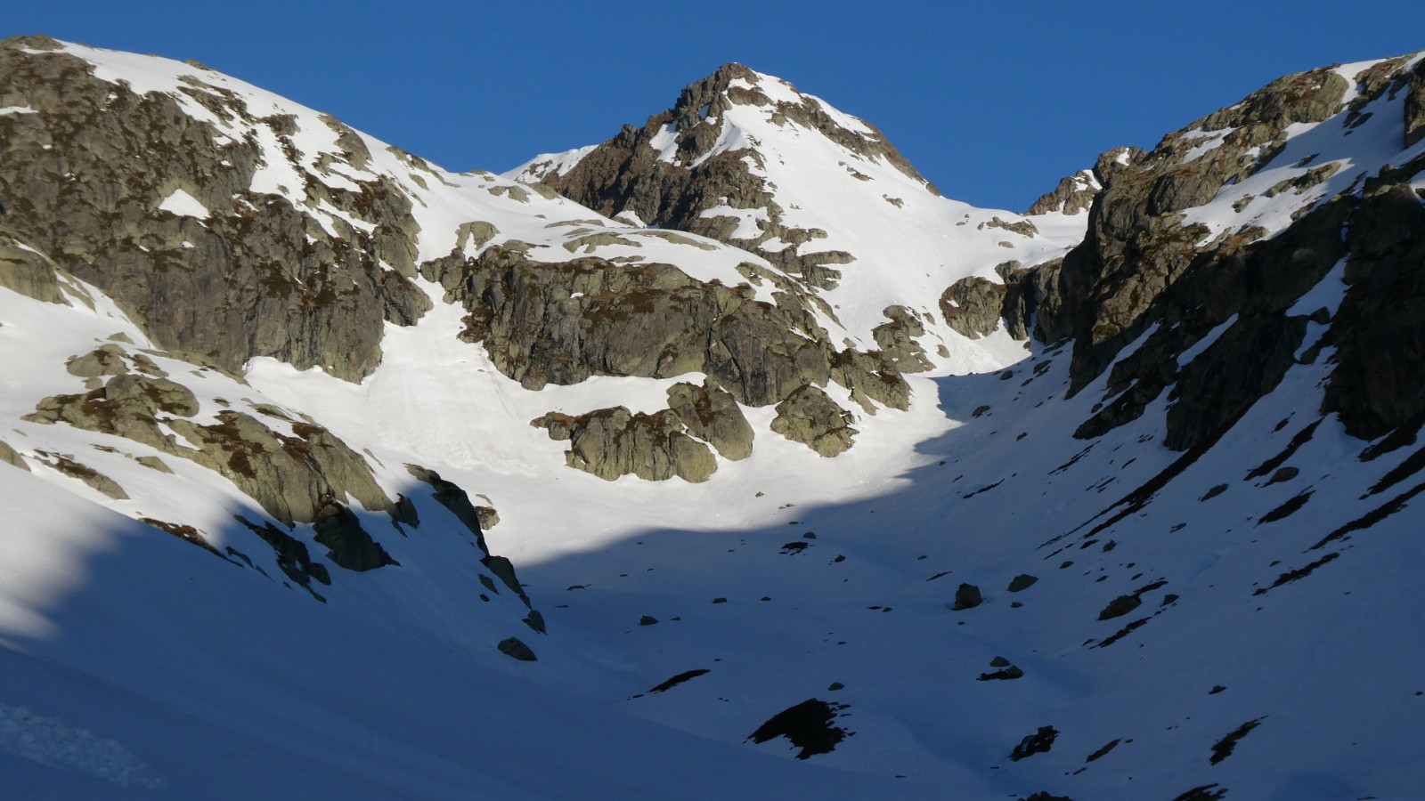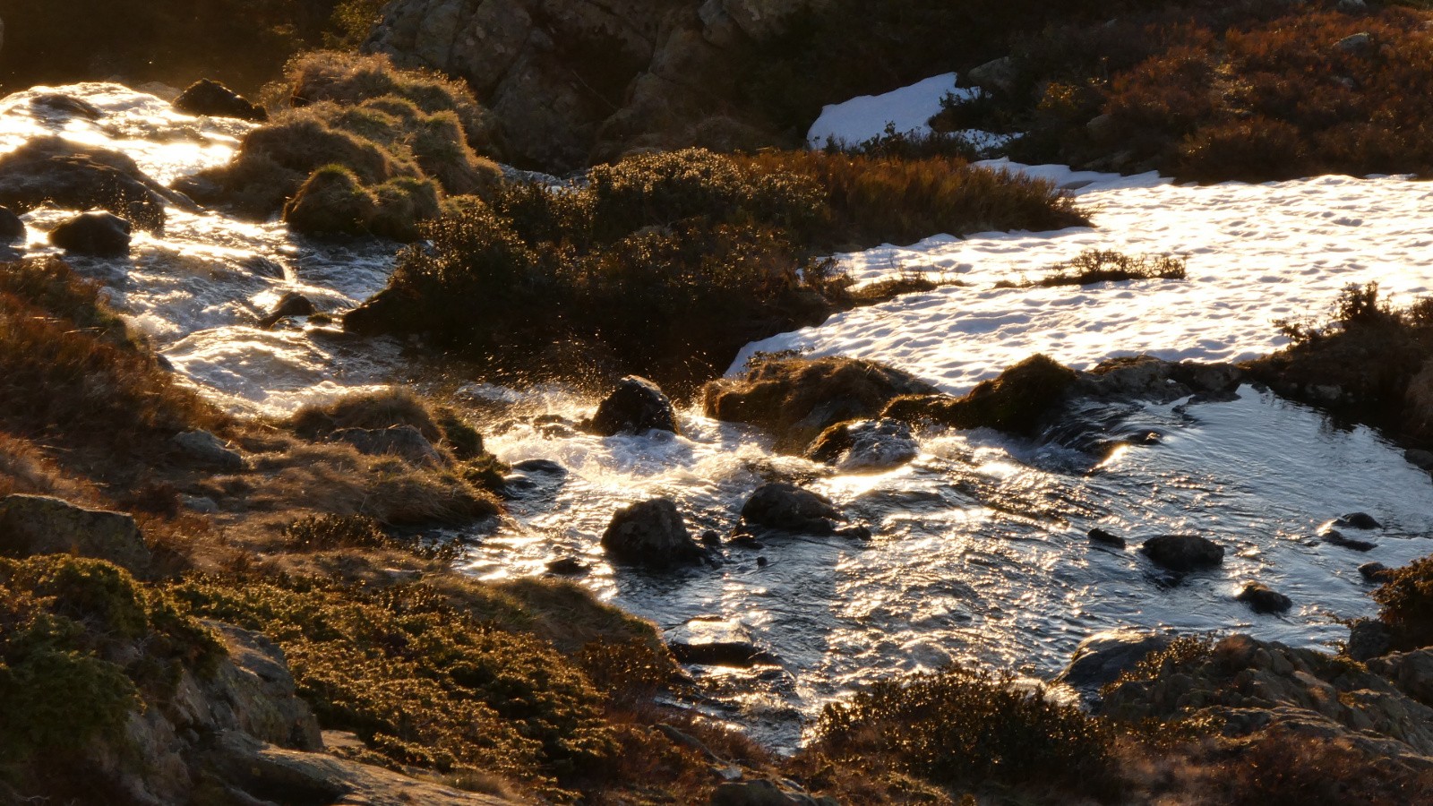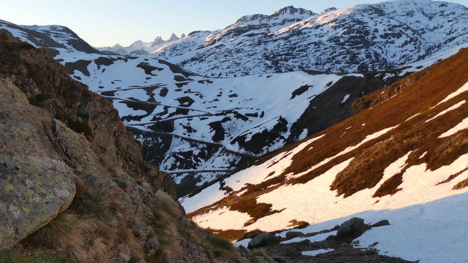 La lumière du jour nouveau nous a cueillies au début du Plan des Trois Eaux. L'or et le cuivre ont coulé des Têtes des Cos, l'argent de la petite cascade. Et la neige était là. Encore immaculée, quasi intouchée, si ce n'est par quelques marques de sabots d'ongulés, de griffes de marmottes et quelques vestiges de traces de skieurs. On devinait les bouquetins sur les pelouses de la rive G.