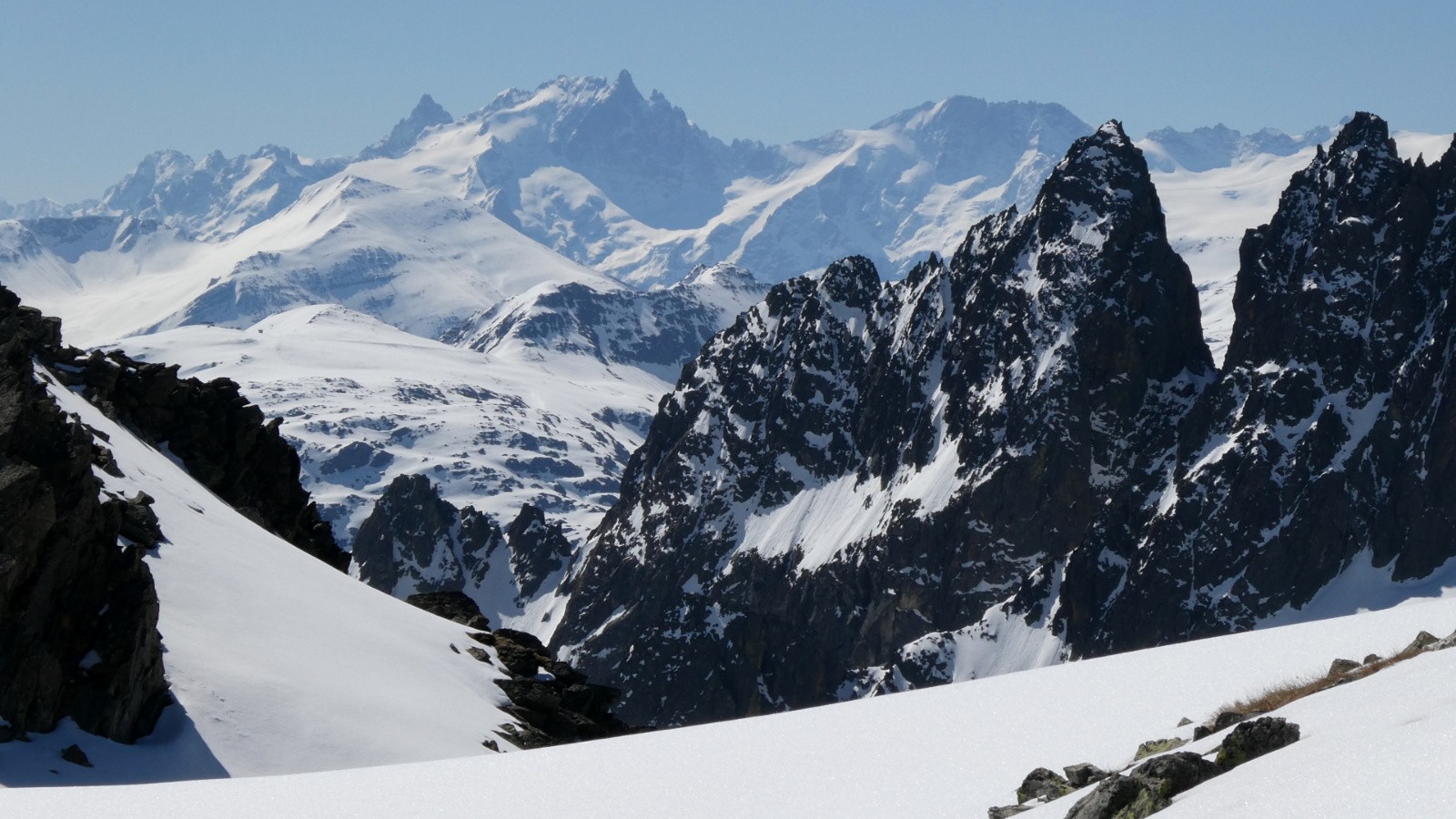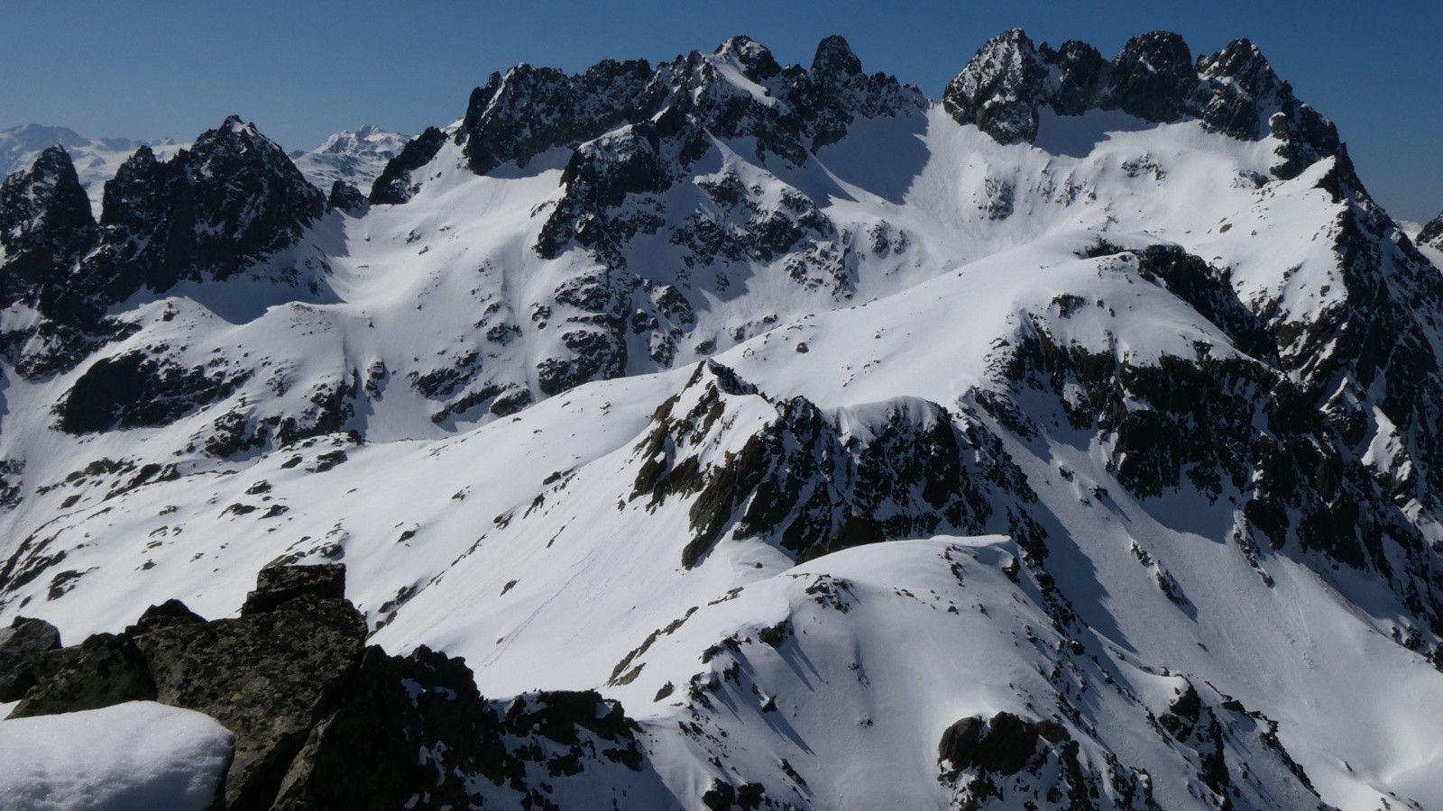 Devant le verrou, comme dit, chacune s'y prend comme elle le sent et le gentil obstacle est vite franchi. De là, le col de la Croix est quasiment atteint. Il ne ferait pas bon descendre le versant W à cette heure (9h15 env), c'est encore bétonné. Restons donc sur cet aimable versant E. Le lac est encore gelé, aucune amorce de débâcle. Le site est charmant cependant. On hésite entre Sambuis et crête S du Bec d'Arguille. Cette dernière, que Laurence ne connaît pas, l'emporte. Il faut dire qu'aujourd'hui, nous avons davantage envie de musarder que d'outrepasser l'humain. La journée s'y prête bien. Plus on monte, plus le paysage s'ouvre et quand nous arrivons à l'éminence que nous avions en ligne de mire pour aller admirer le Bec d'Arguille, le spectacle danse une ronde majestueuse autour de nous. Laissons parler les images.