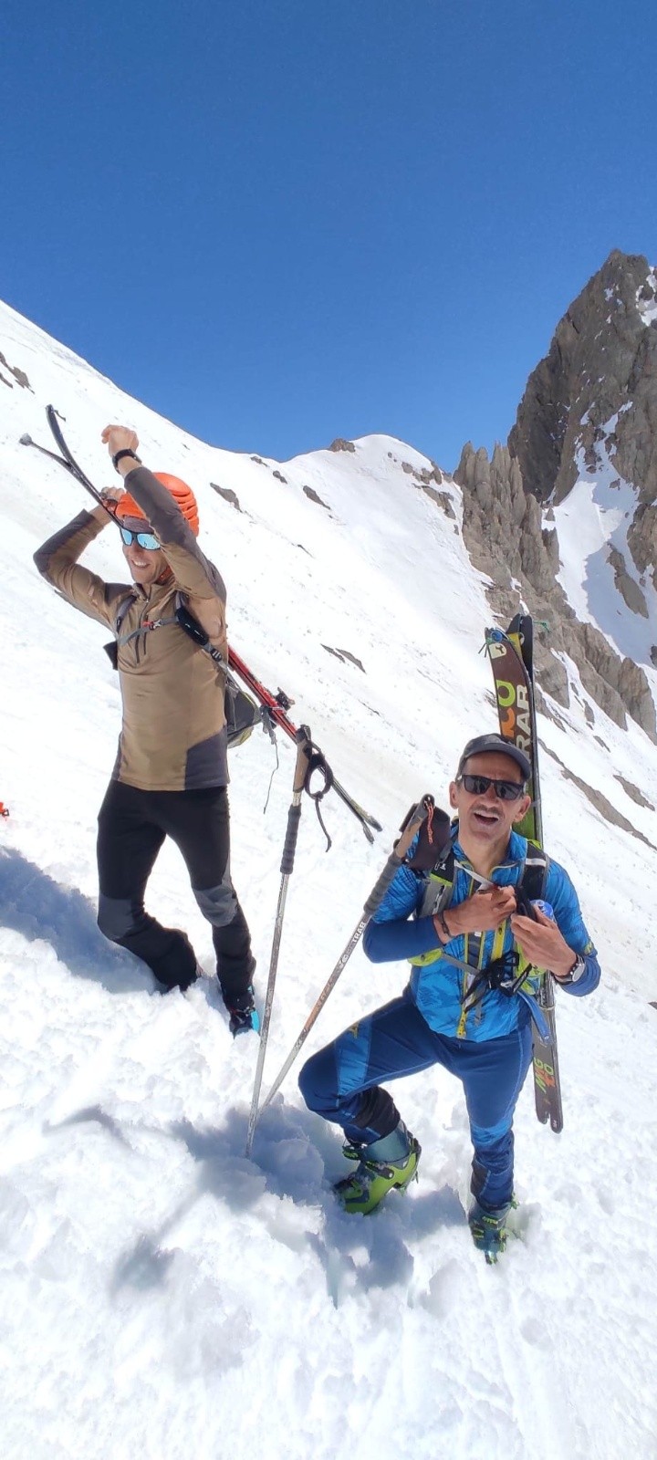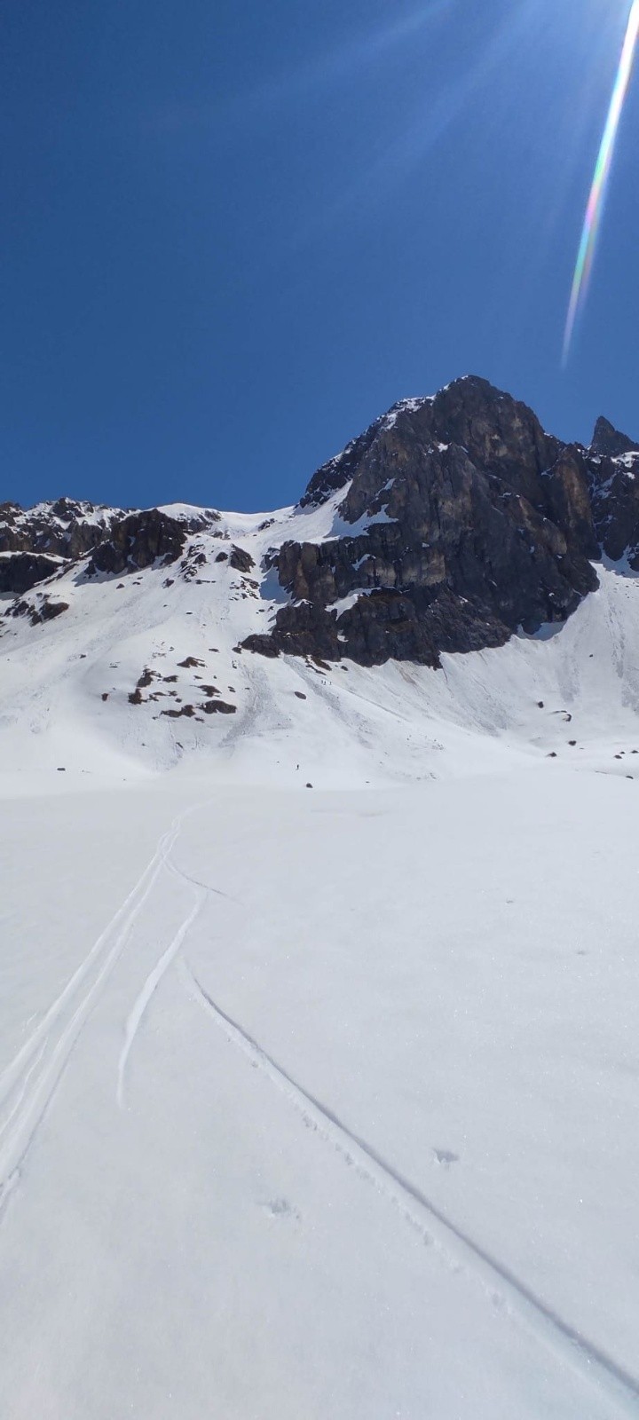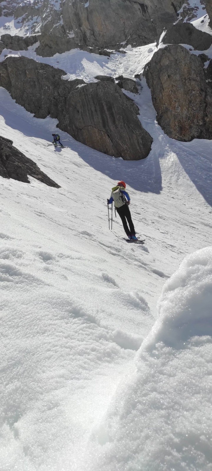 Côté Savoie, neige dure montée comme descente, notamment dans la boîte aux lettres avec son côté spéléologie (faite à la montée). A la descente pour l'éviter nous sommes descendus plus à gauche. Mais un petit couloir bien raide et exposé nous y attendait sur une neige béton. On a serré les fesses.
