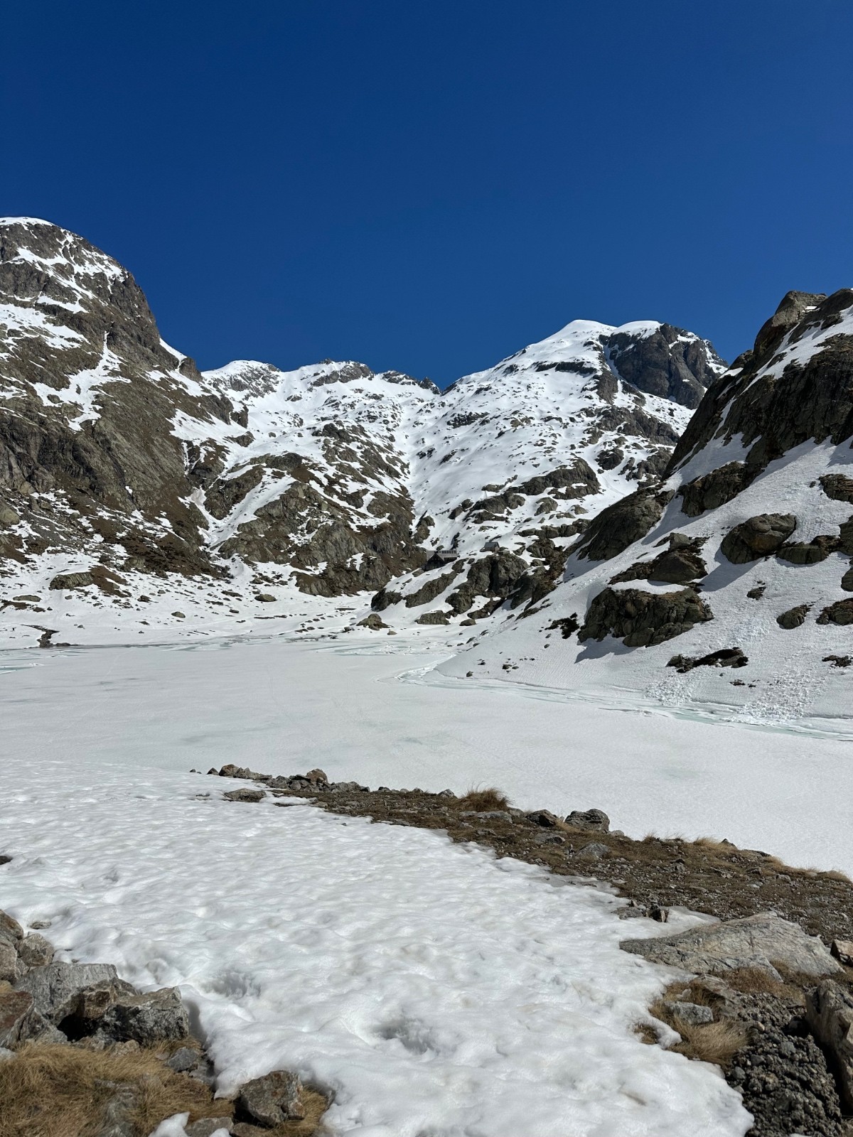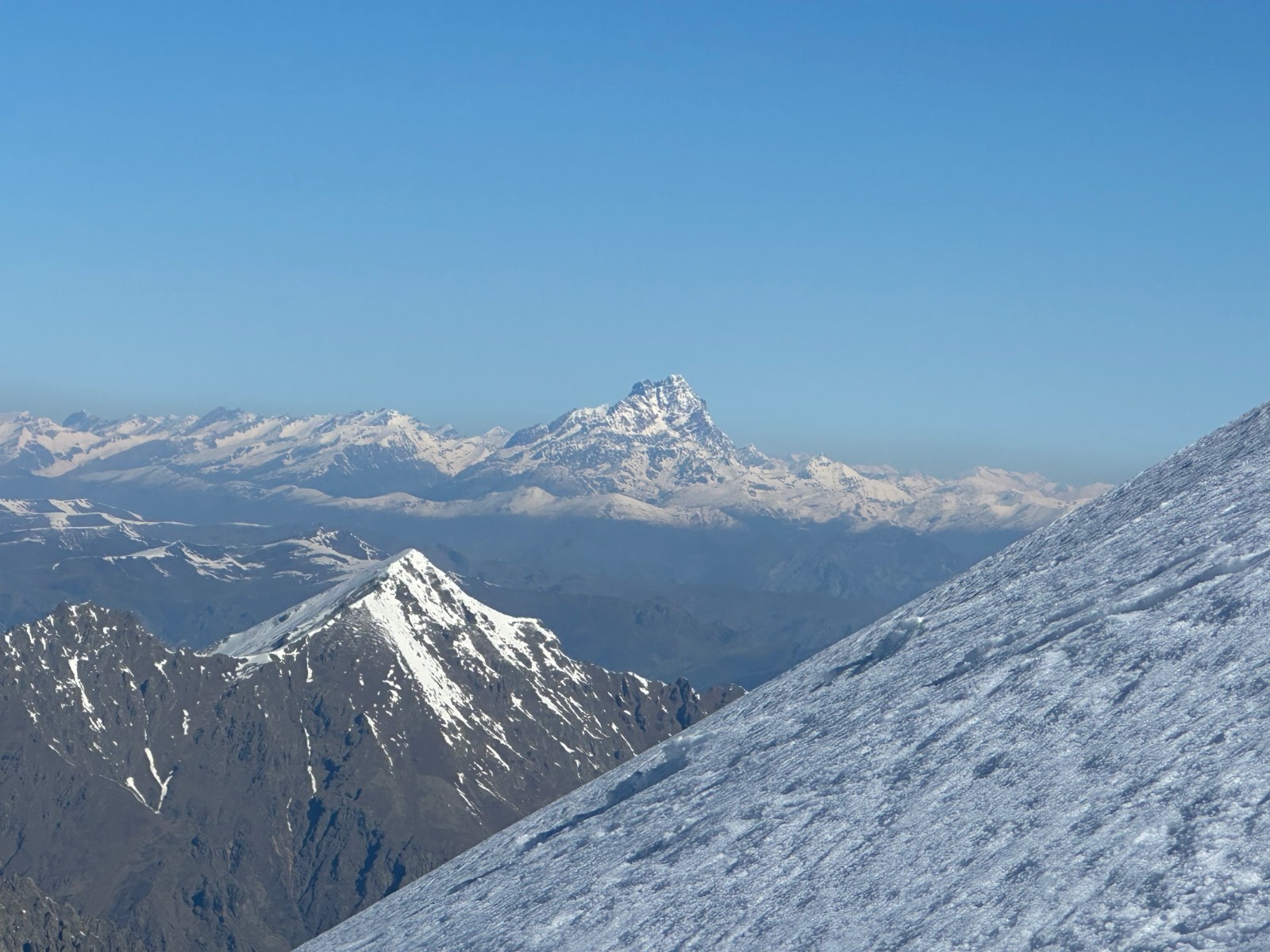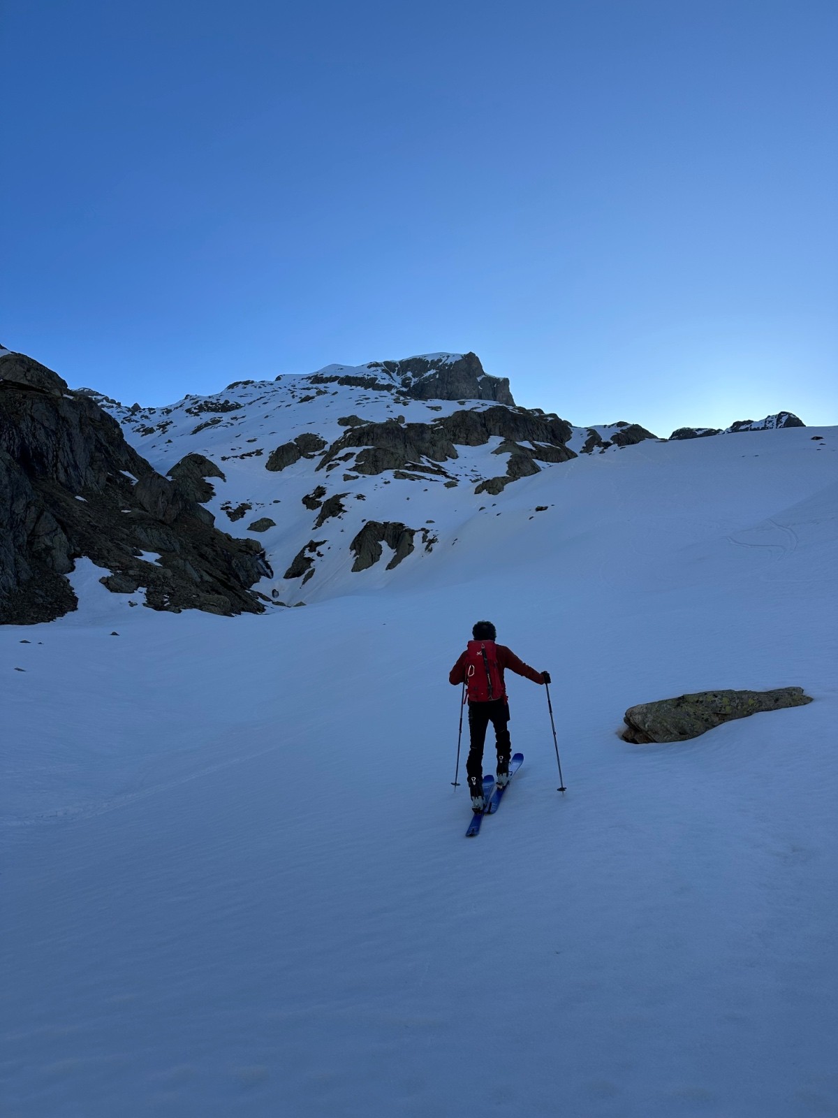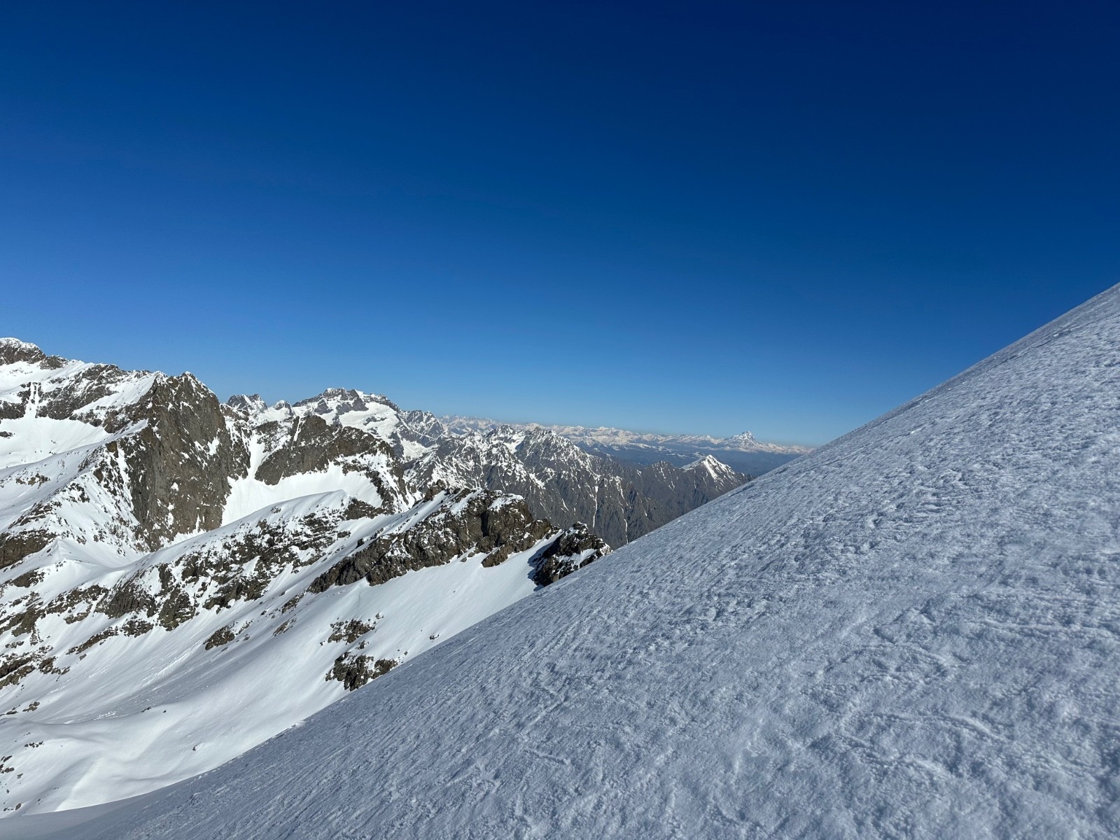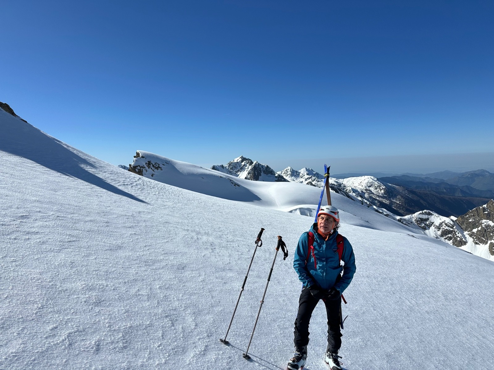 Il y en a pas mal qui ont trouvé des excuses pour ne pas venir avec Philippe et moi. Lever très matinal, portage d’une bonne heure à l’aller et au retour mais du bonheur quand même à parcourir cet itinéraire classique en Gordolasque. C’était d’ailleurs le projet principal : celui de faire une dernière sortie dans cette magnifique vallée cette saison. Les marmottes sont de sorties et pas mal de bouquetins et chamois également, par contre très peu de skieurs. Un seul croisé au sommet, d’où on n’a vu personne sur le Gelas. Son couloir est pourtant bien plein. Itinéraire suivi : classique en louvoyant sur les pentes terminales avec les crampons au pied.